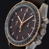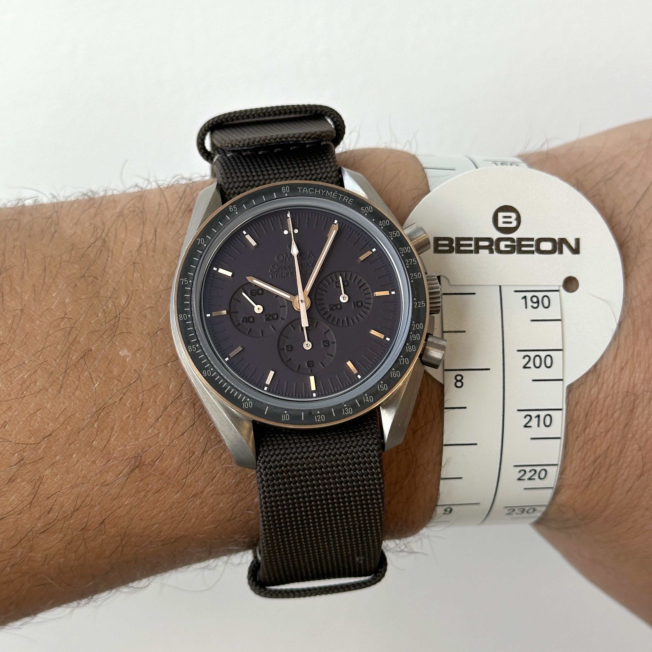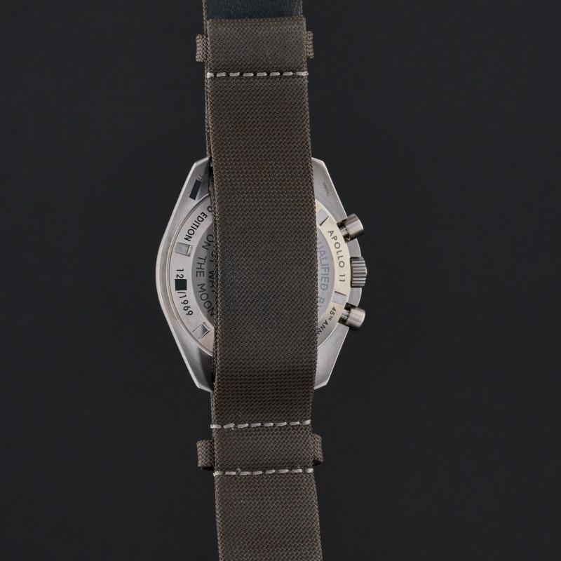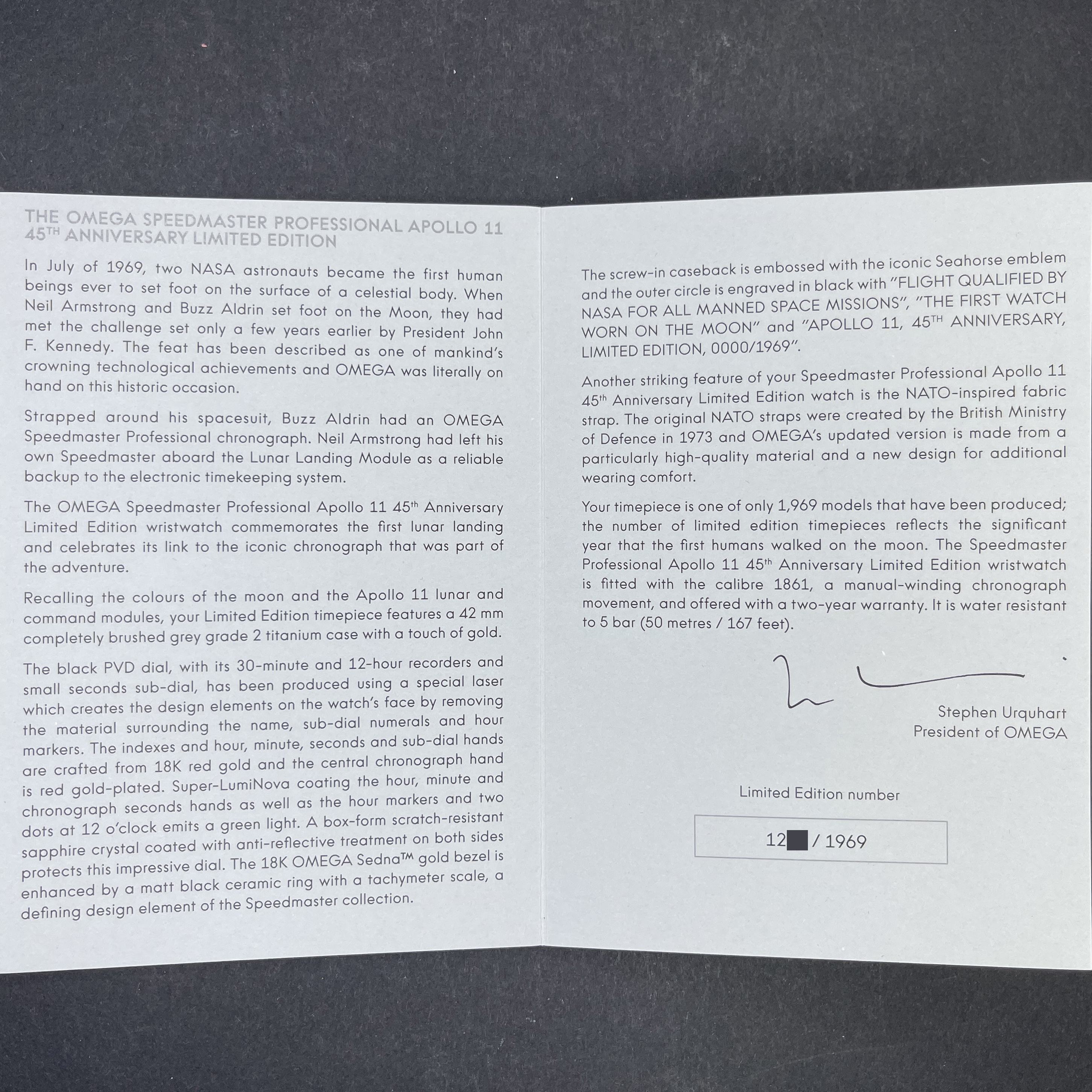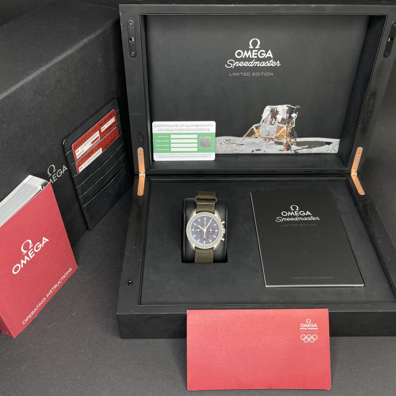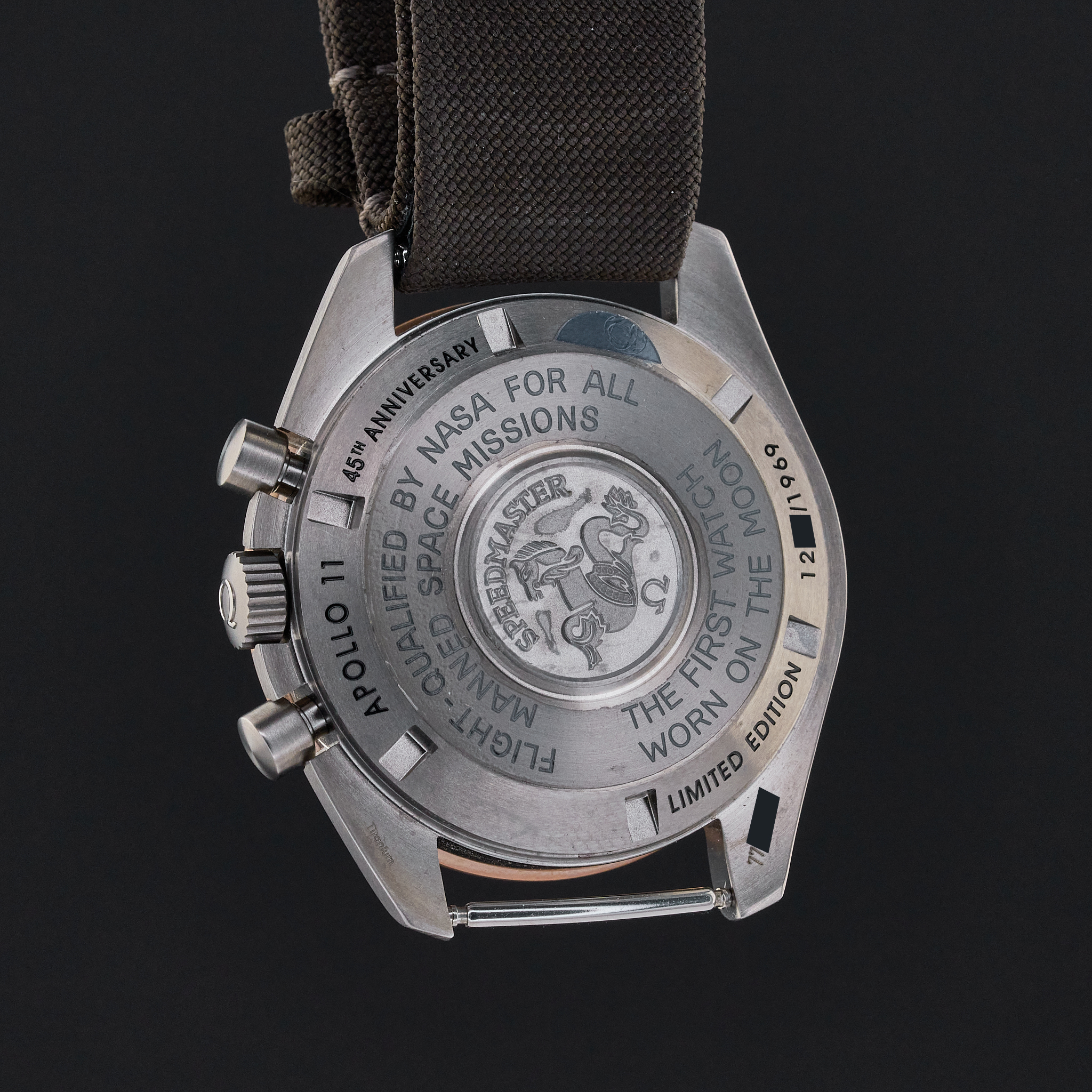 Introducing the OMEGA Speedmaster Professional Apollo 11 45th Anniversary Limited Edition wristwatch, a remarkable timepiece commemorating the first lunar landing and celebrating its enduring connection to space exploration. This watch, limited to just 1,969 pieces, honors the Apollo 11 mission with an innovative design and meticulous craftsmanship. The 42 mm case, made from lightweight grade 2 titanium, pays homage to the titanium ore found on the moon’s surface, providing a robust yet lightweight feel on the wrist. The brushed finish of the titanium case adds a contemporary aesthetic, while the 18K OMEGA Sedna gold bezel introduces a touch of elegance. This luxurious bezel is complemented by a matte brown ceramic ring featuring the iconic tachymeter scale—a hallmark of the Speedmaster collection. The grey PVD dial, produced using a special laser technique that removes material surrounding the design elements, creates a striking and unique face for this commemorative watch. The dial features three sub-dials: a 30-minute recorder, a 12-hour recorder, and a small seconds sub-dial. The watch is presented on a brown-coated nylon fabric NATO strap, inspired by the rugged straps used on military watches since the Second World War. This choice of strap not only enhances the vintage appeal of the watch but also ensures durability and comfort, suitable for everyday wear. The earthy brown tones of the strap and grey dial, combined with the brushed titanium and touches of gold, evoke the colors of the moon and the lunar and command modules. At its heart, the watch is powered by the OMEGA calibre 1861, an evolution of the calibre 861 that was used in many previous Moonwatch models. This movement, now upgraded with rhodium plating for improved corrosion resistance. The OMEGA Speedmaster remains the only flight-qualified watch that meets NASA's rigorous requirements for Extravehicular Activity (EVA), outperforming quartz watches with LCD displays that are prone to failure due to extreme temperature changes in space. The OMEGA Speedmaster Professional Apollo 11 45th Anniversary Limited Edition is more than just a watch—it is a tribute to human achievement and the pioneering spirit of space exploration.