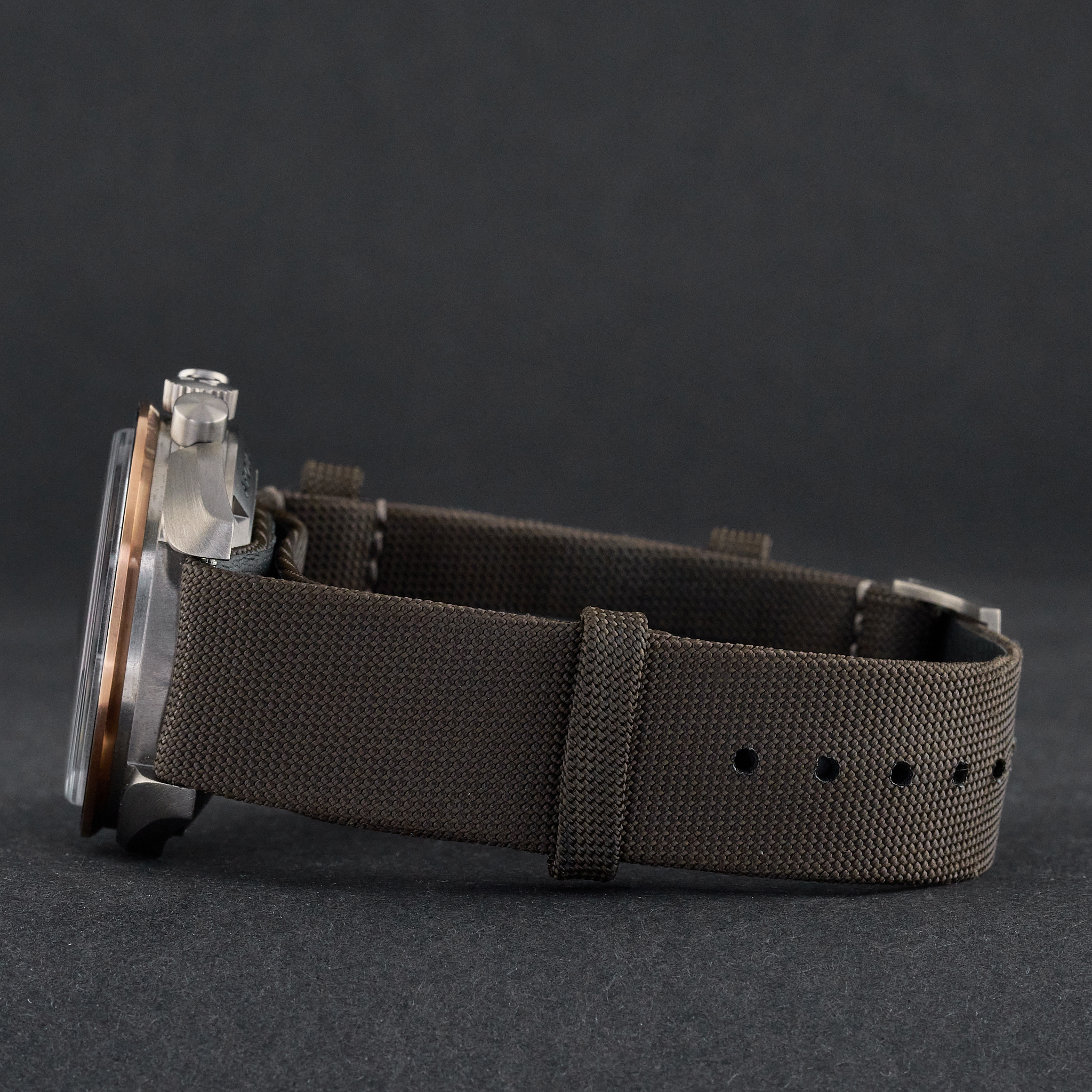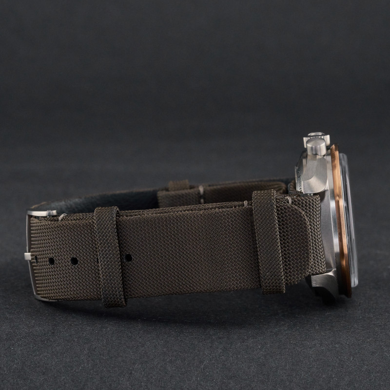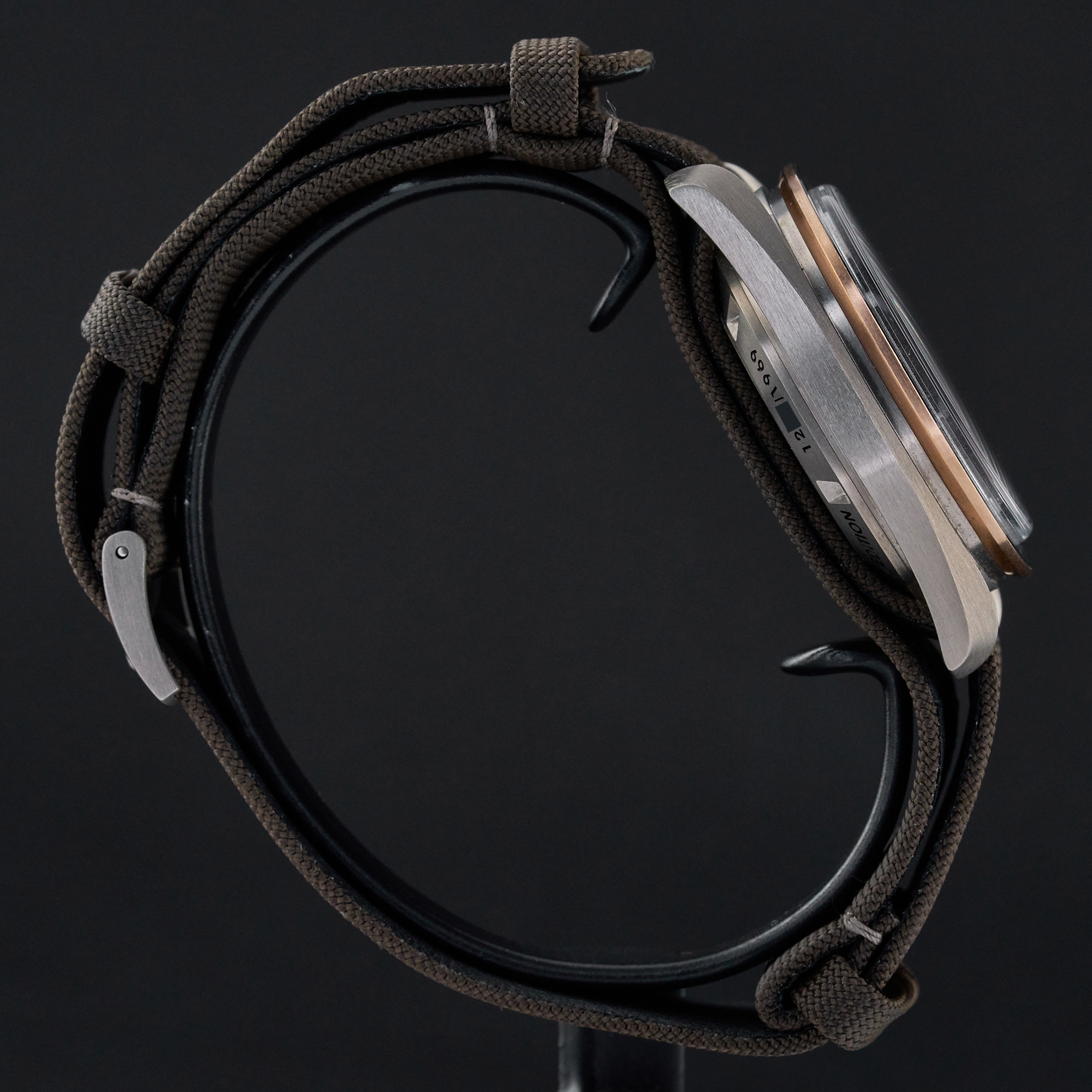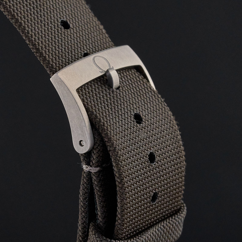 Bracelet: The watch is presented on an original "Omega" brown-coated nylon fabric NATO strap around 26 cm including the watch case, with “Omega” logo clasp.