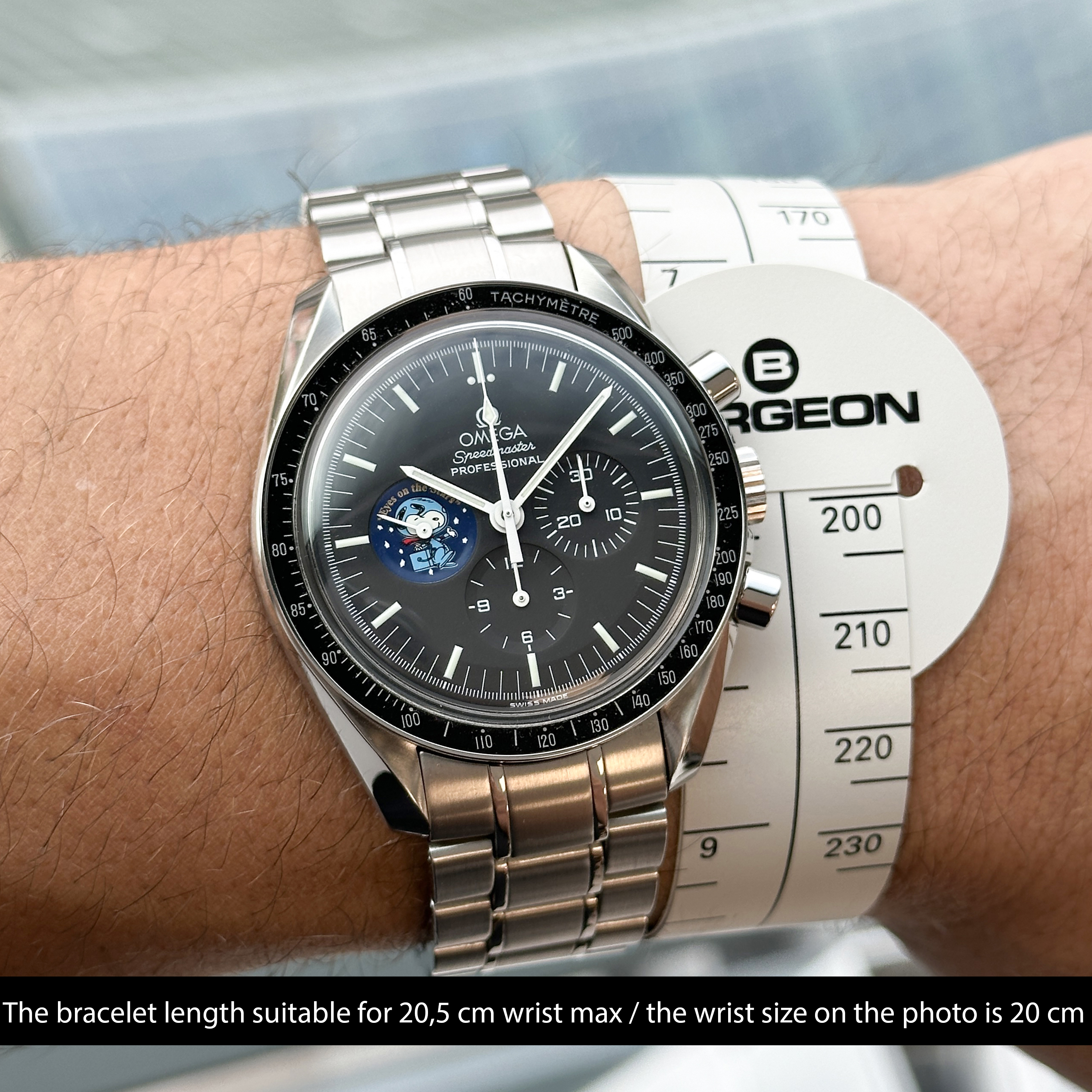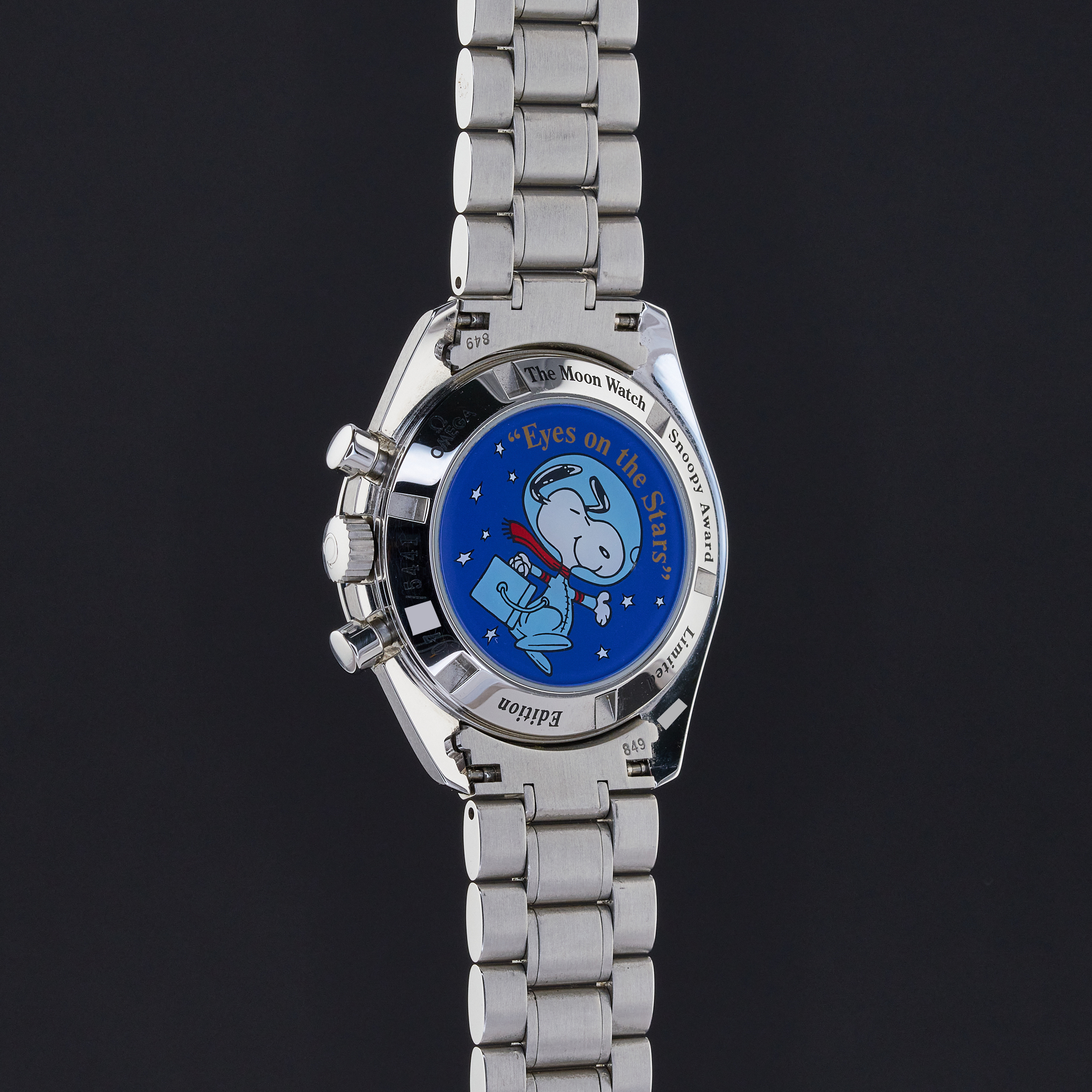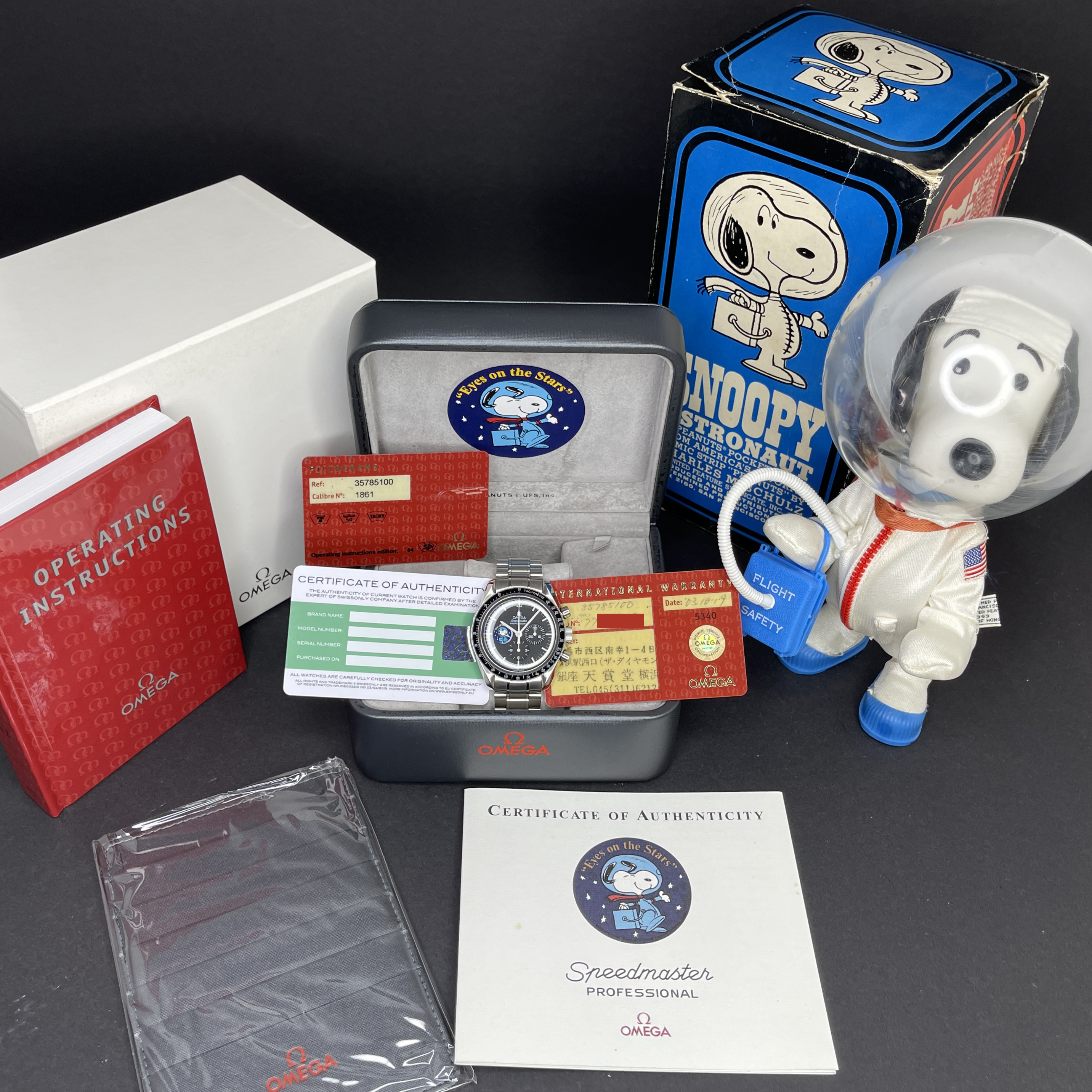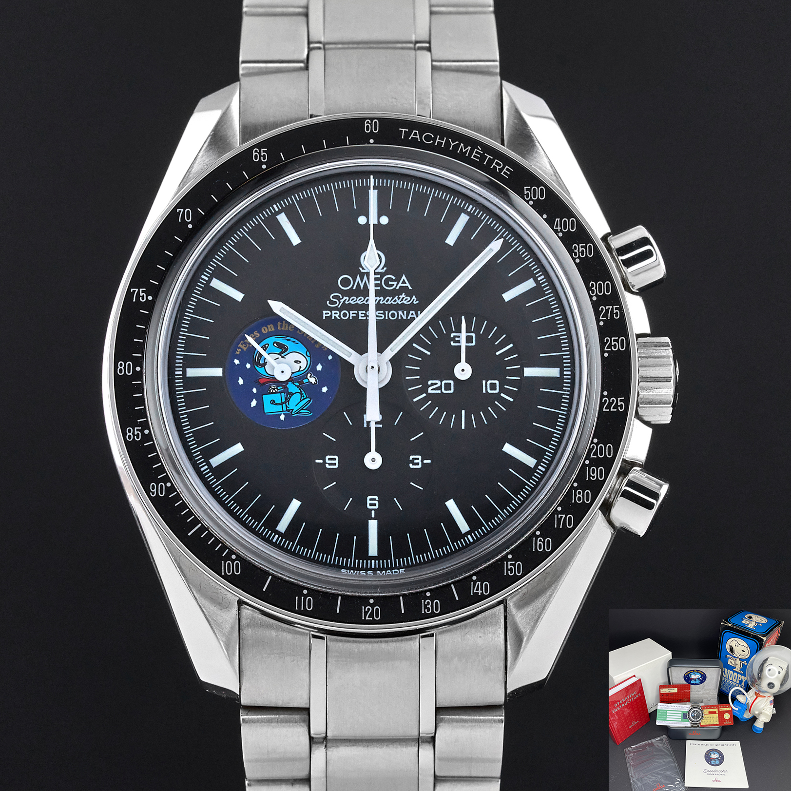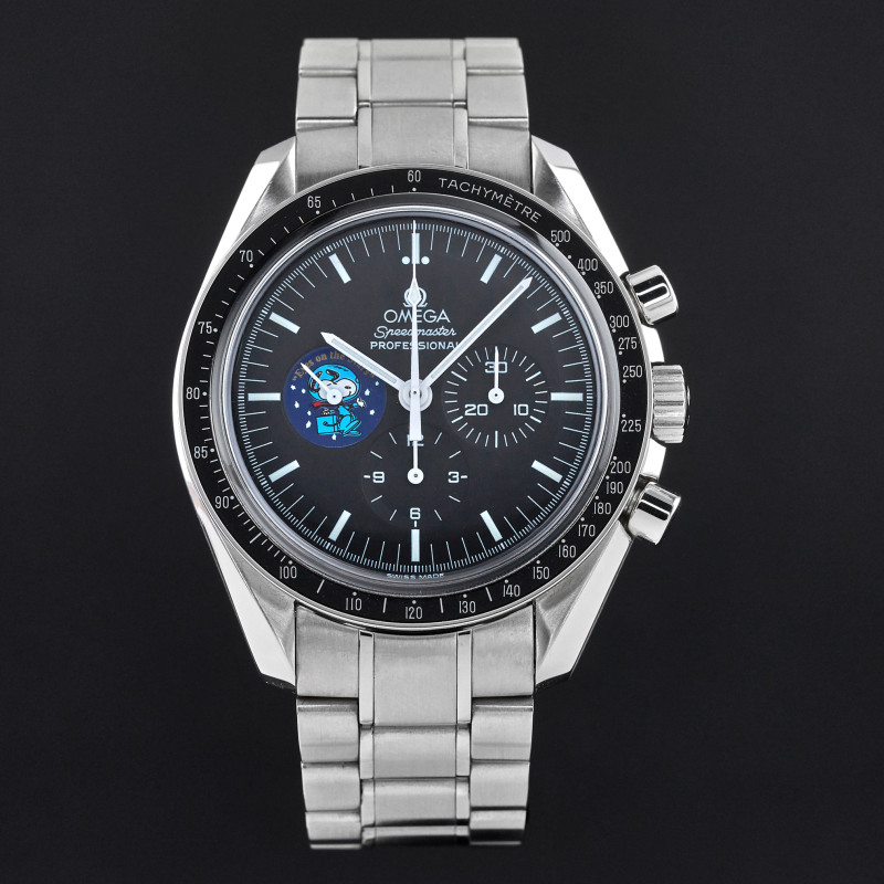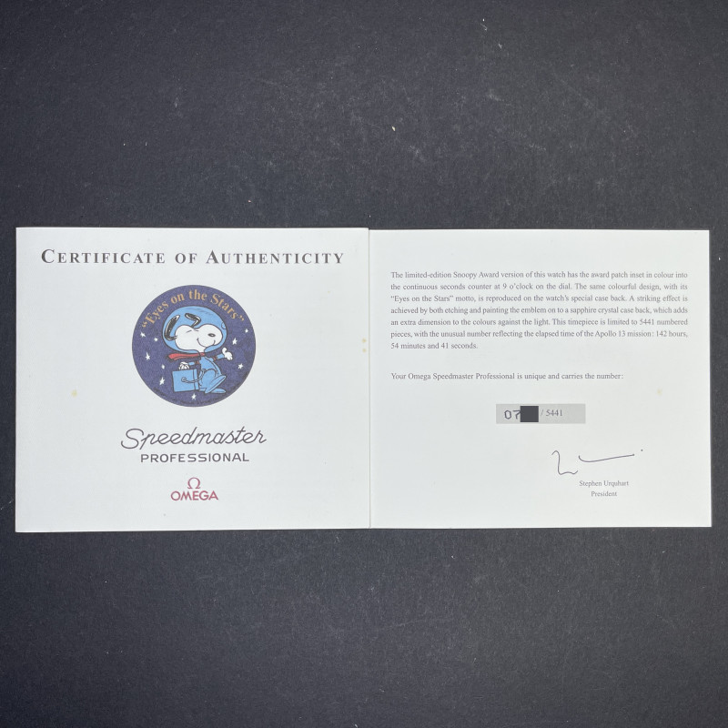 The Omega Speedmaster Professional Moonwatch "Snoopy" Limited Edition, also known as model 3578.51.00, is a remarkable timepiece that pays tribute to a historic moment in space exploration and a unique partnership with NASA. This limited edition watch was created to commemorate the "Silver Snoopy Award" that Omega received in 1970 for its crucial role in helping the Apollo 13 crew return safely to Earth after a critical in-flight emergency. Limited to just 5,441 pieces, the number reflects the duration of the Apollo 13 mission—142 hours, 54 minutes, and 41 seconds. The Omega Speedmaster Professional Moonwatch "Snoopy" Limited Edition features a 42mm stainless steel case with a black dial, and comes on a stainless steel bracelet with a folding buckle. Its functions include hours, minutes, small seconds, chronograph, and tachymeter, making it not only a collector’s item but also a functional and reliable timepiece. One of the most striking features of this special edition watch is the representation of the "Eyes on the Stars" patch, which appears on the subsidiary small seconds dial and is reverse-printed on the sapphire crystal caseback. This design element celebrates the connection between Omega and NASA’s commitment to space exploration and safety. The watch is powered by the calibre 1861. This movement upgrade includes rhodium plating.