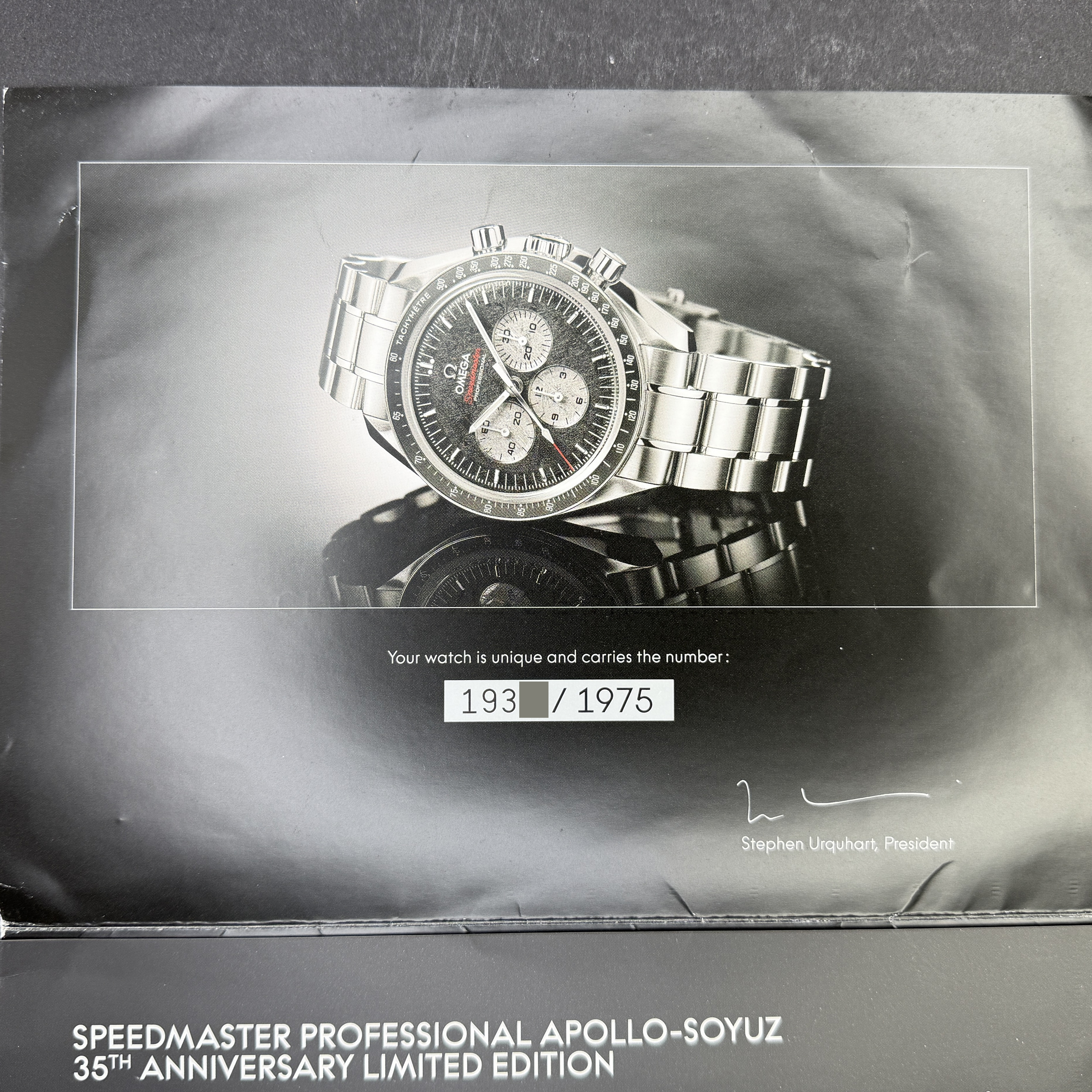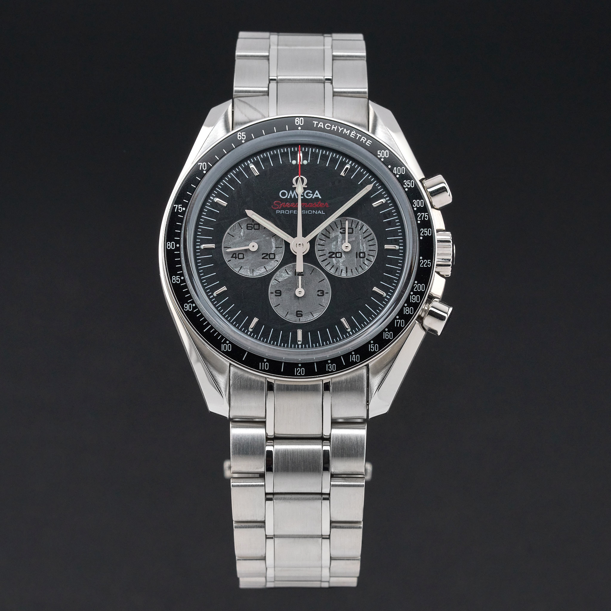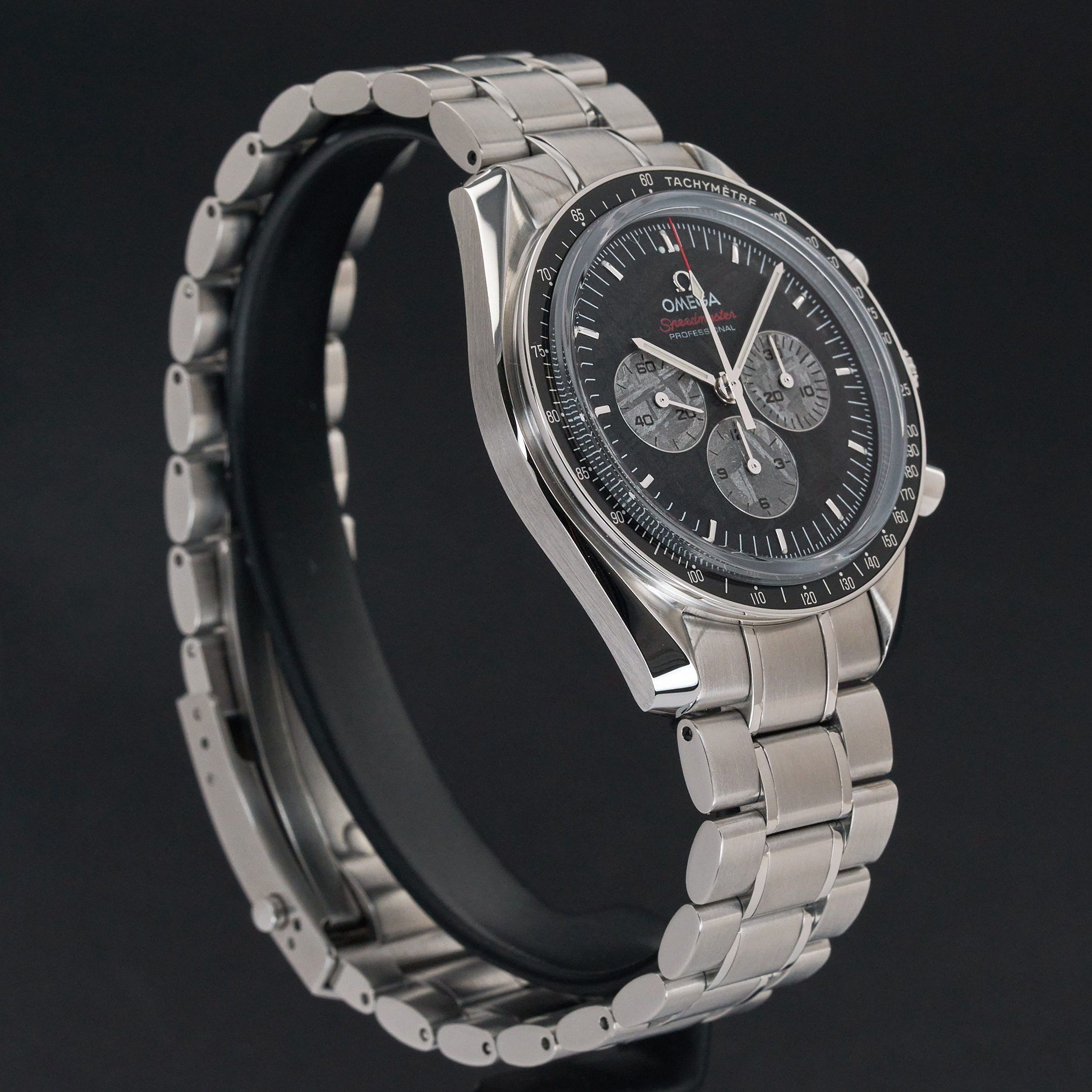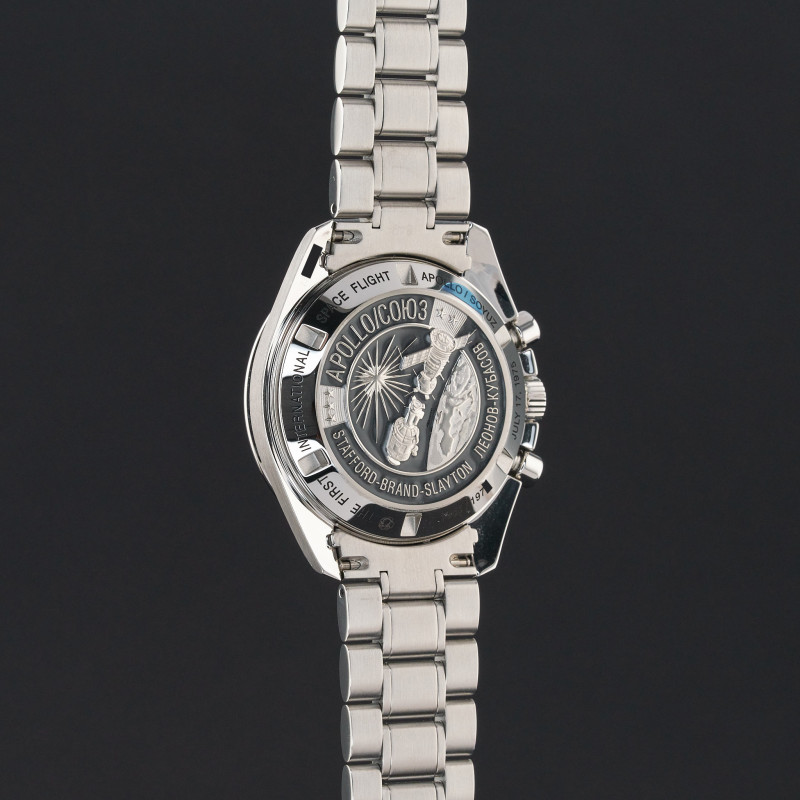 This Omega Speedmaster Professional Moonwatch Apollo Soyuz 311.30.42.30.99.001 features a Black Meteorite dial and is crafted from stainless steel, with a production year of 2017.