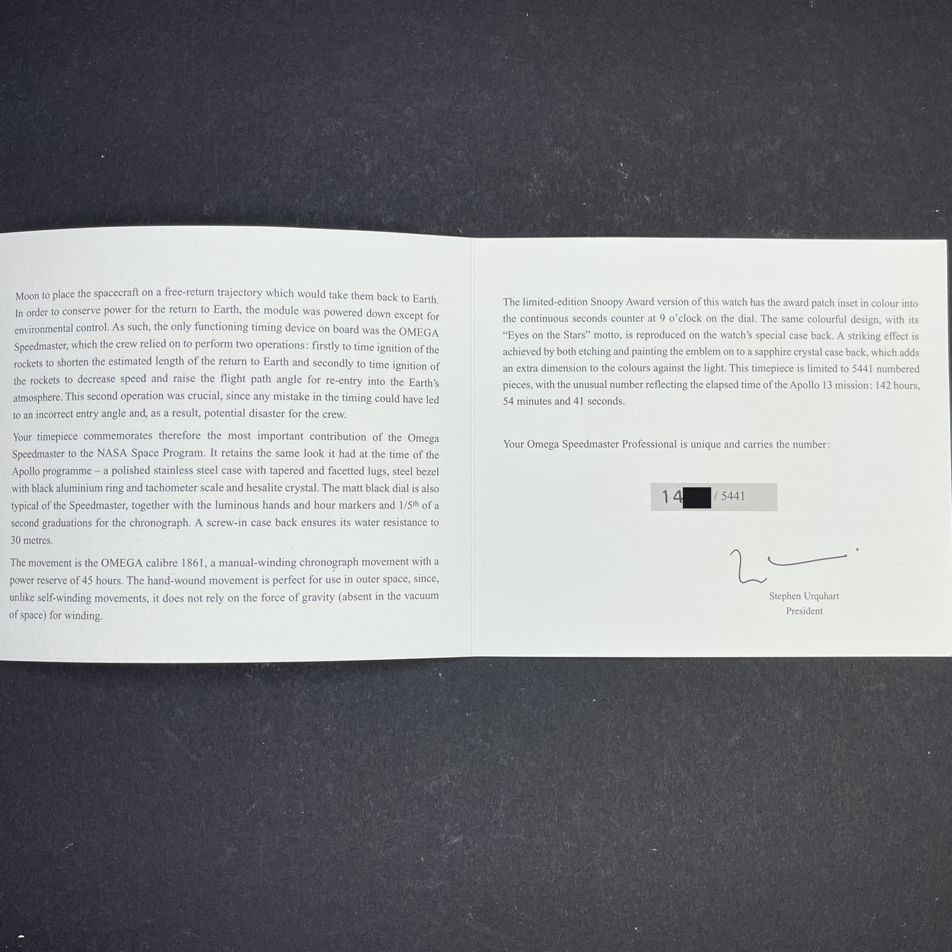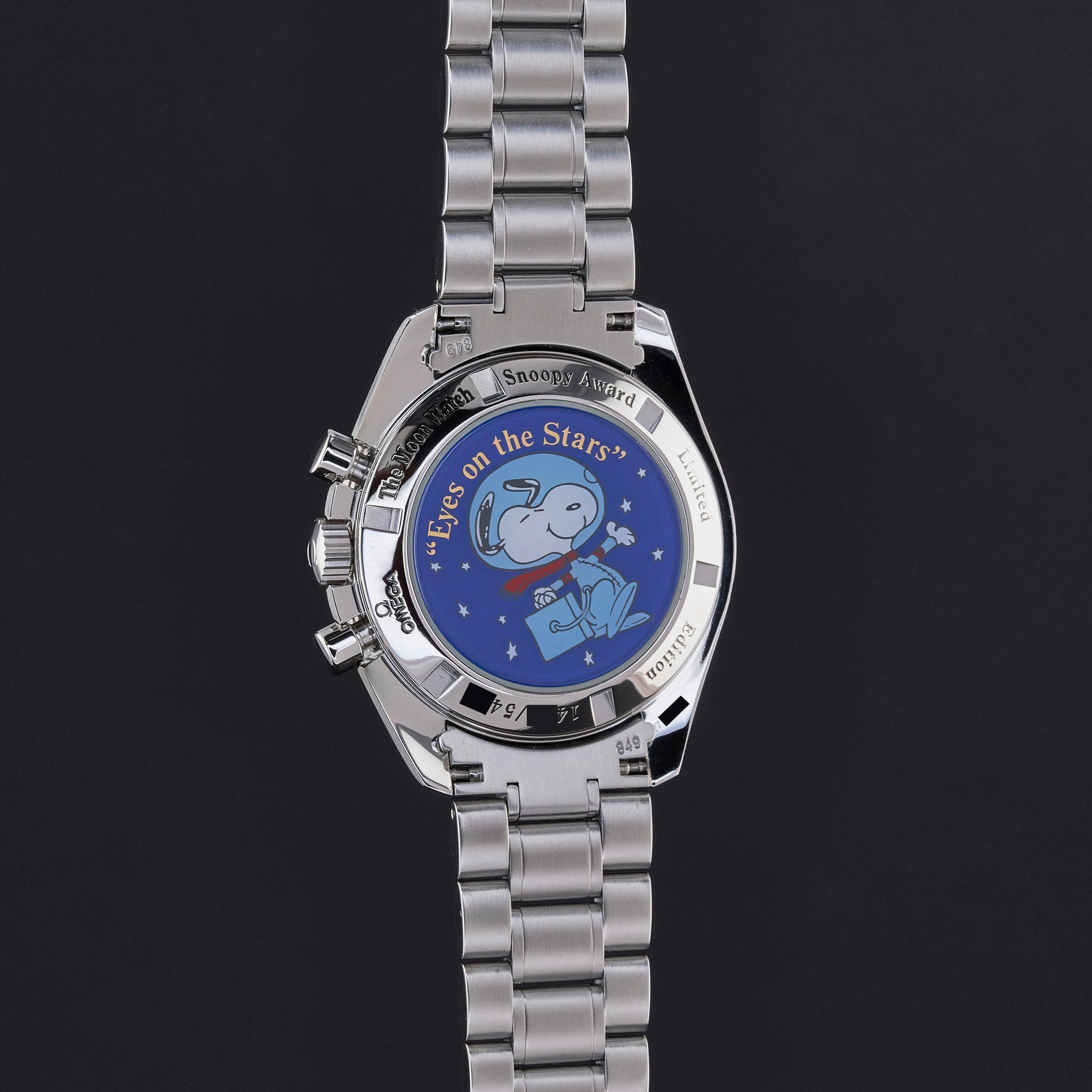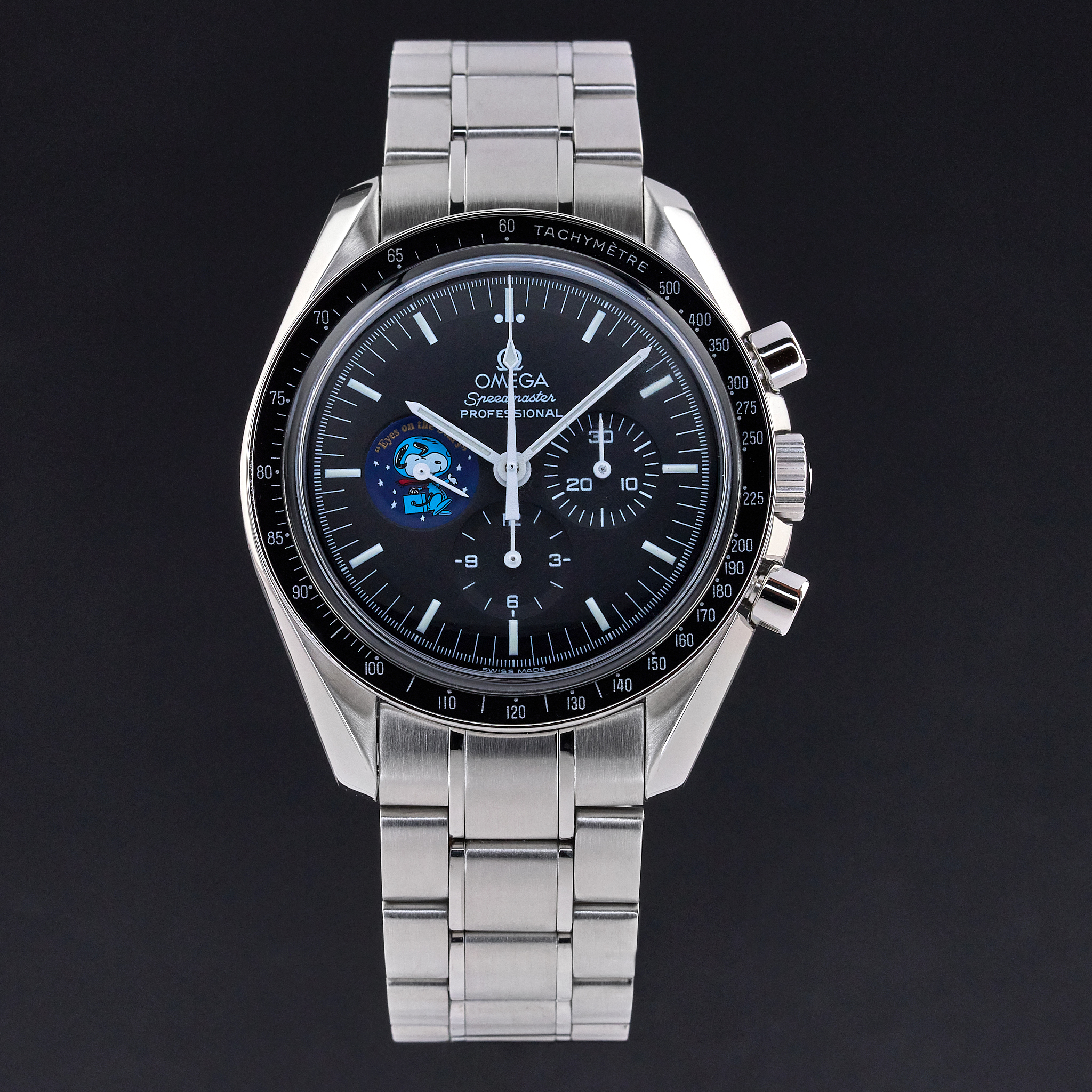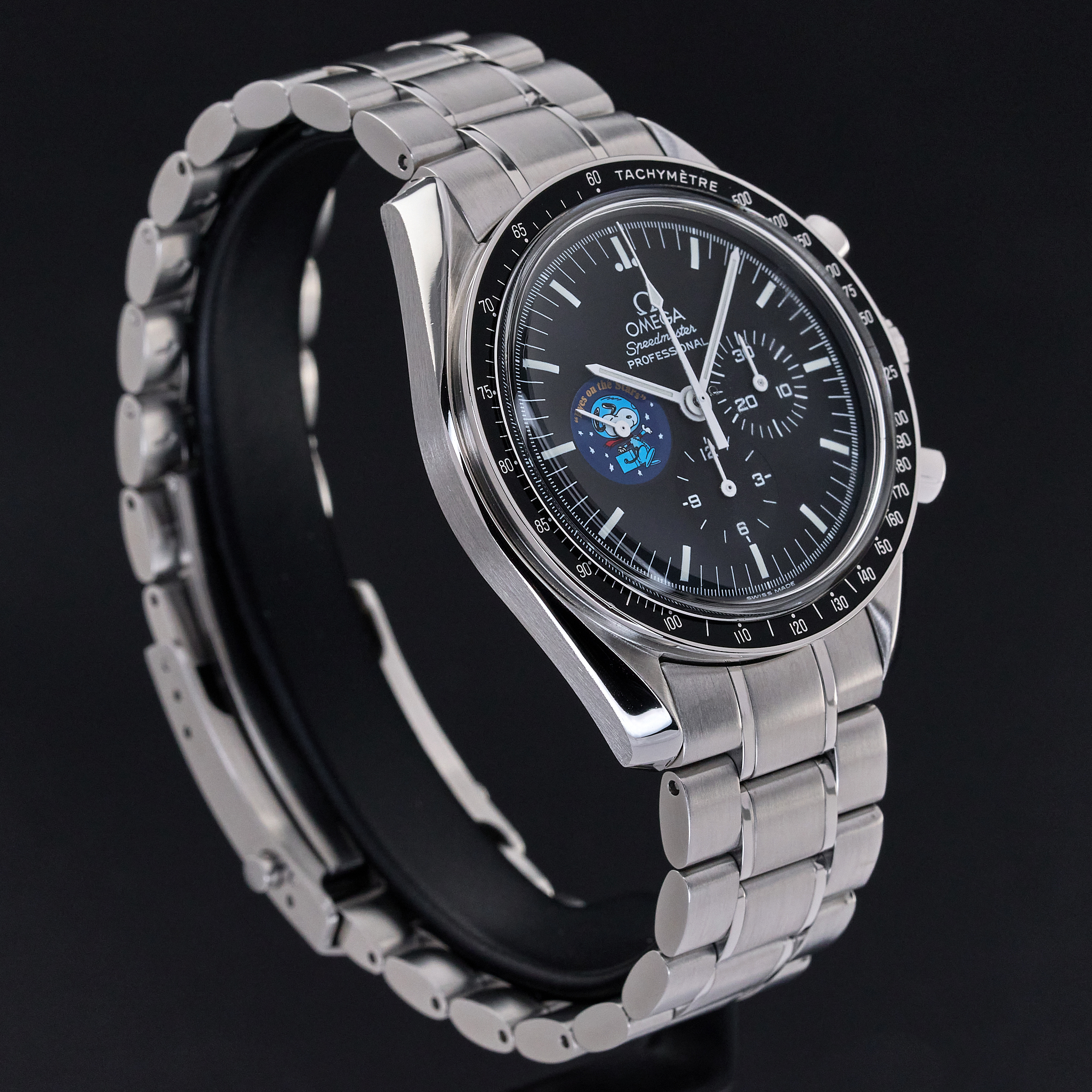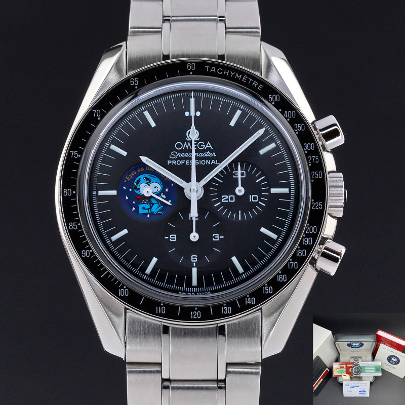 The Omega Speedmaster Professional Moonwatch "Snoopy" Limited Edition, also known as model 3578.51.00, is a remarkable timepiece that pays tribute to a historic moment in space exploration and a unique partnership with NASA. This limited edition watch was created to commemorate the "Silver Snoopy Award" that Omega received in 1970 for its crucial role in helping the Apollo 13 crew return safely to Earth after a critical in-flight emergency. Limited to just 5,441 pieces, the number reflects the duration of the Apollo 13 mission—142 hours, 54 minutes, and 41 seconds. The Omega Speedmaster Professional Moonwatch "Snoopy" Limited Edition features a 42mm stainless steel case with a black dial, and comes on a stainless steel bracelet with a folding buckle. Its functions include hours, minutes, small seconds, chronograph, and tachymeter, making it not only a collector’s item but also a functional and reliable timepiece. One of the most striking features of this special edition watch is the representation of the "Eyes on the Stars" patch, which appears on the subsidiary small seconds dial and is reverse-printed on the sapphire crystal caseback. This design element celebrates the connection between Omega and NASA’s commitment to space exploration and safety. The watch is powered by the calibre 1861. This movement upgrade includes rhodium plating.