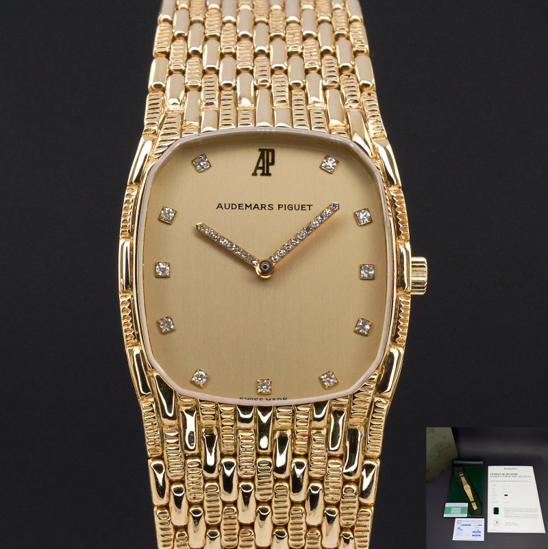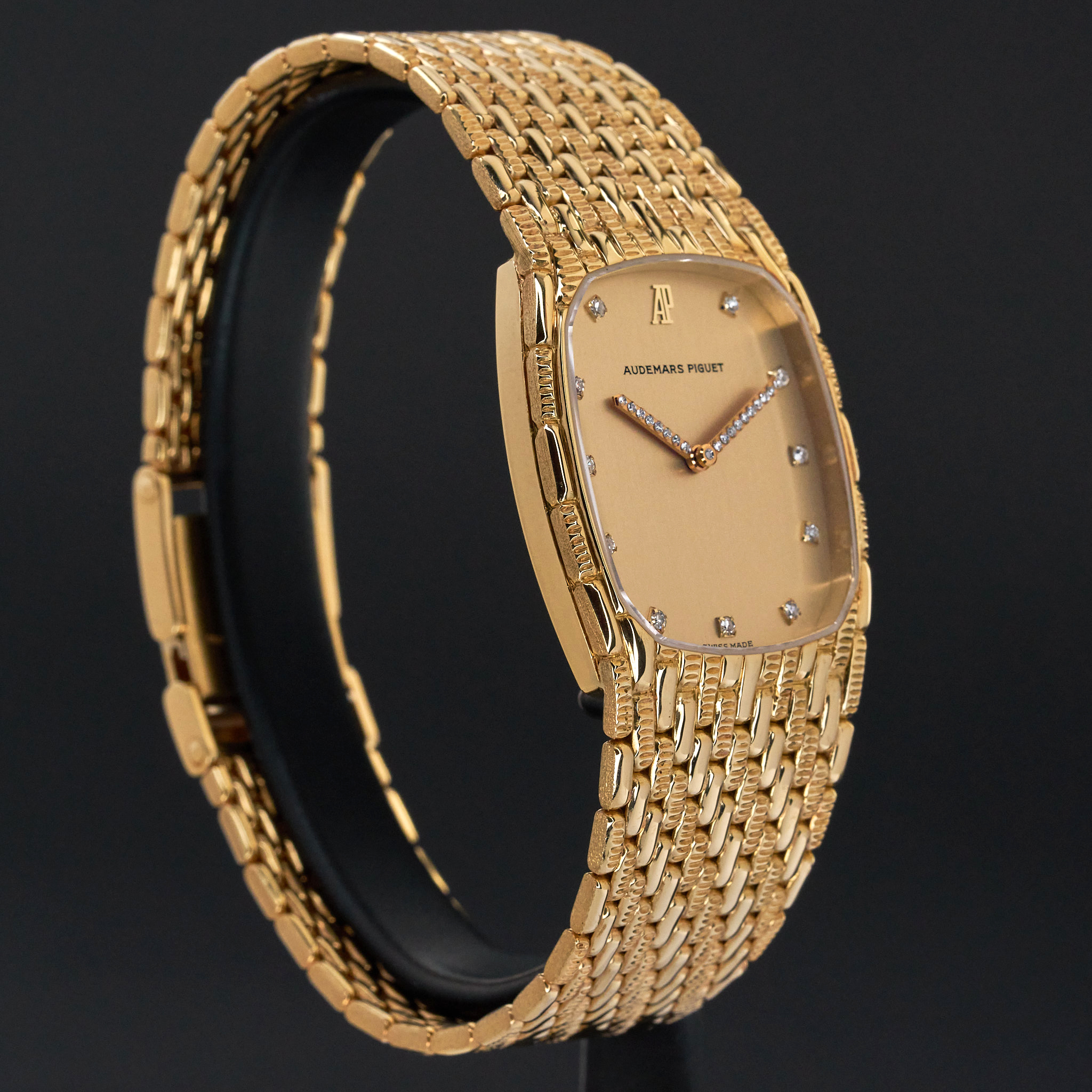 This Audemars Piguet Cobra 14585BA.GG.0664BA.02 features a Champagne small diamond dial and is crafted from 18K yellow gold, with a production year of 1991.