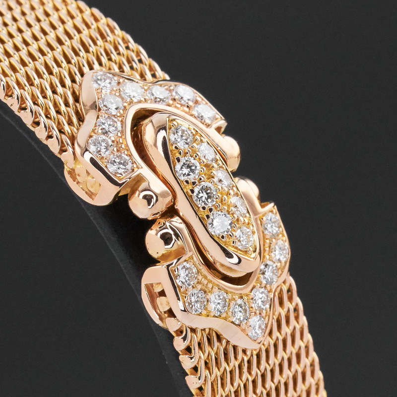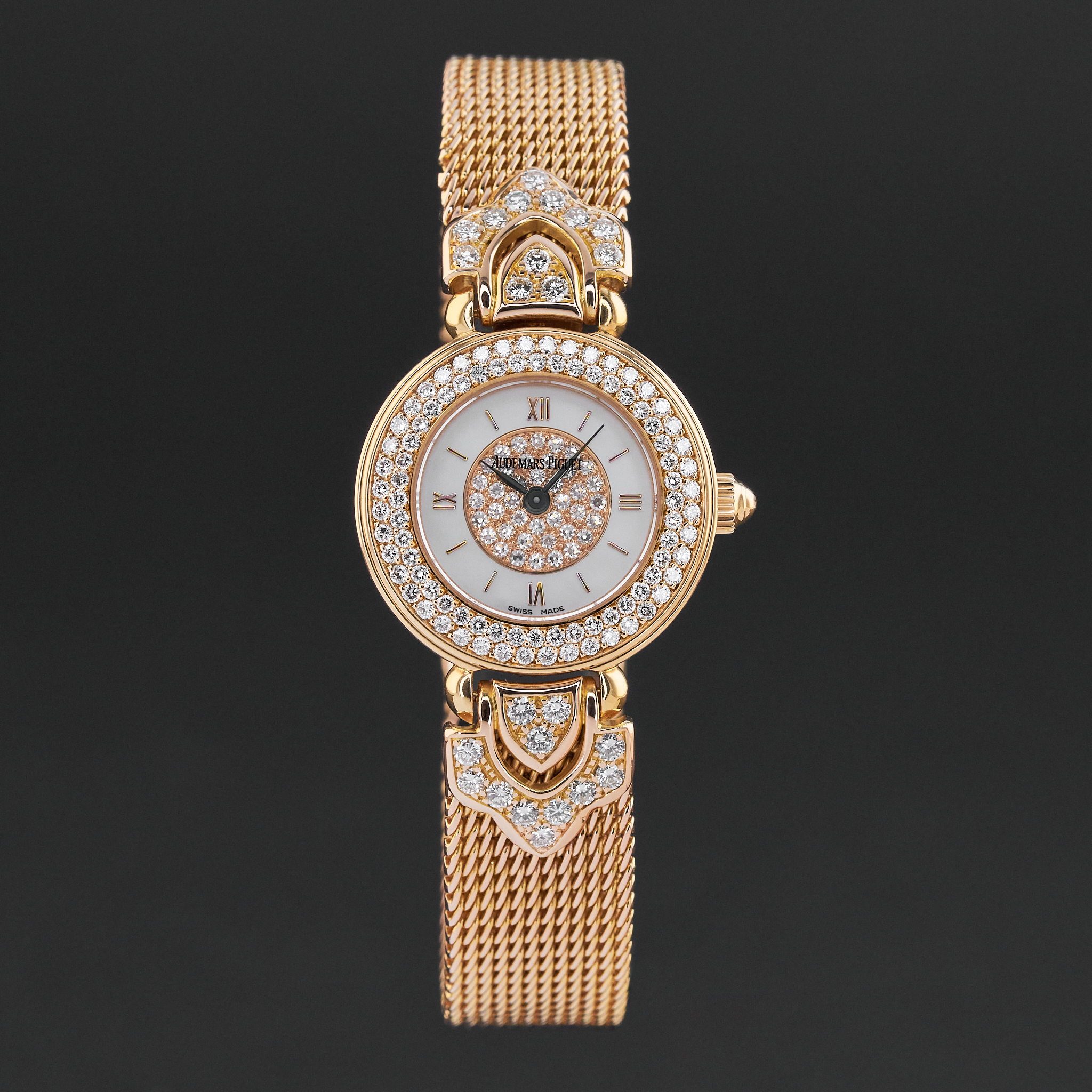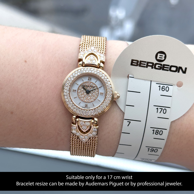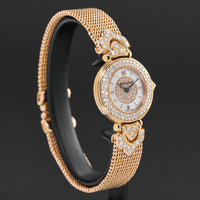 This Audemars Piaget Joaillerie 79331OR.ZZ.1068OR.01 features a Silver Mother of pearl pave diamond dial and is crafted from 18K red gold.