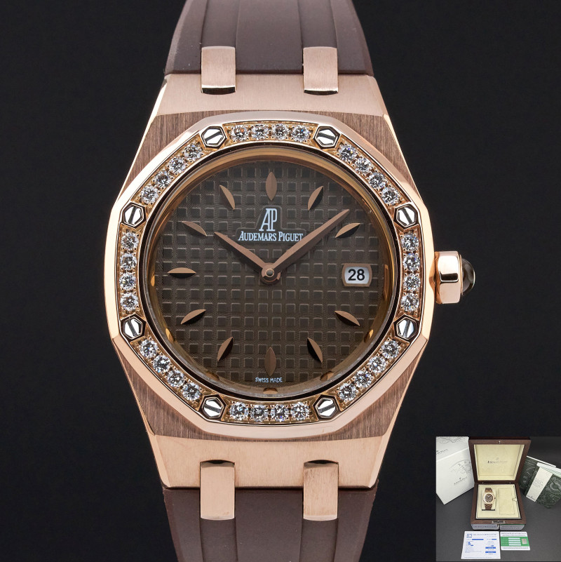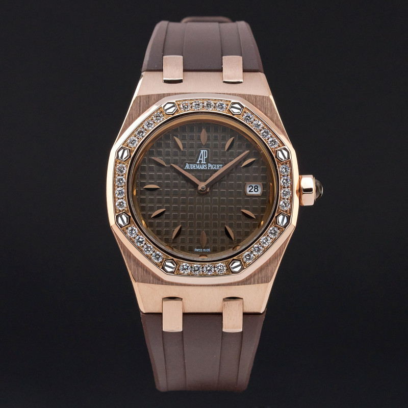 This Audemars Piguet Royal Oak Lady Offshore features a Brown Méga Tapisserie dial and is crafted from 18K rose gold, with a production year of 2009.