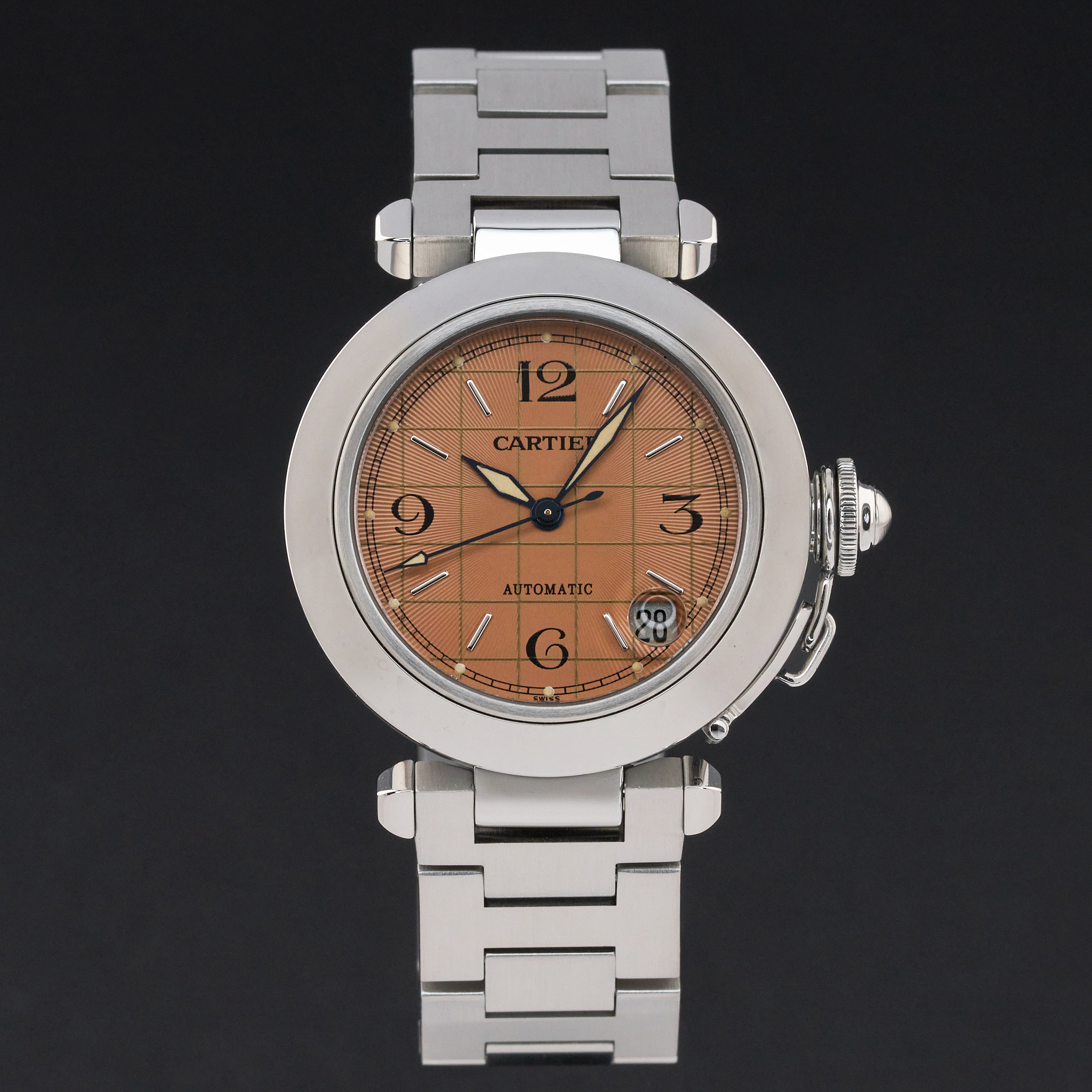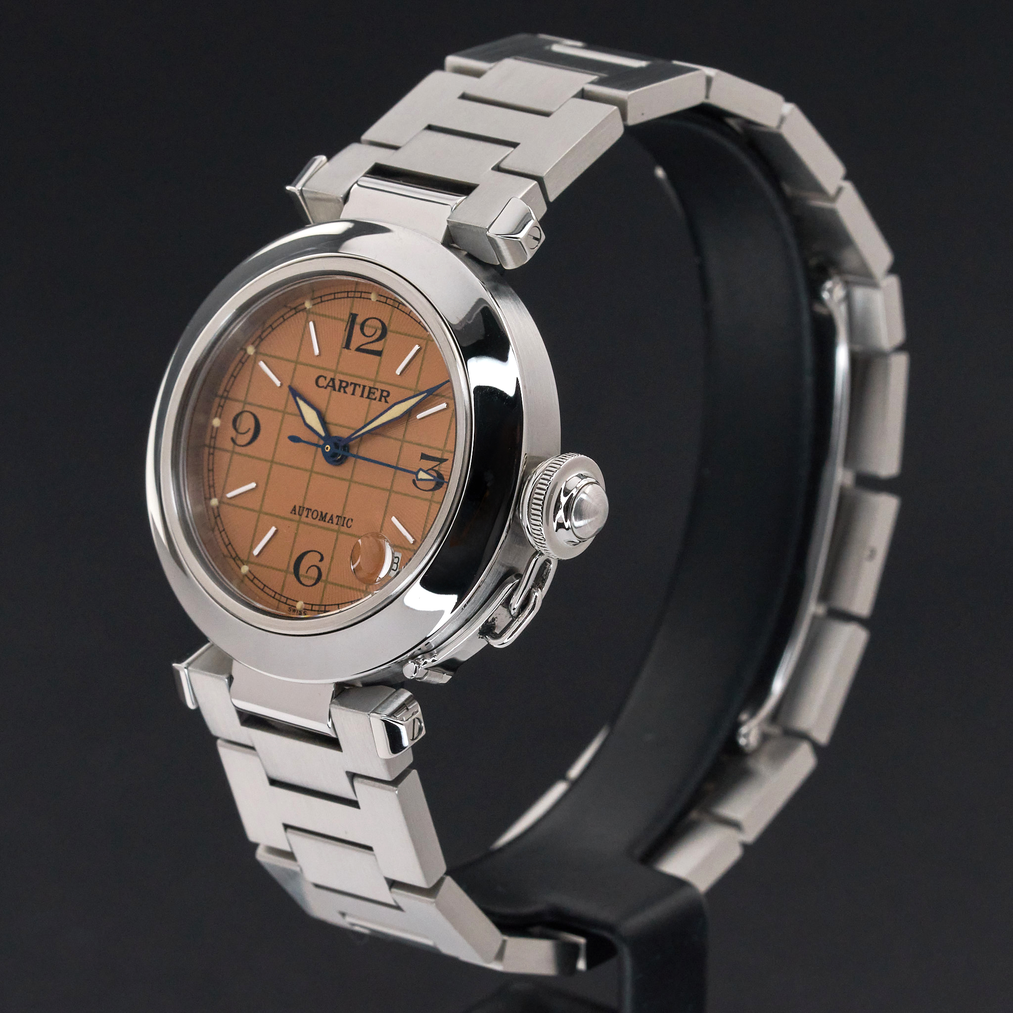 This Cartier Pasha C W31024M7 features a Orange Arabic dial and is crafted from stainless steel.