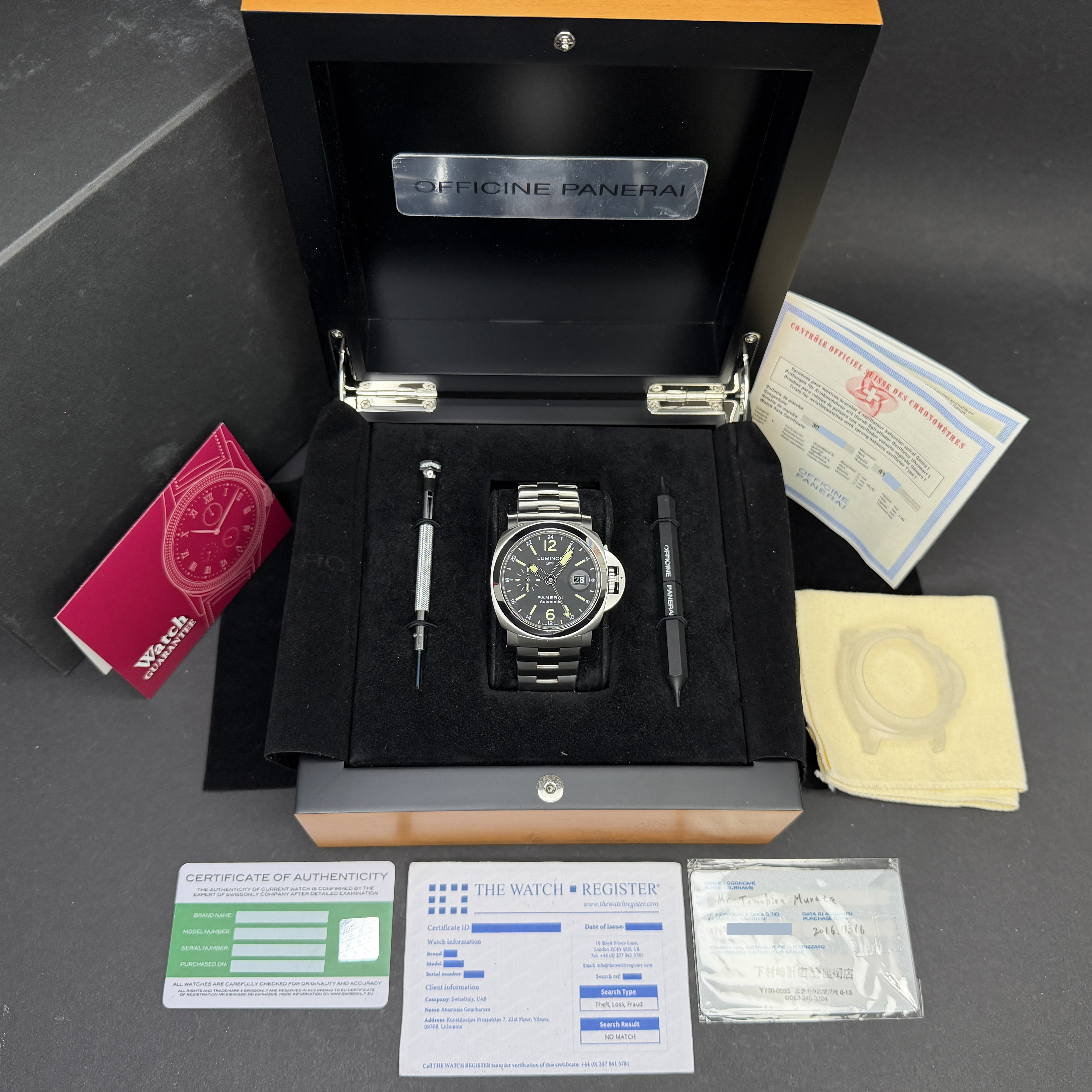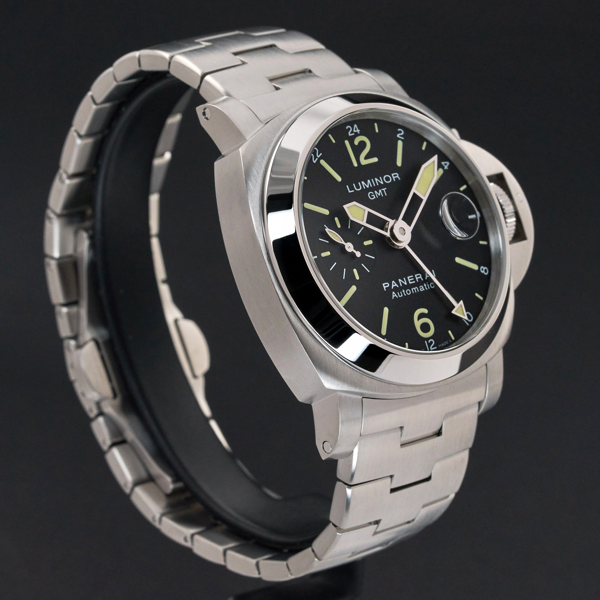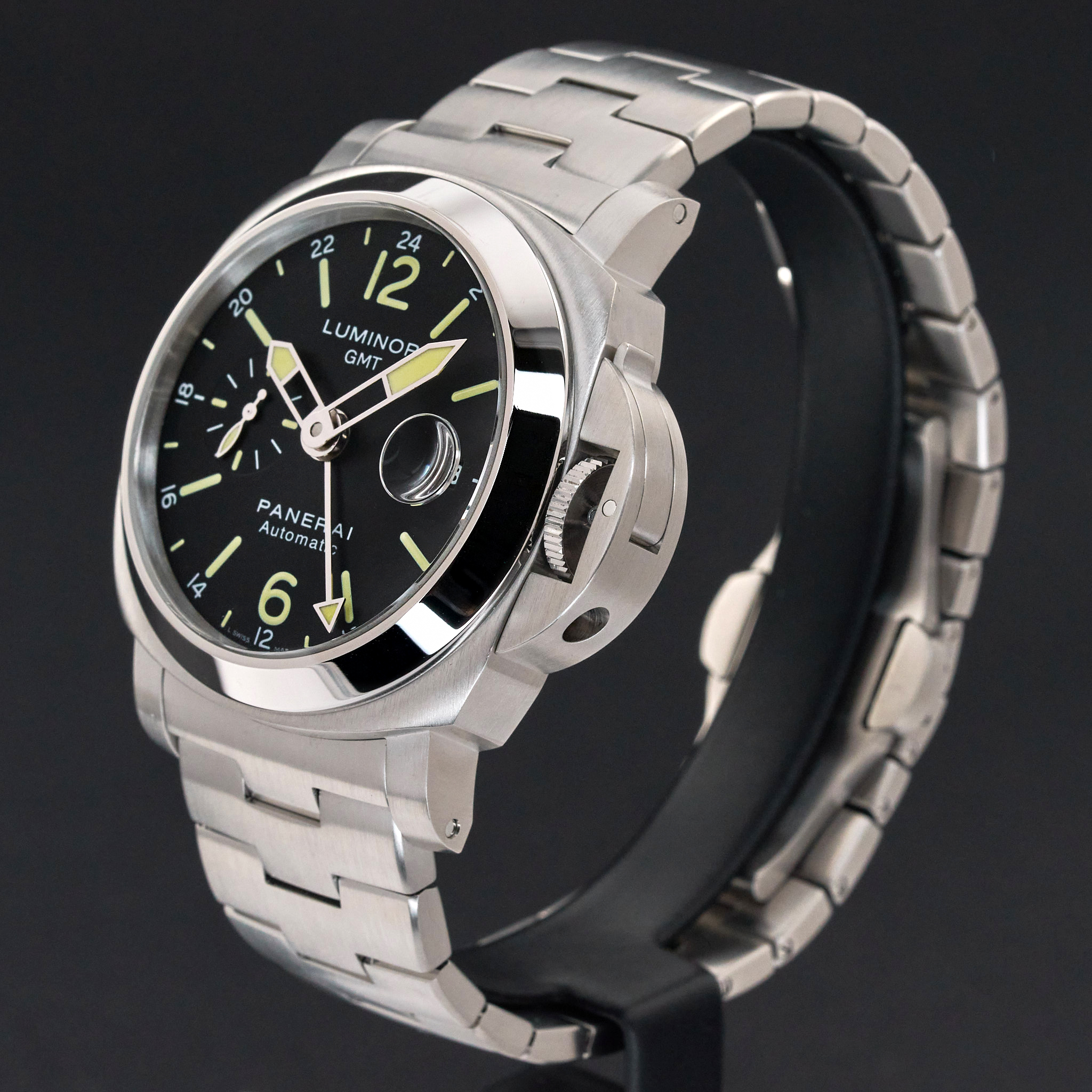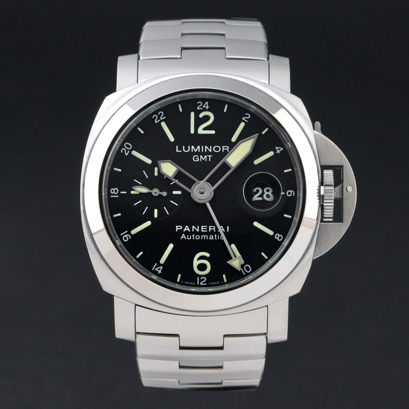 This Panerai Luminor GMT PAM 00297 features a Black dial and is crafted from stainless steel, with a production year of 2016.