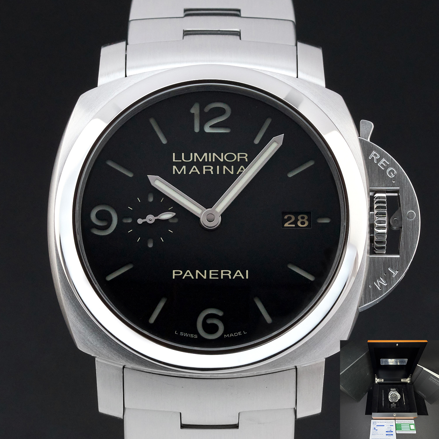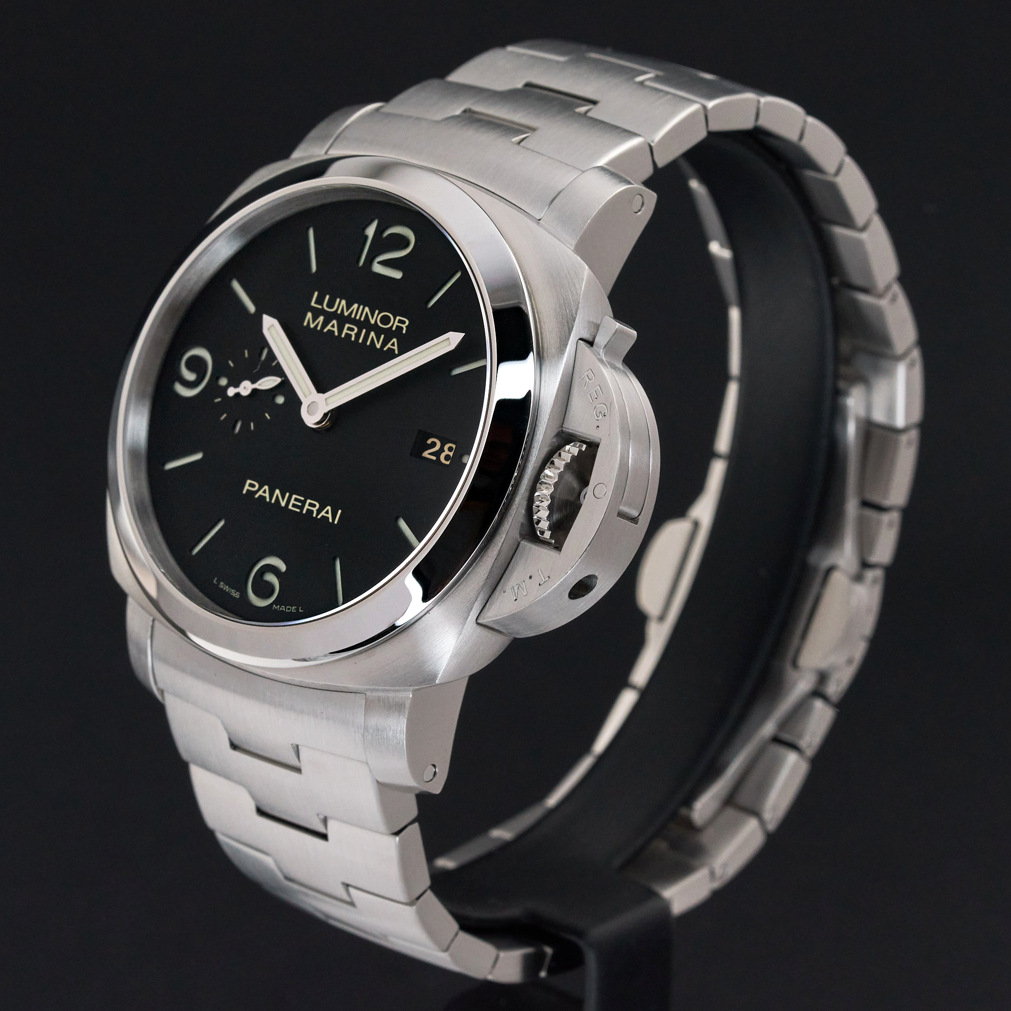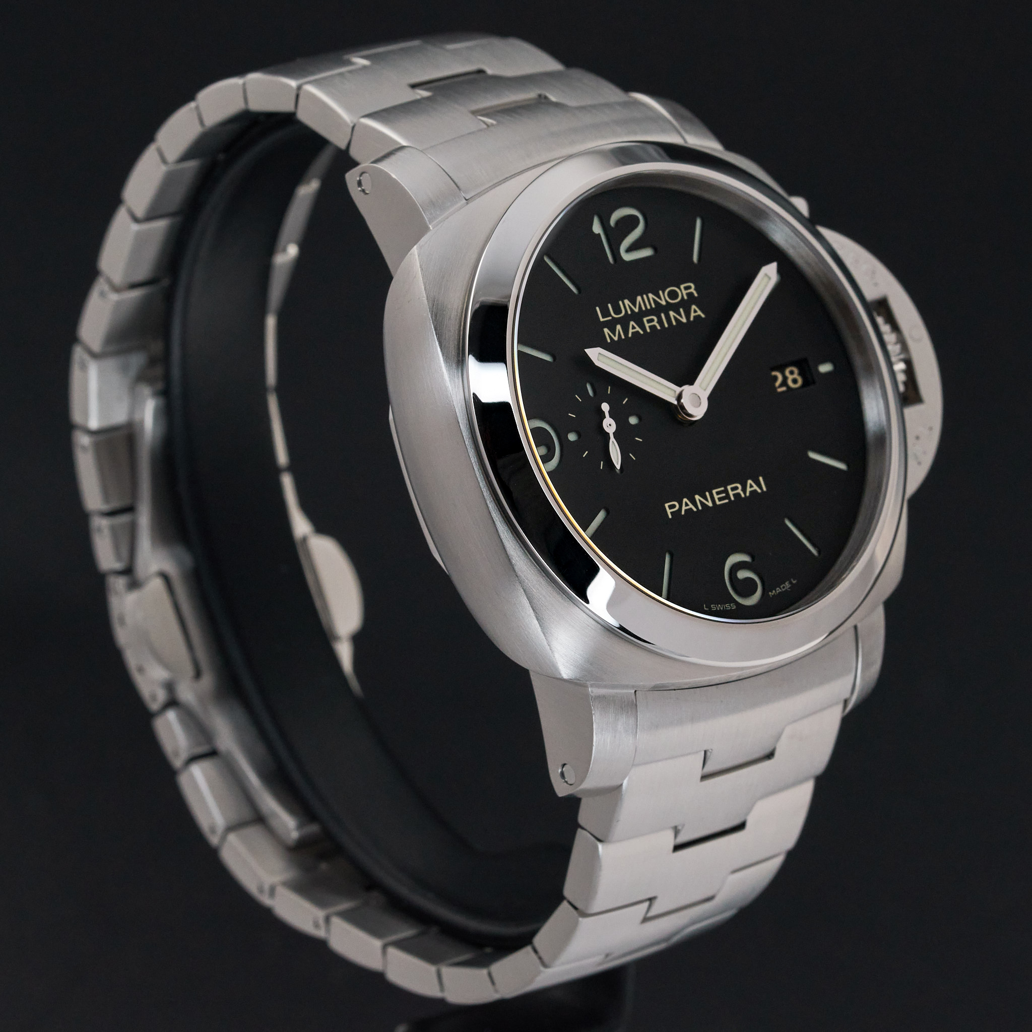 This Panerai Luminor Marina PAM 00328 features a Black Arabic dial and is crafted from stainless steel.
