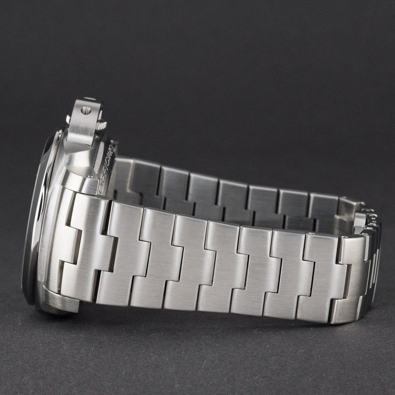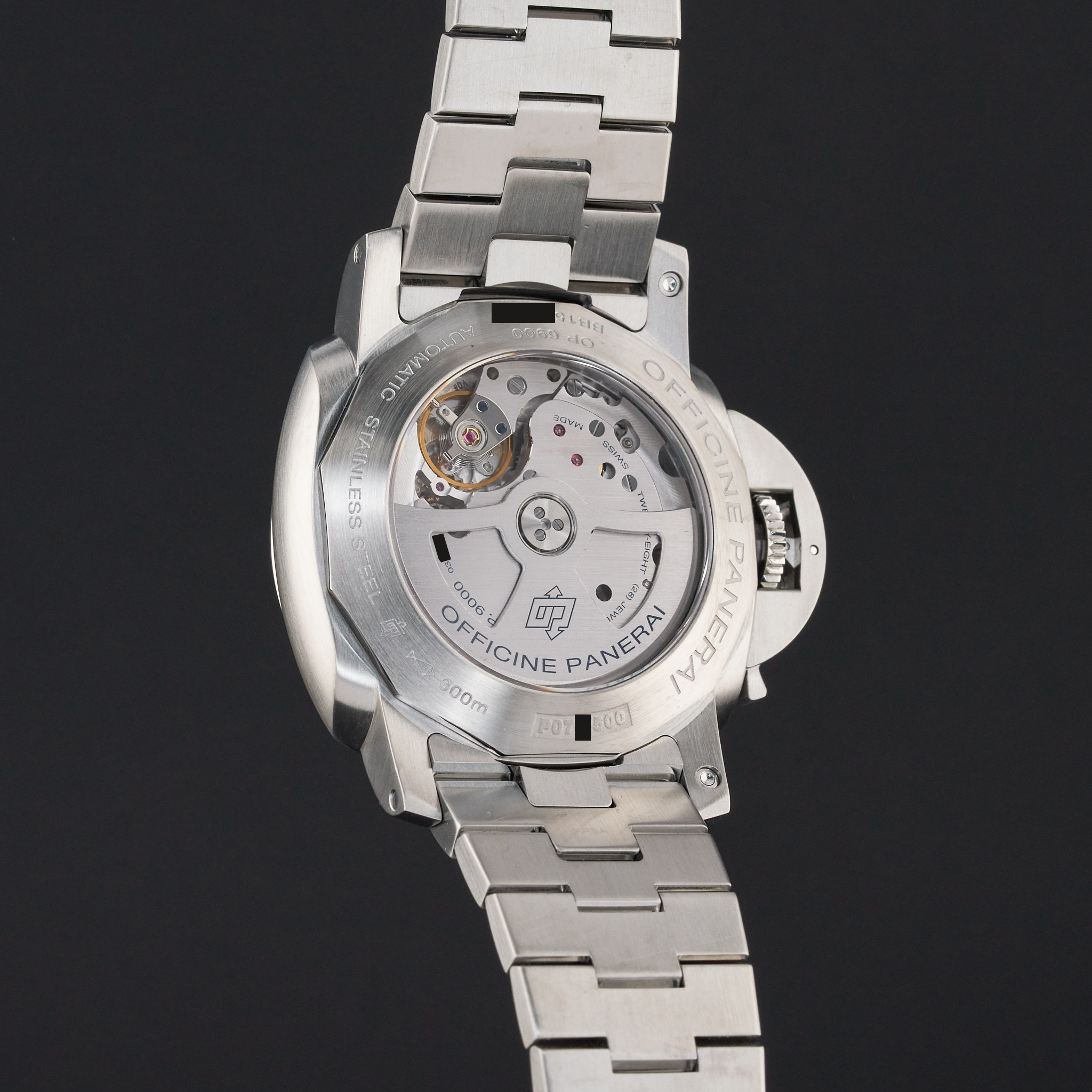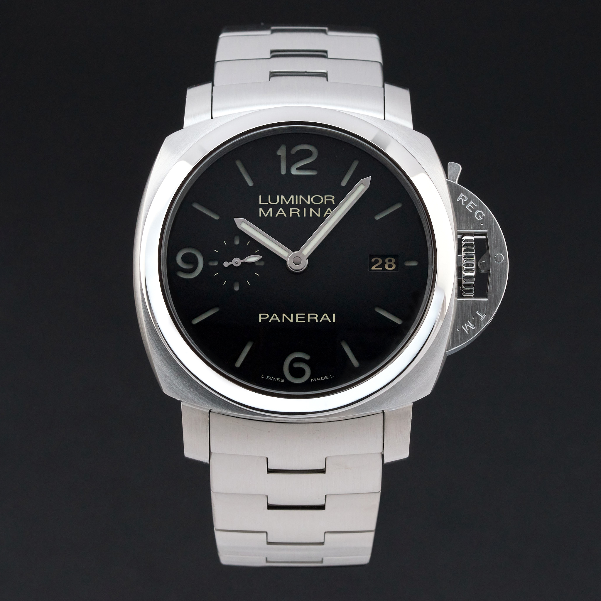 This Panerai Luminor Marina PAM 00328 features a Black Arabic dial and is crafted from stainless steel.