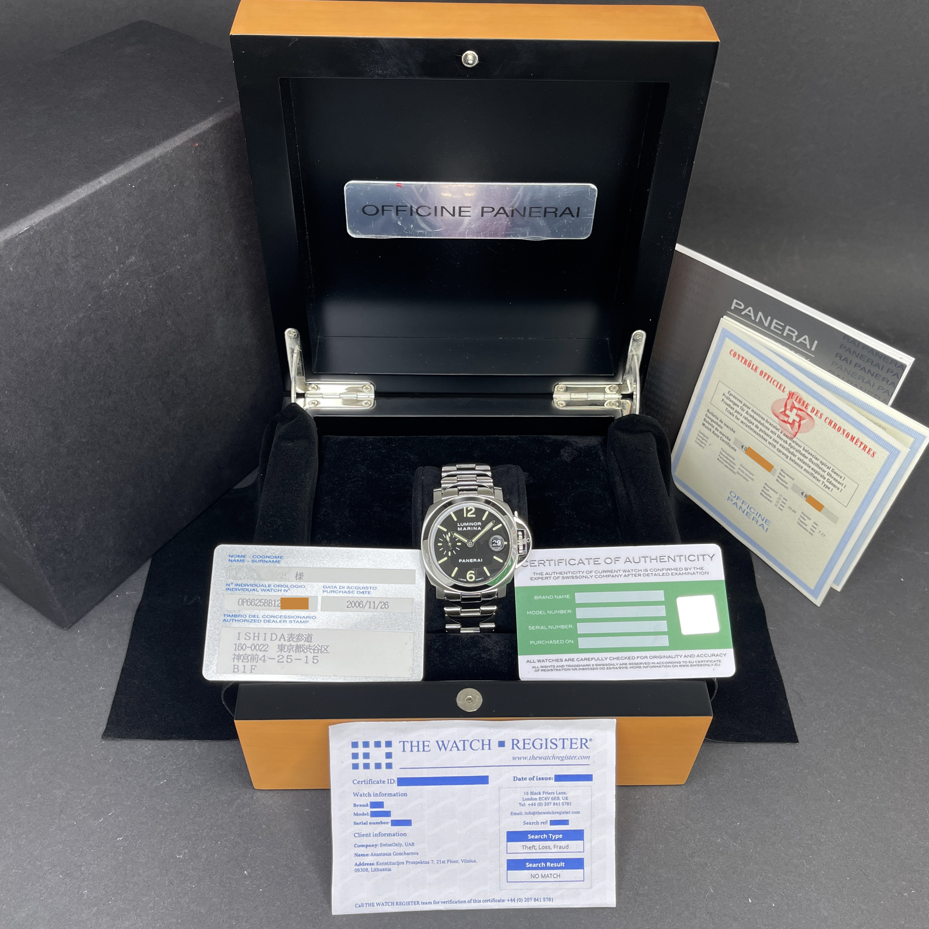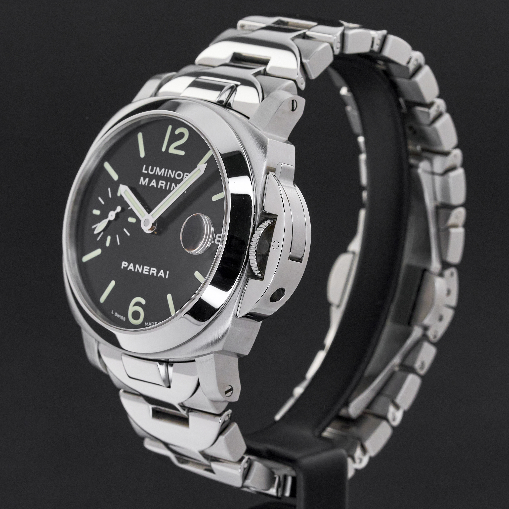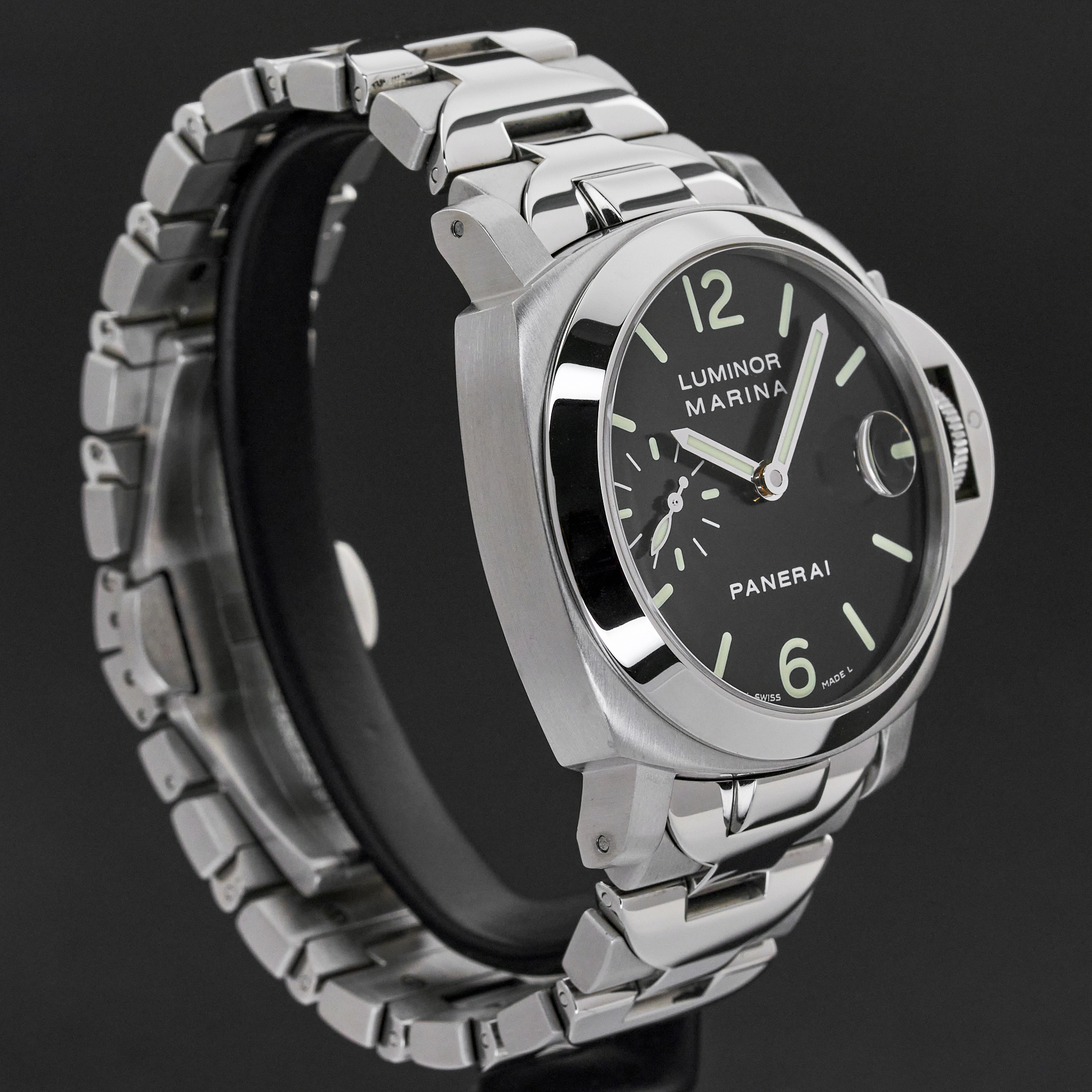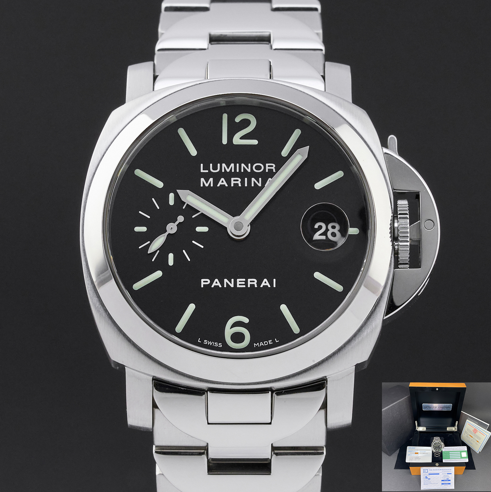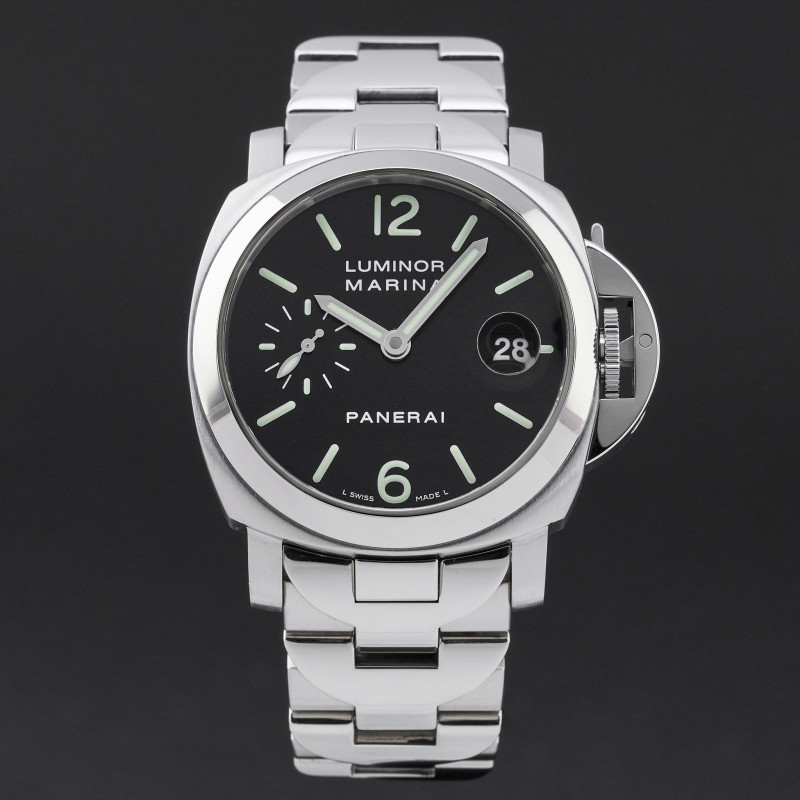 This Panerai PAM 00050 Luminor Marina features a Black Arabic dial and is crafted from stainless steel, with a production year of 2006.