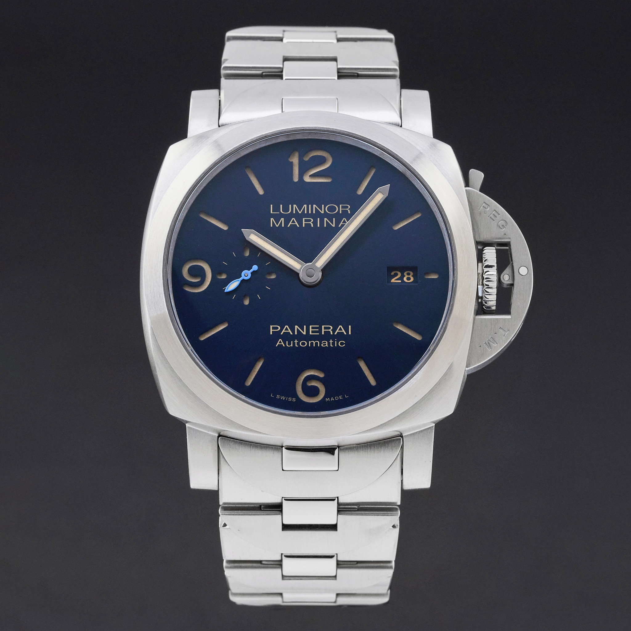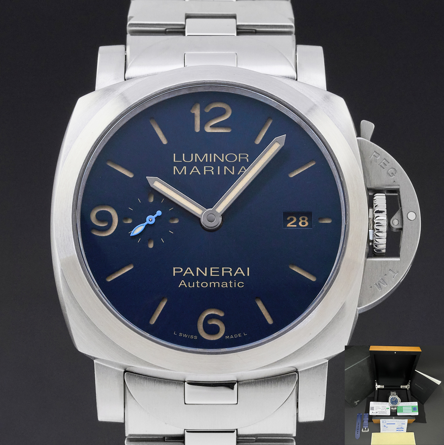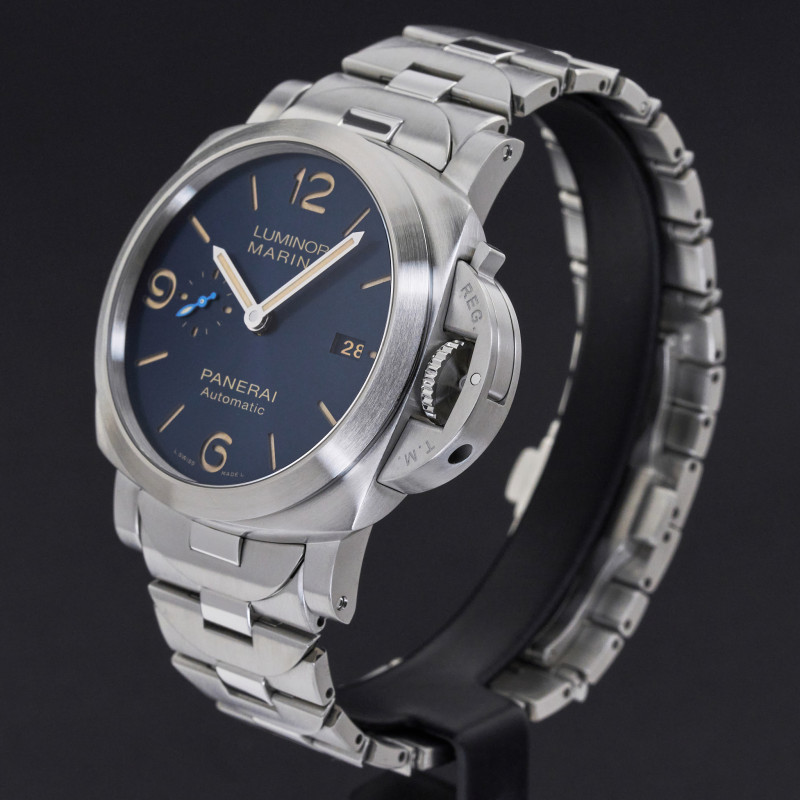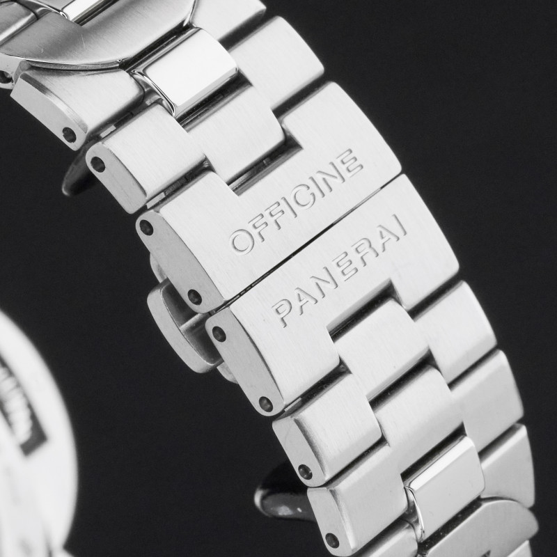 This Panerai Luminor Marina Automatic PAM 01058 features a Black tapestry dial and is crafted from stainless steel, with a production year of 2019.