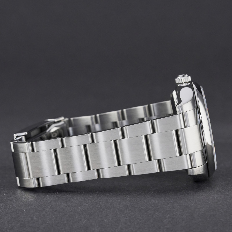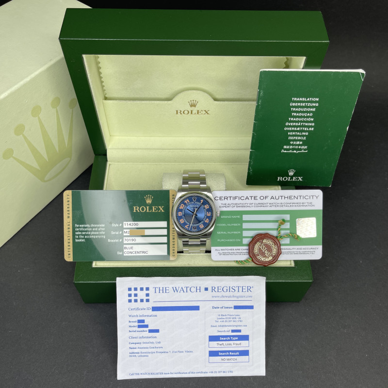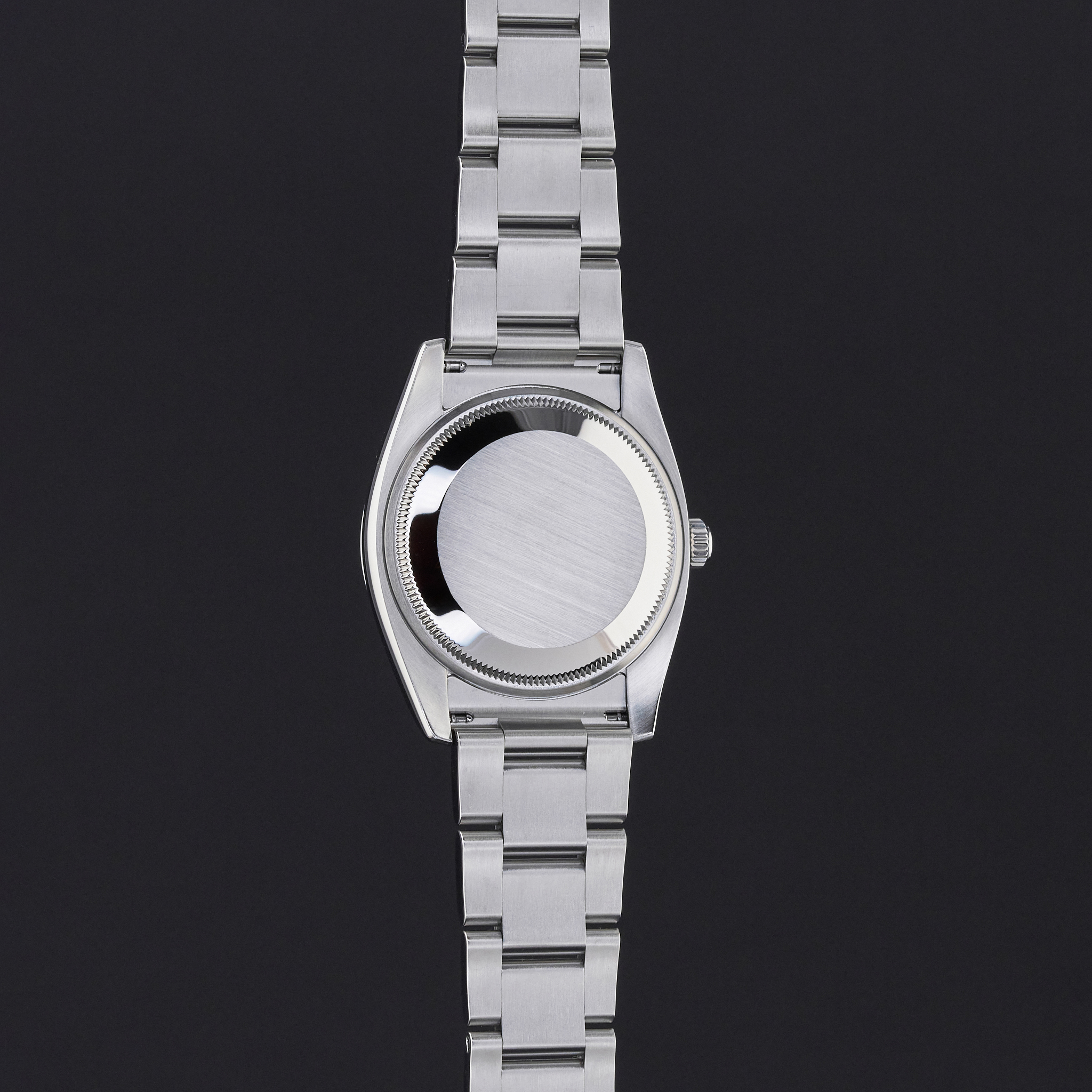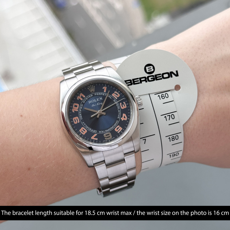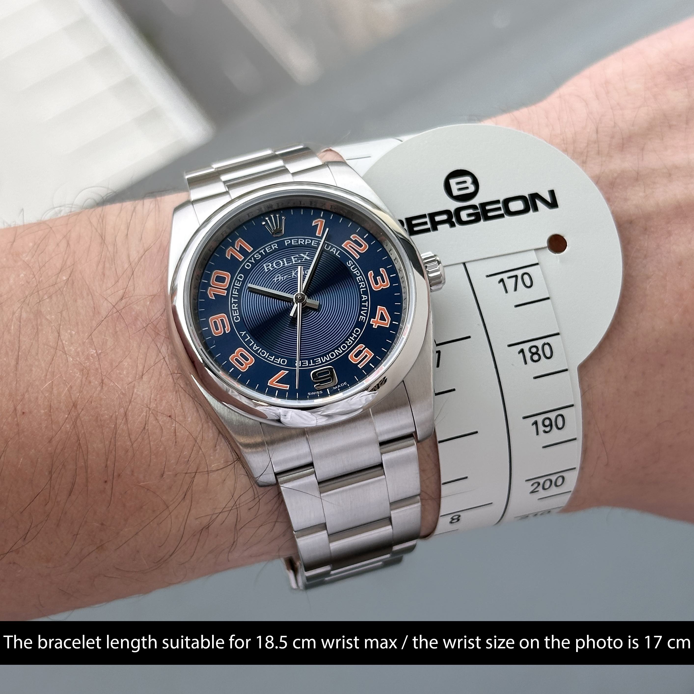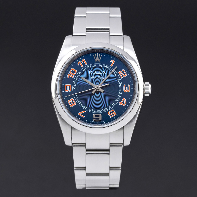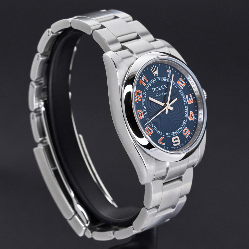 This Rolex Air-King 114200 features a Blue concentric Arabic dial and is crafted from stainless steel, with a production year of 2008.