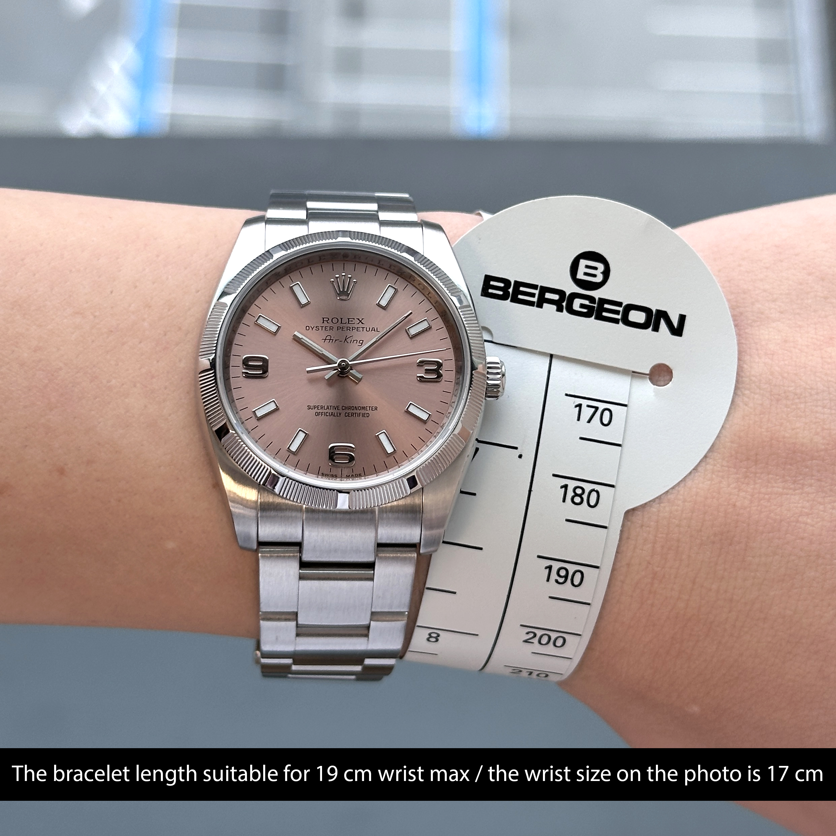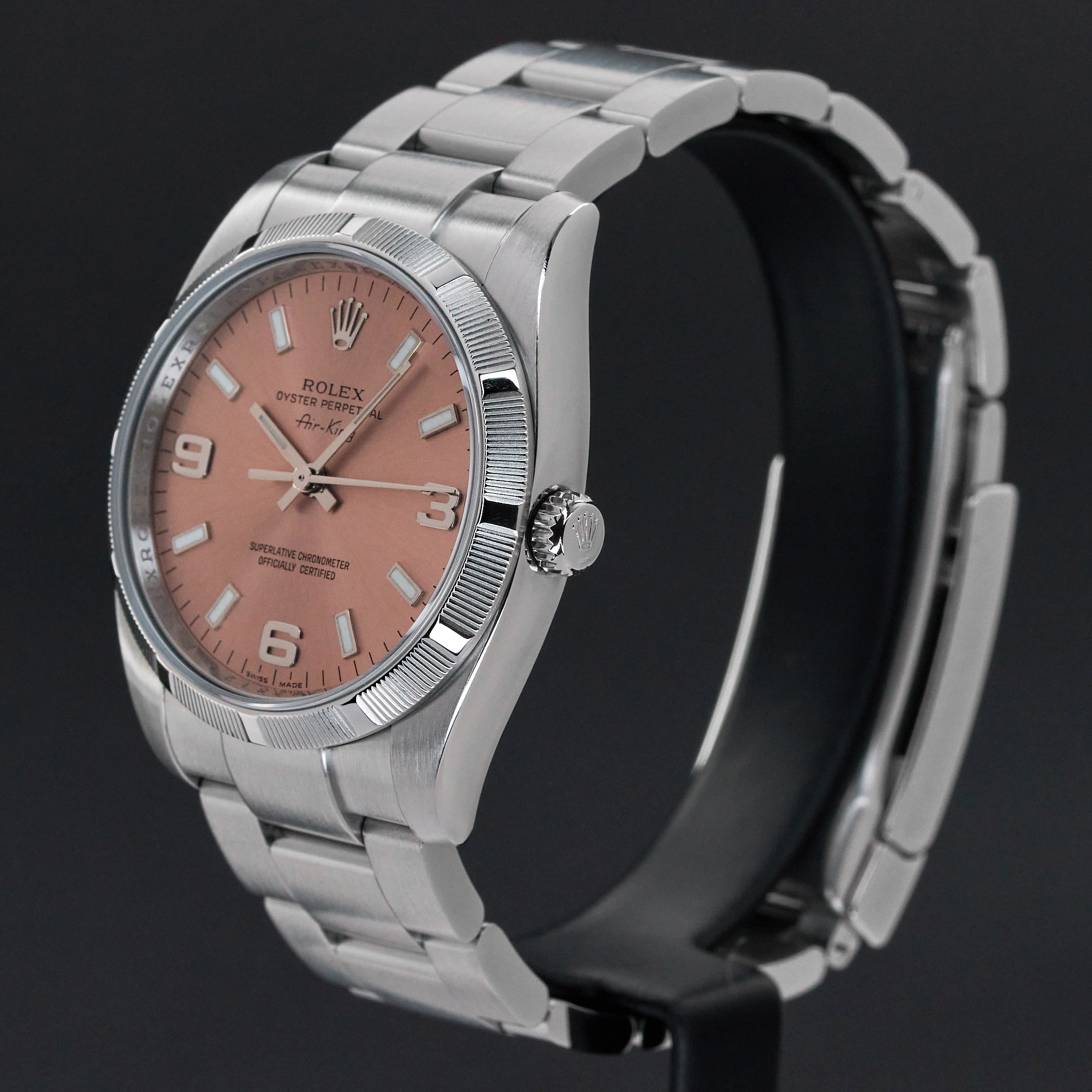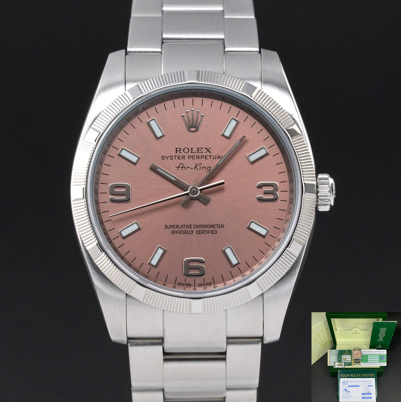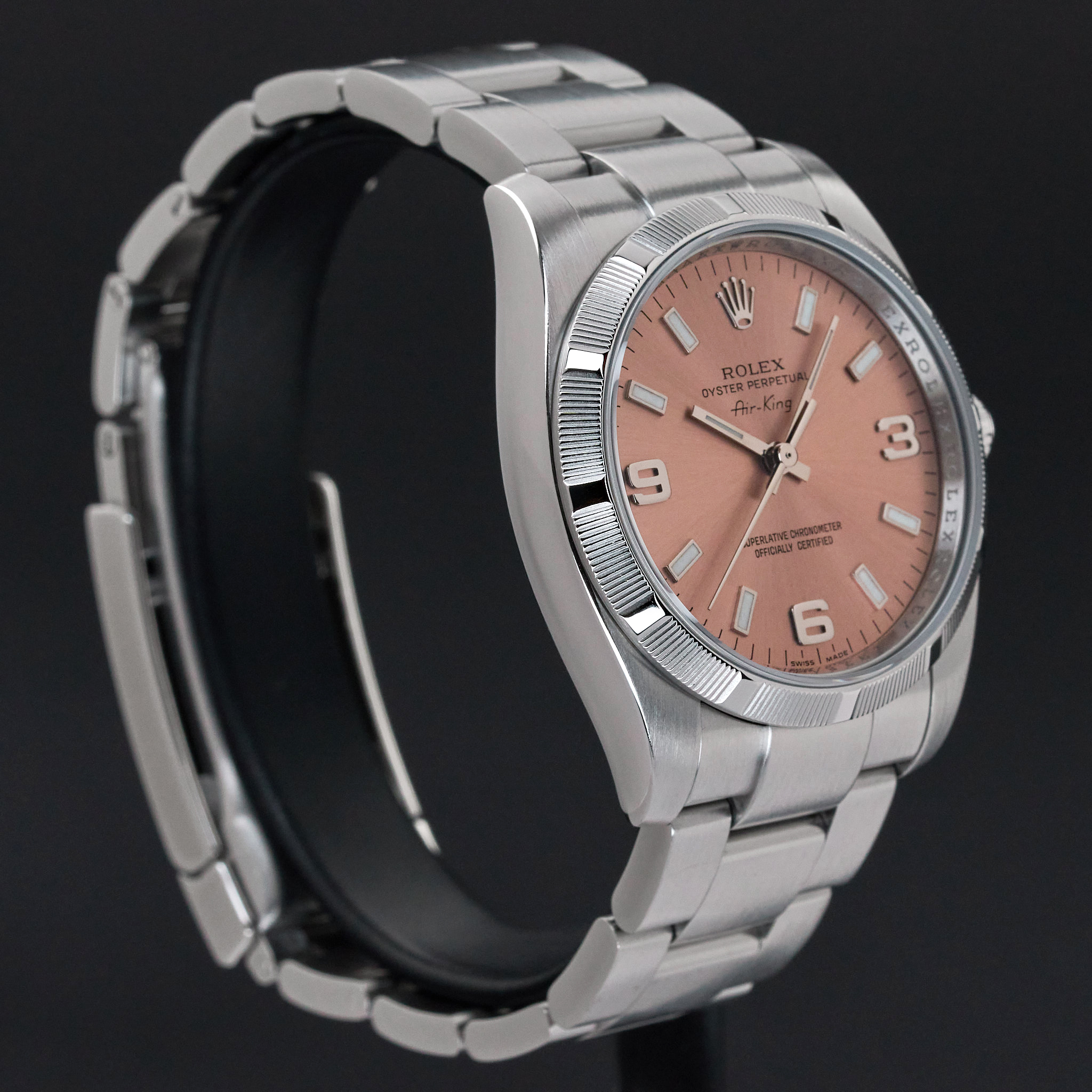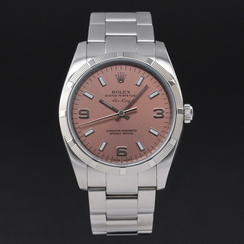 This Rolex Air-King 114210 features a Salmon Arabic dial and is crafted from stainless steel, with a production year of 2006.