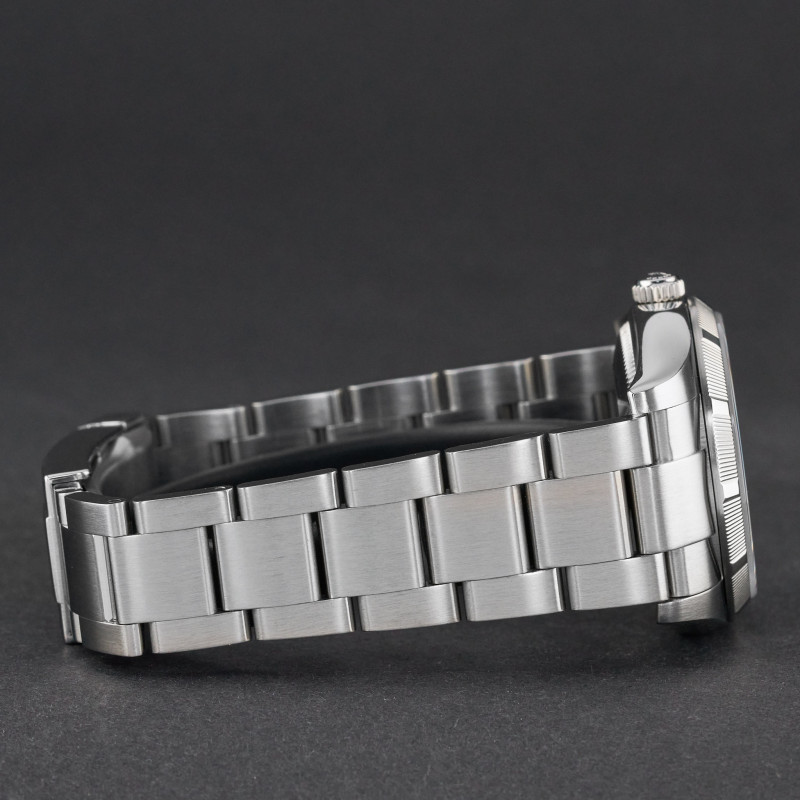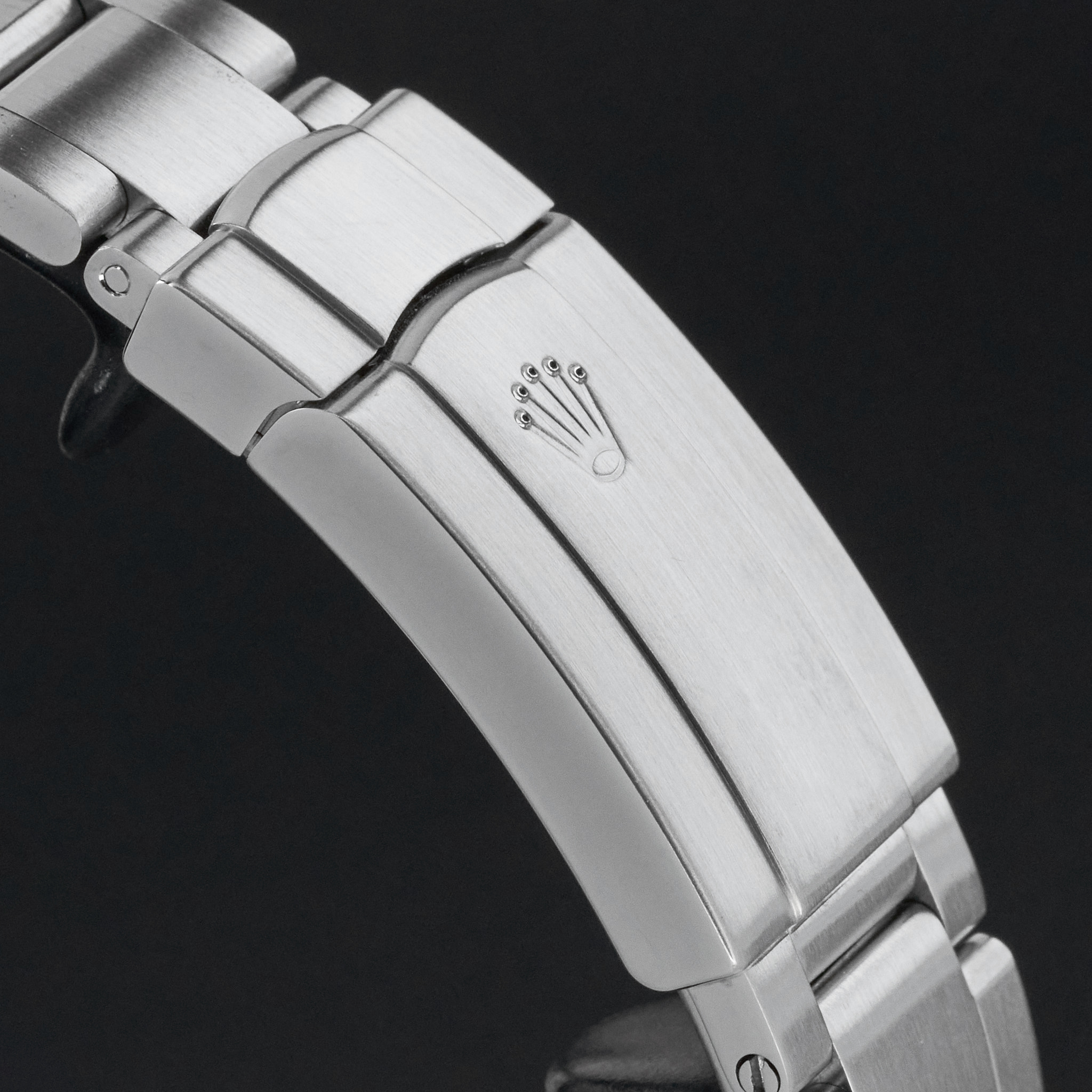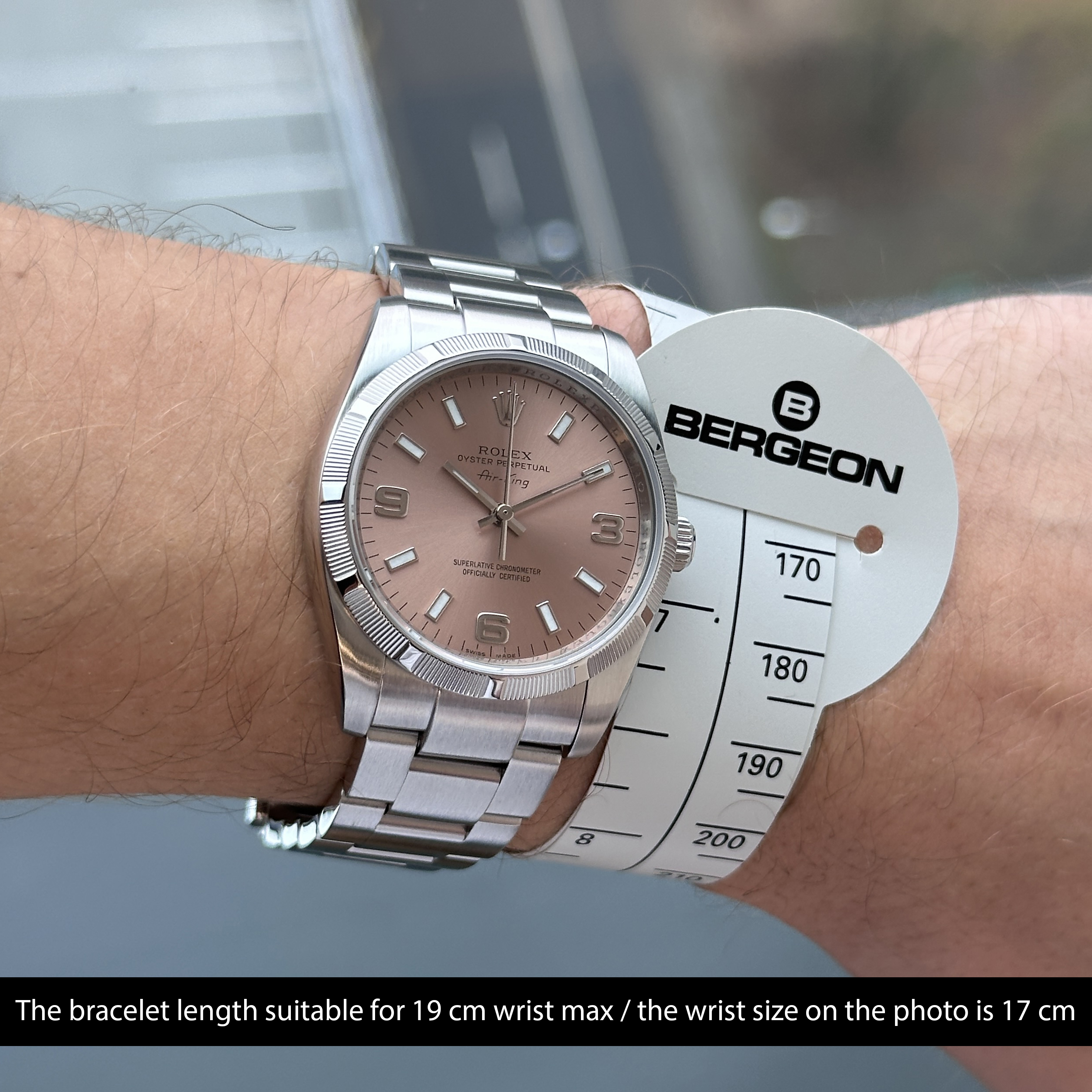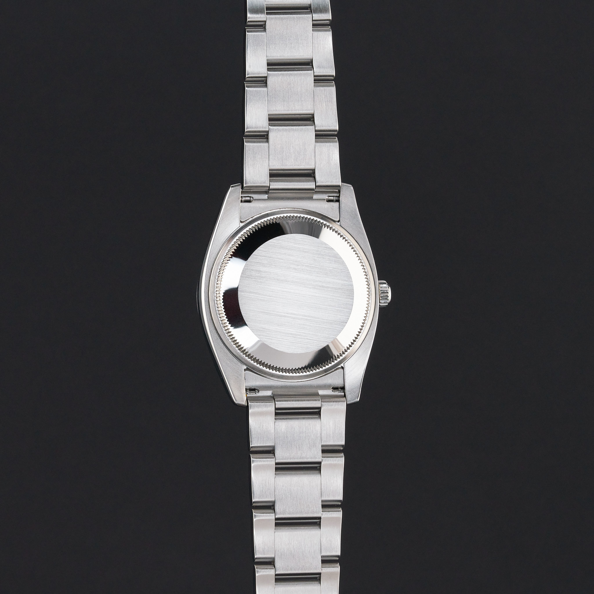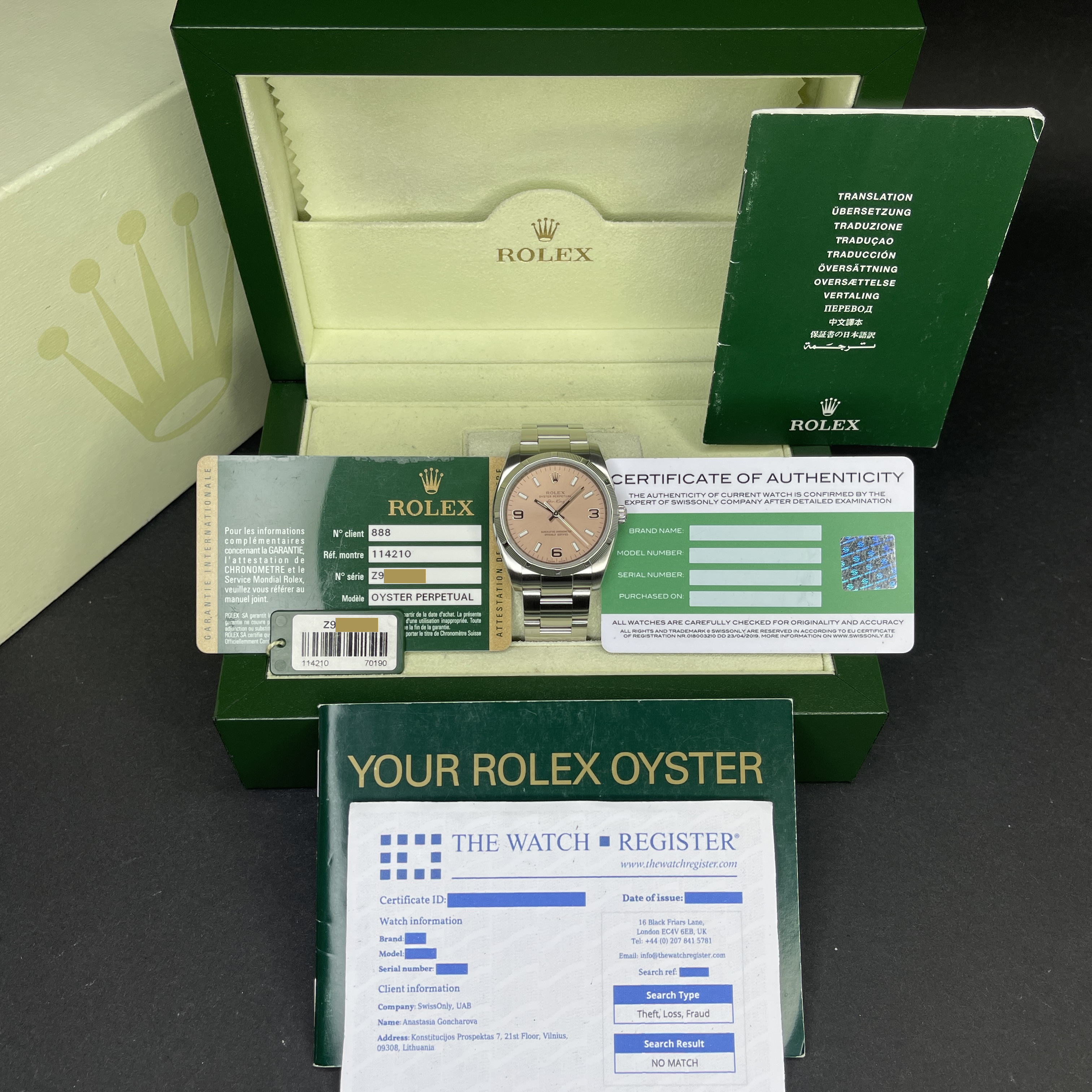 This Rolex Air-King 114210 features a Salmon Arabic dial and is crafted from stainless steel, with a production year of 2006.