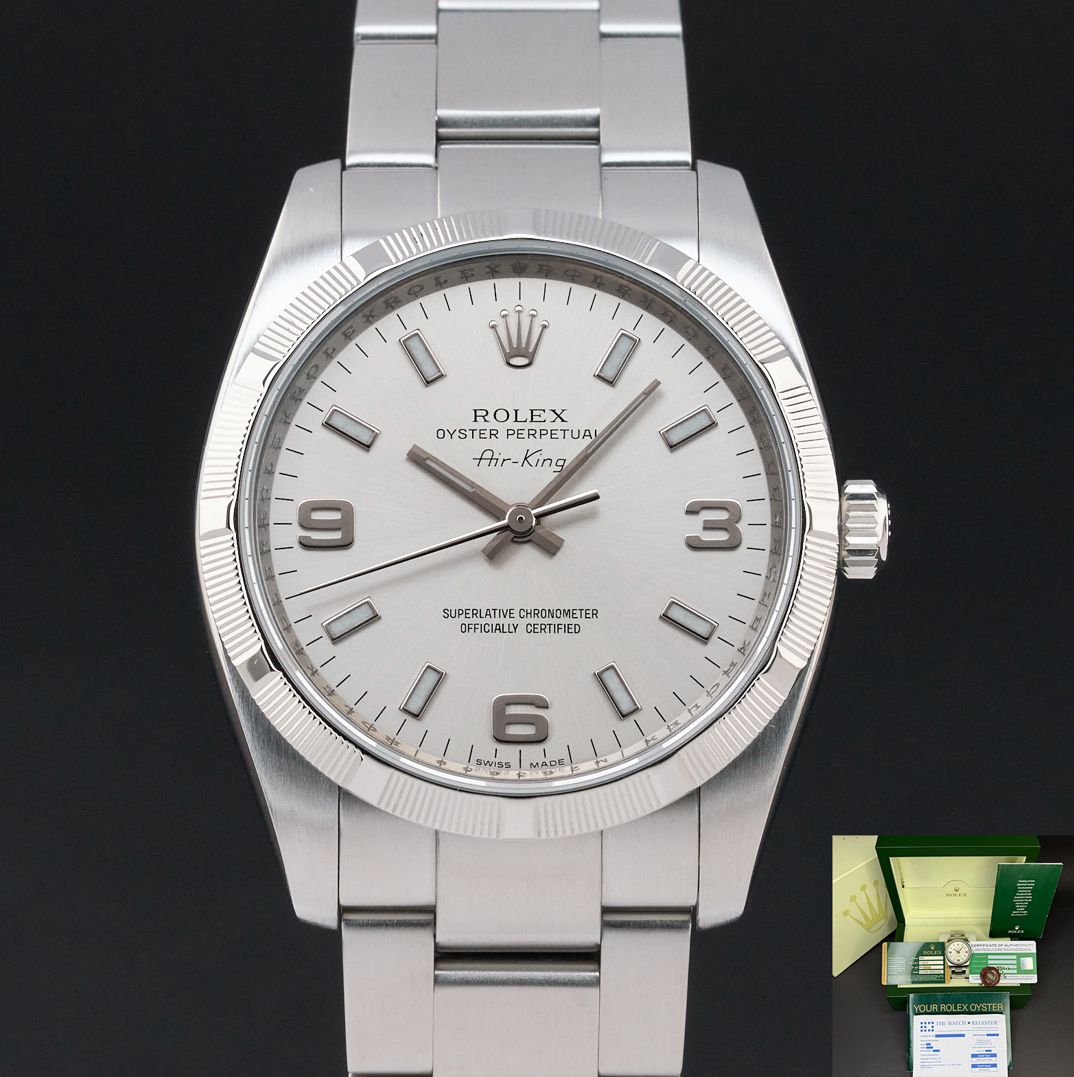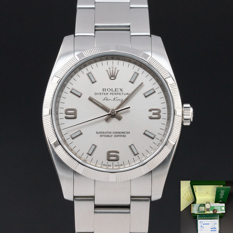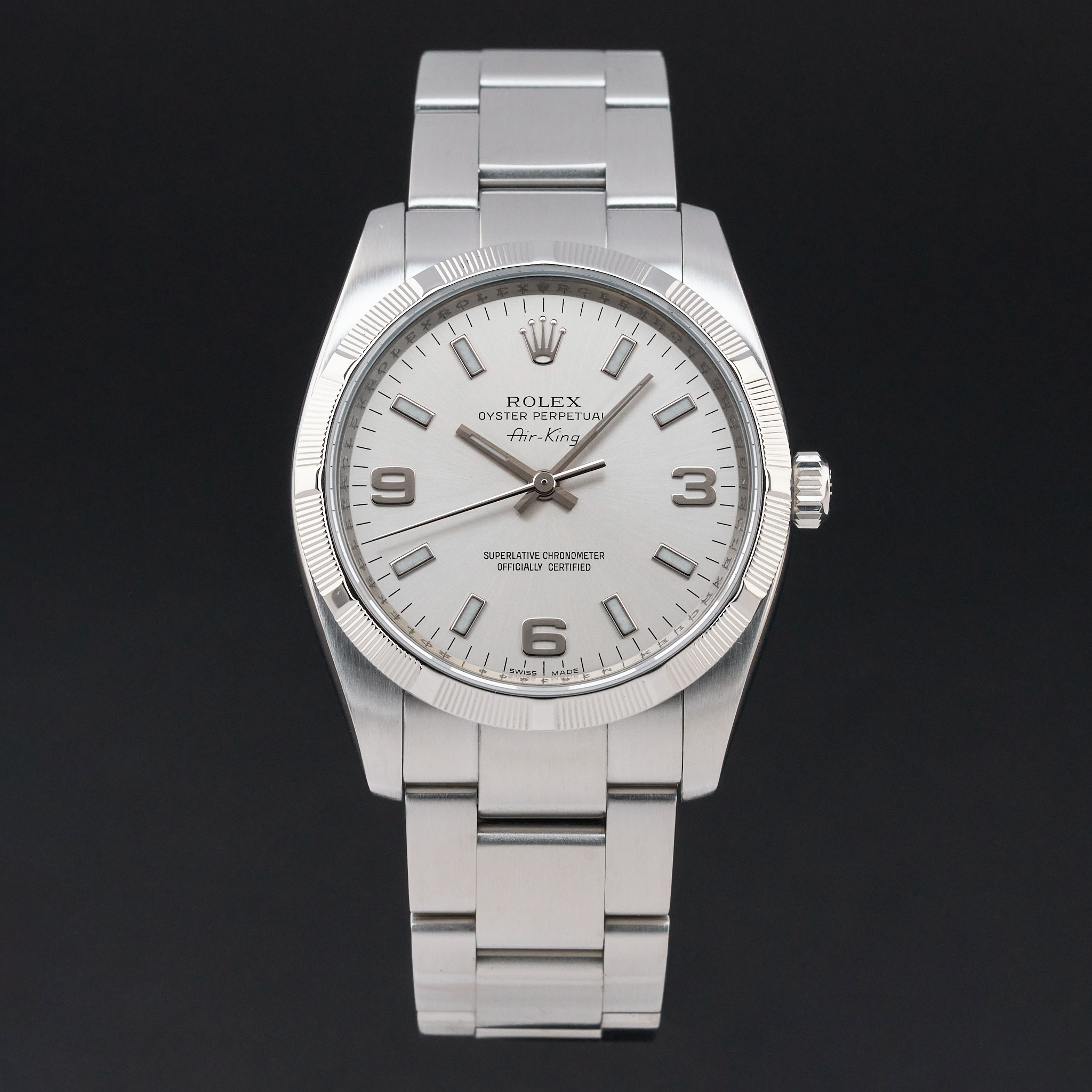 This Rolex Air-King 114210 features a Silver Arabic dial and is crafted from stainless steel, with a production year of 2008.