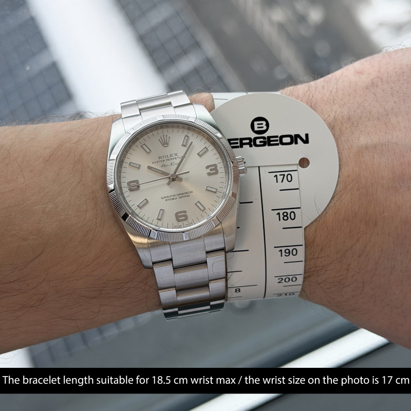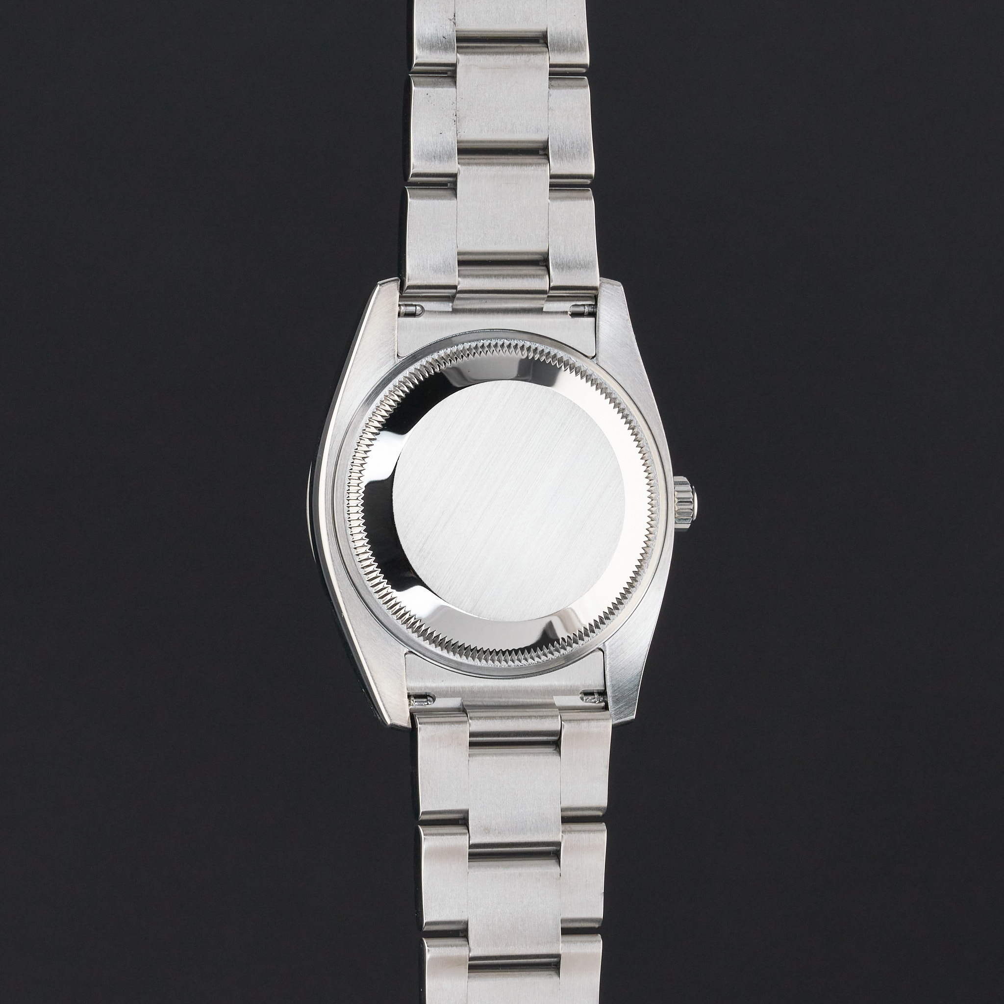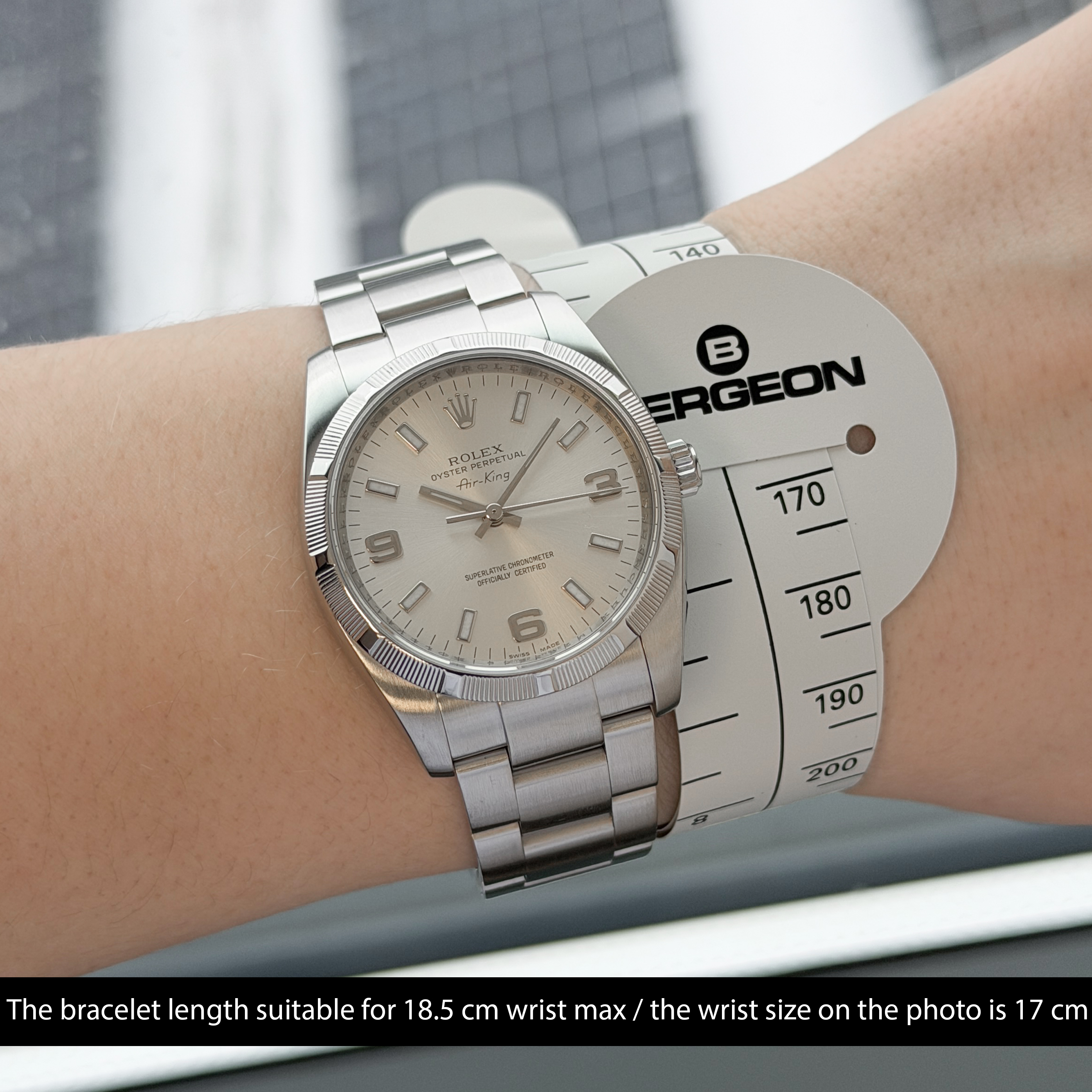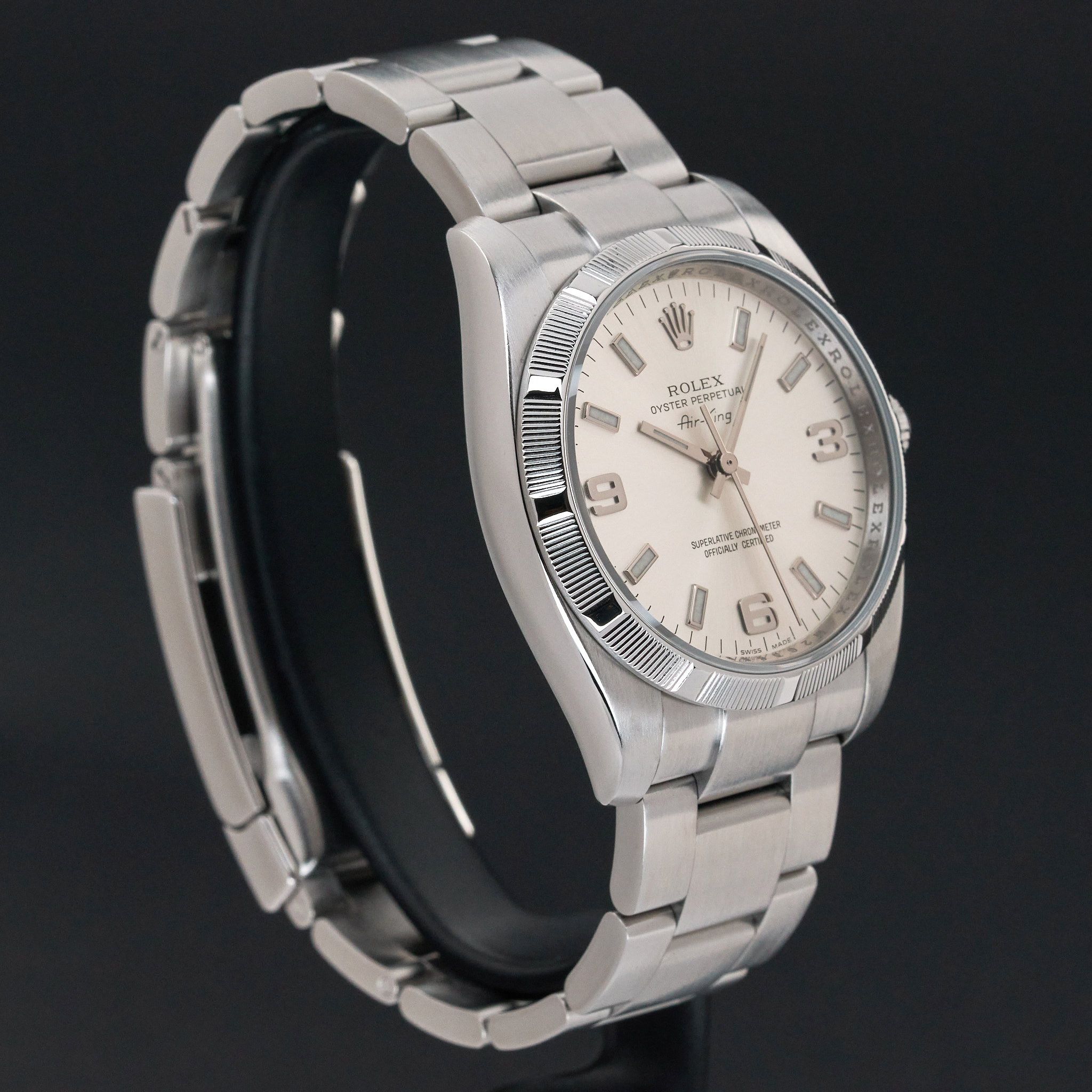 This Rolex Air-King 114210 features a Silver Arabic dial and is crafted from stainless steel, with a production year of 2008.