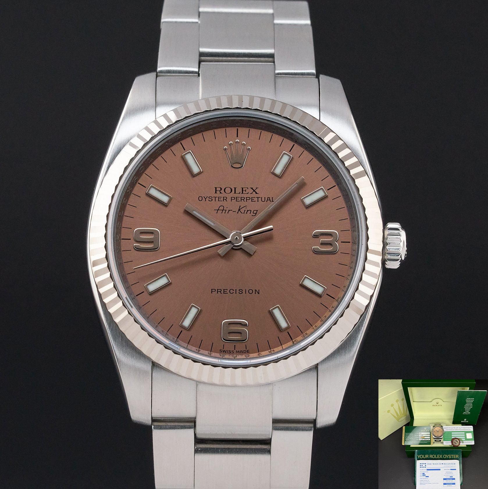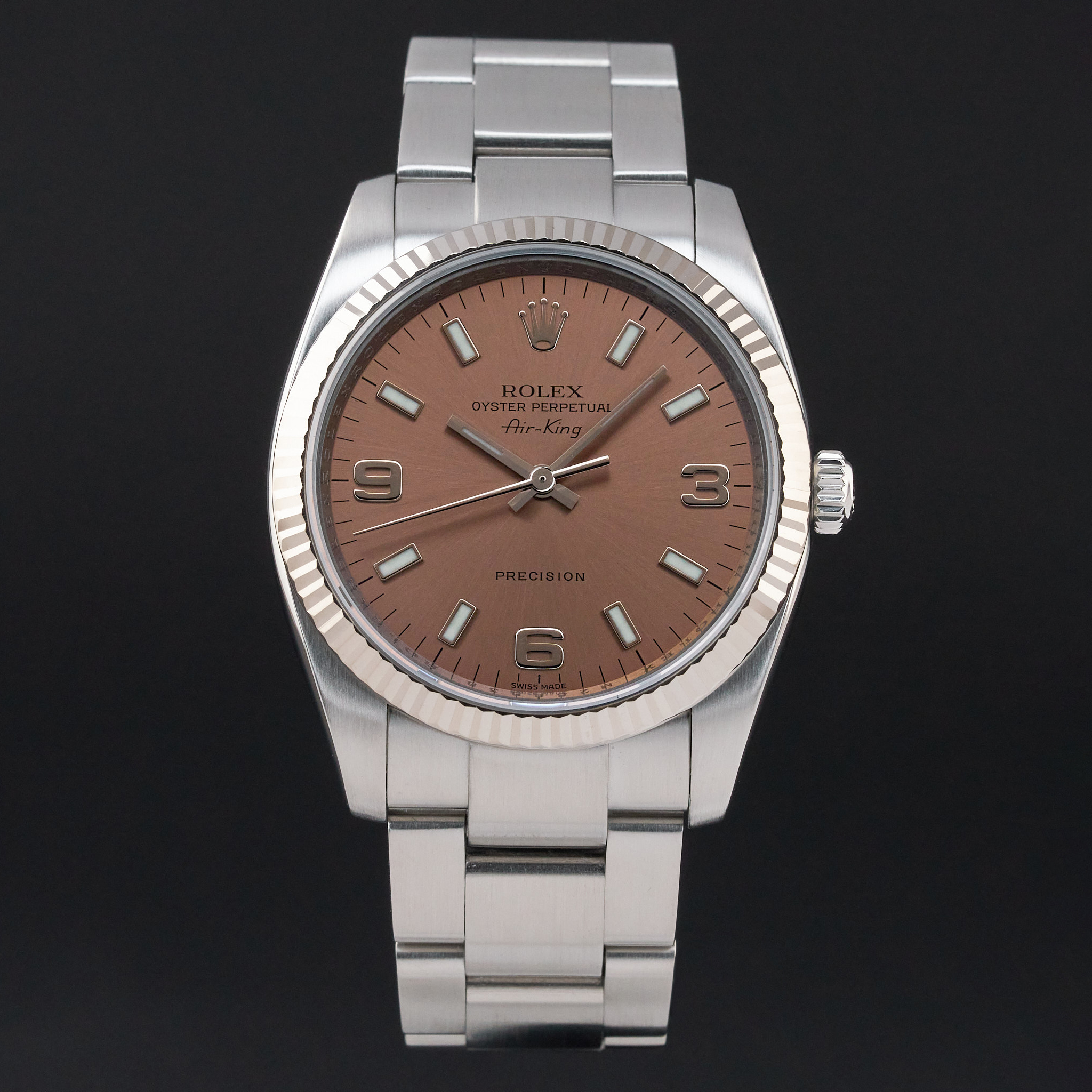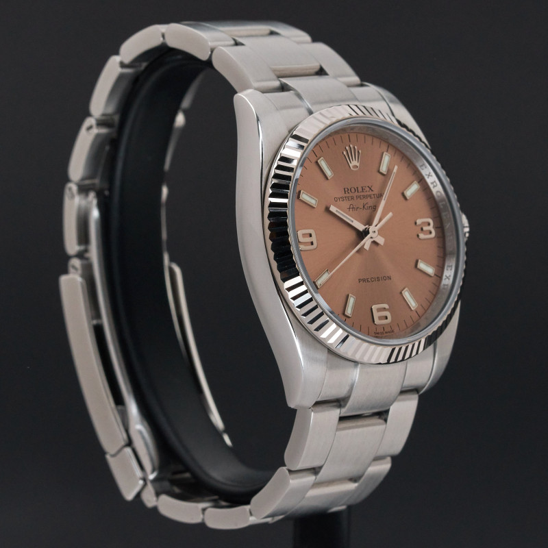 This Rolex Air-King 114234 features a Salmon Arabic dial and is crafted from stainless steel, with a production year of 2008.