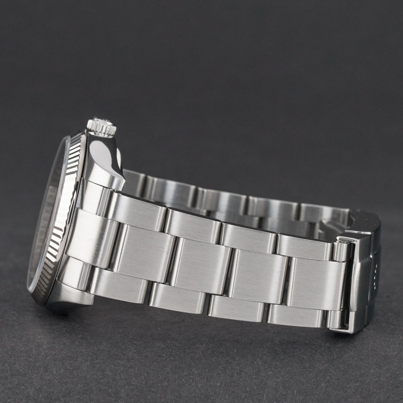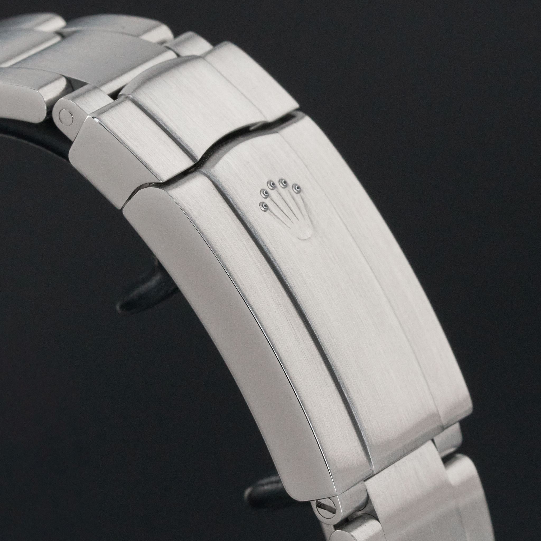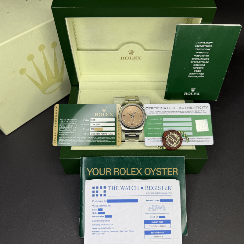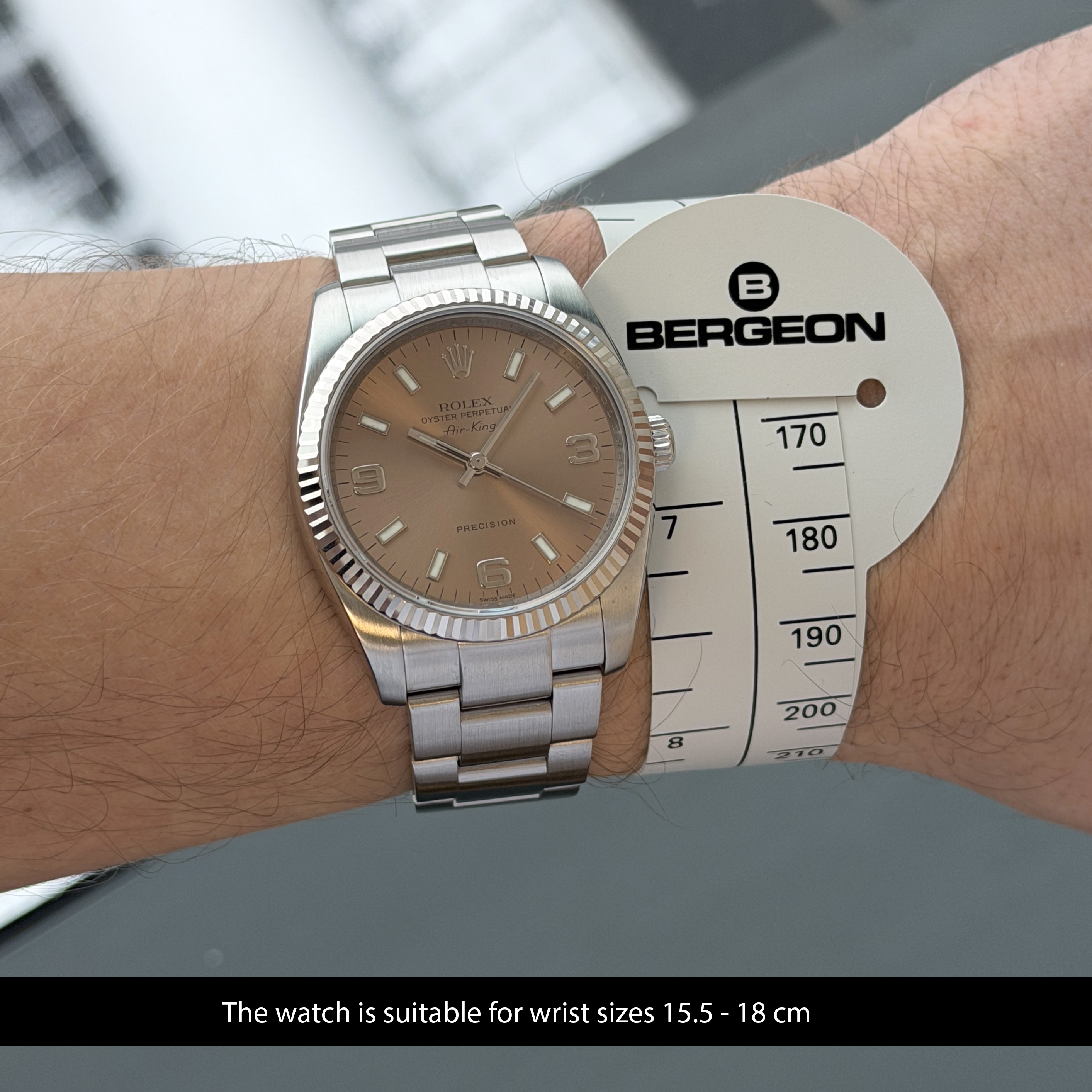 This Rolex Air-King 114234 features a Salmon Arabic dial and is crafted from stainless steel, with a production year of 2008.