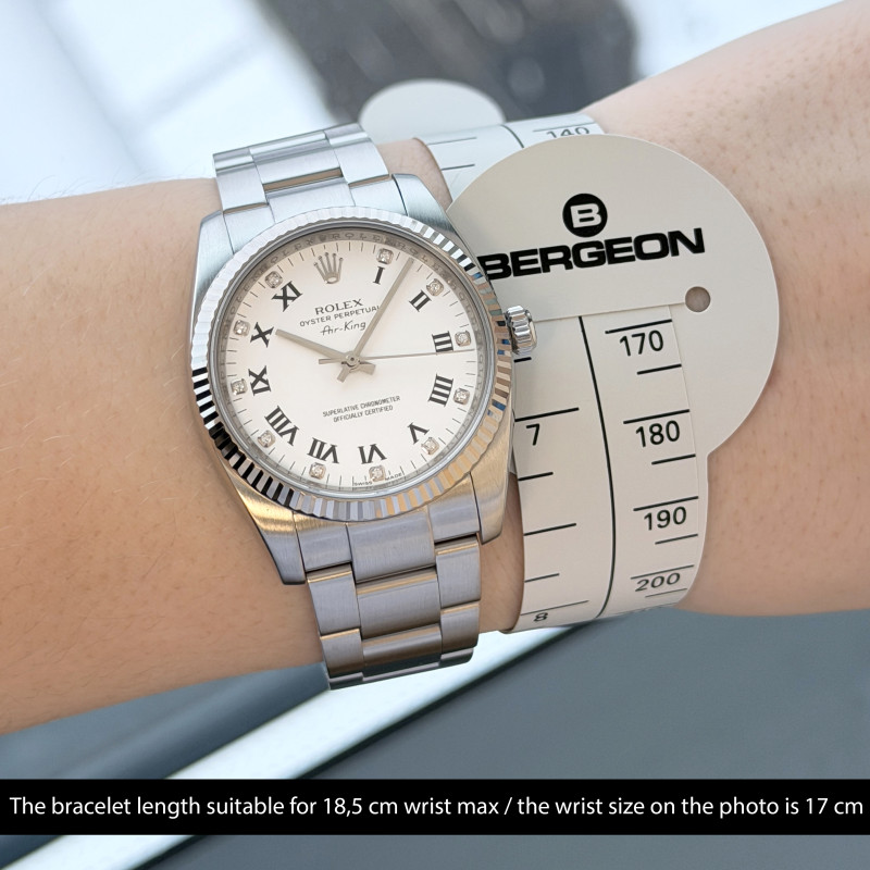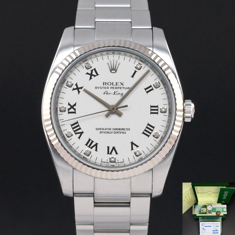 This Rolex Air-King 114234 features a White diamond Roman dial and is crafted from stainless steel, with a production year of 2009.
