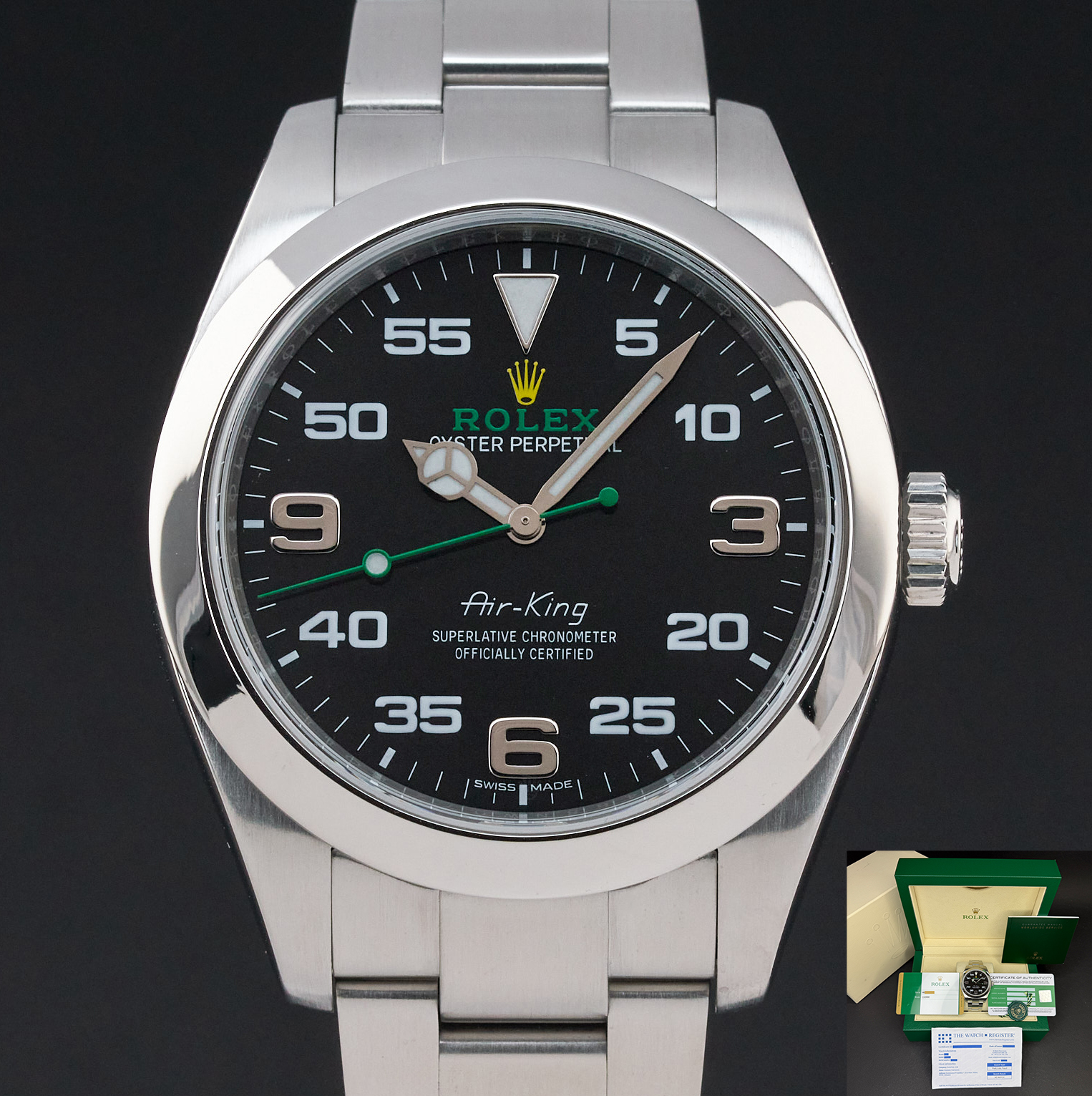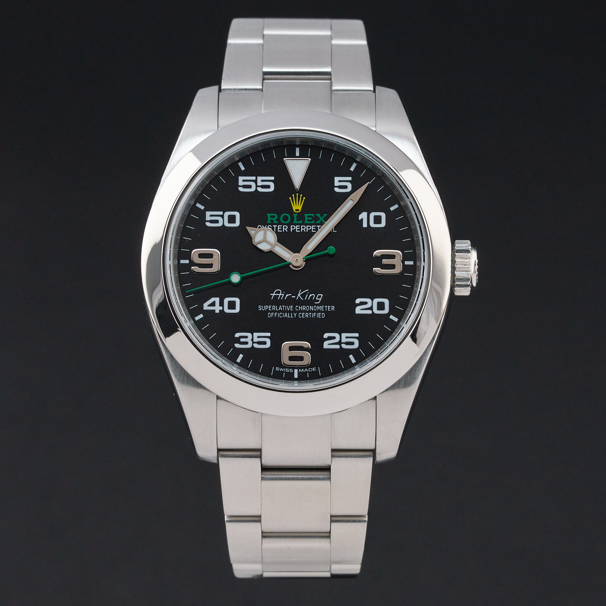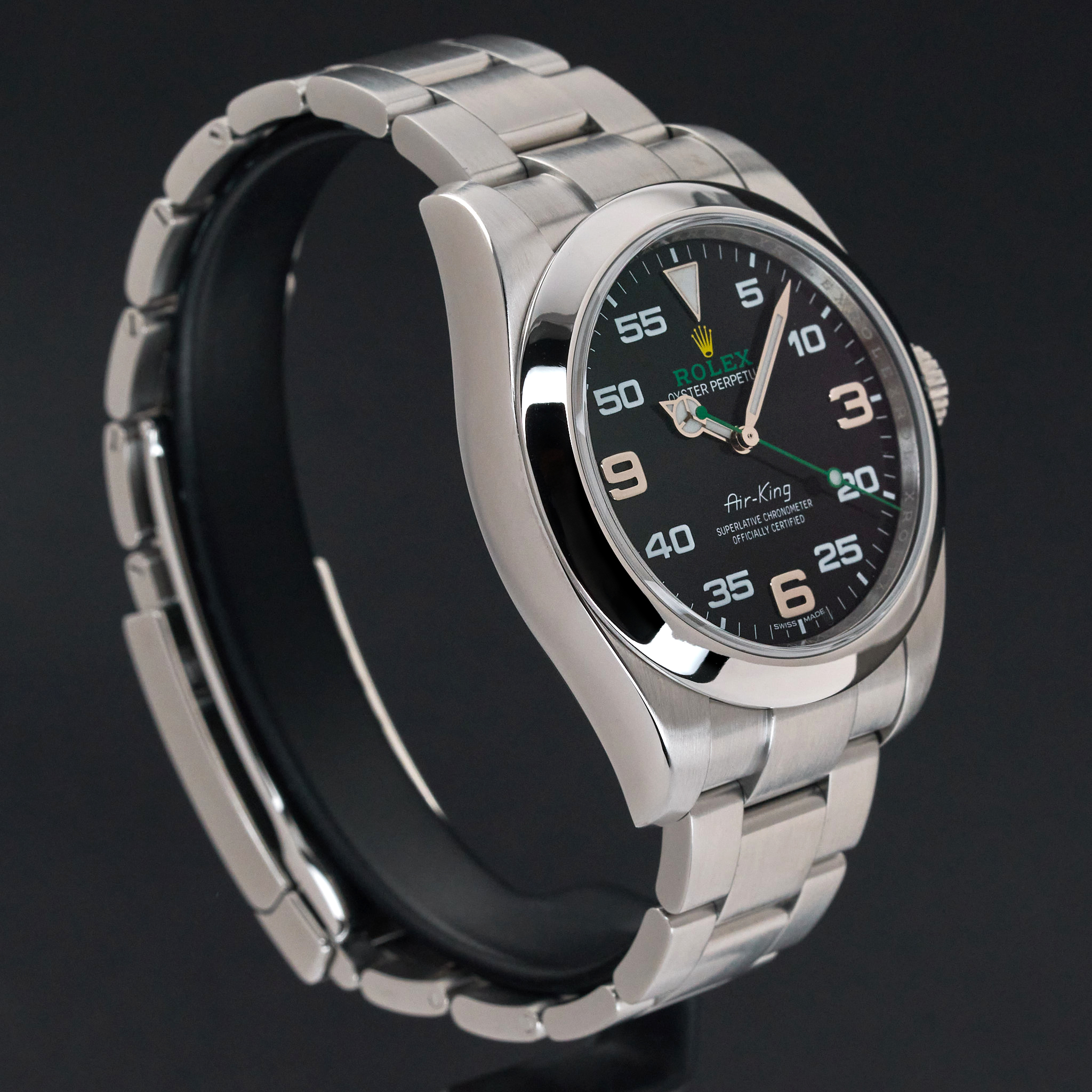 This Rolex Air-King 116900 features a Black Arabic dial and is crafted from stainless steel, with a production year of 2019.
