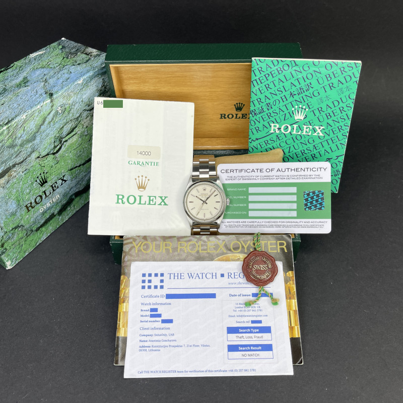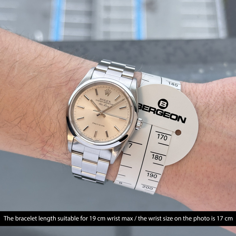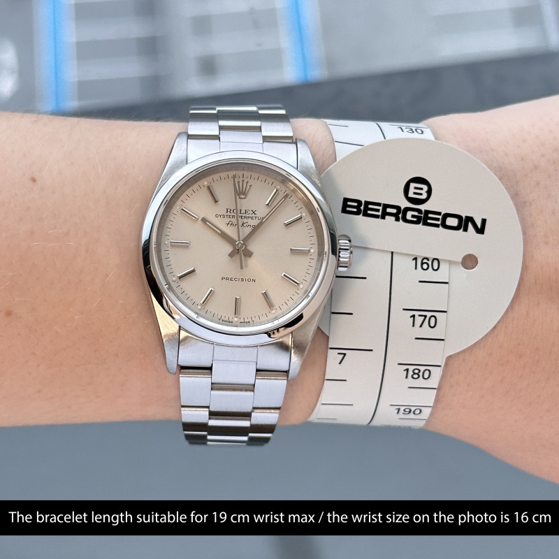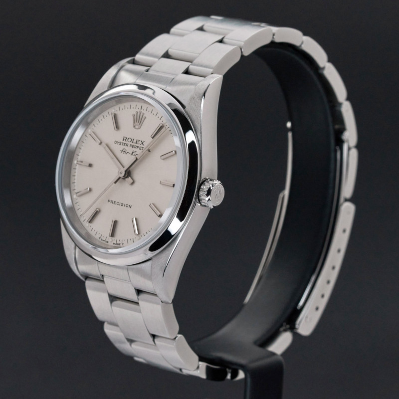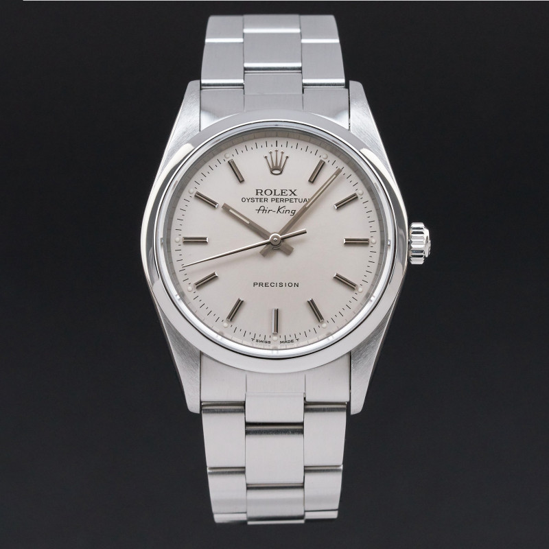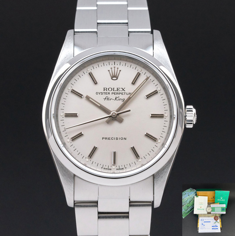 This Rolex Air-King 14000 features a Silver dial and is crafted from stainless steel, with a production year of 1998.