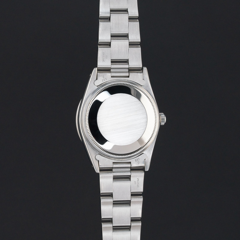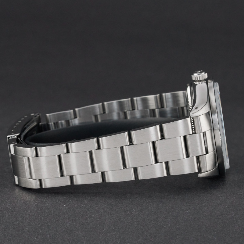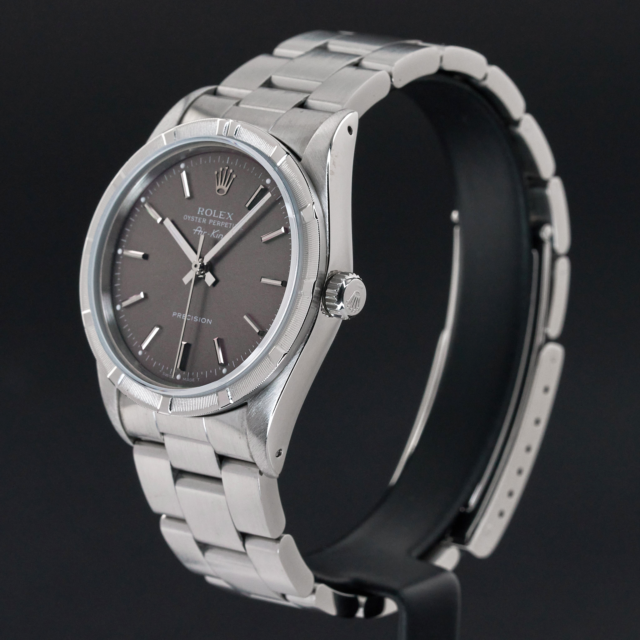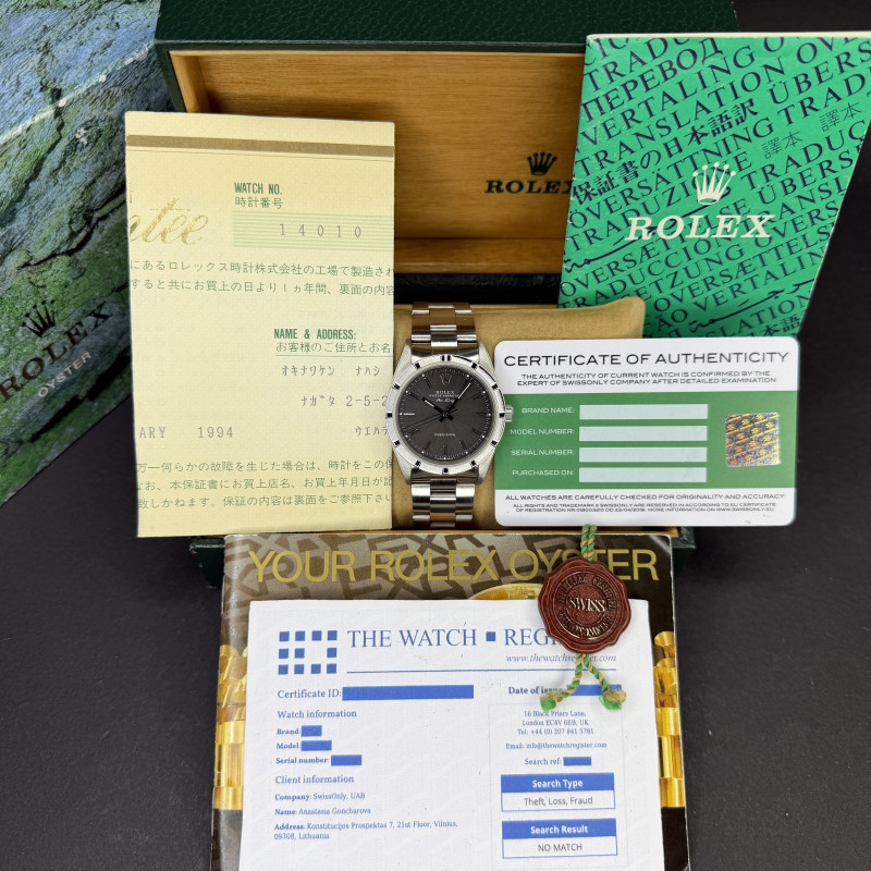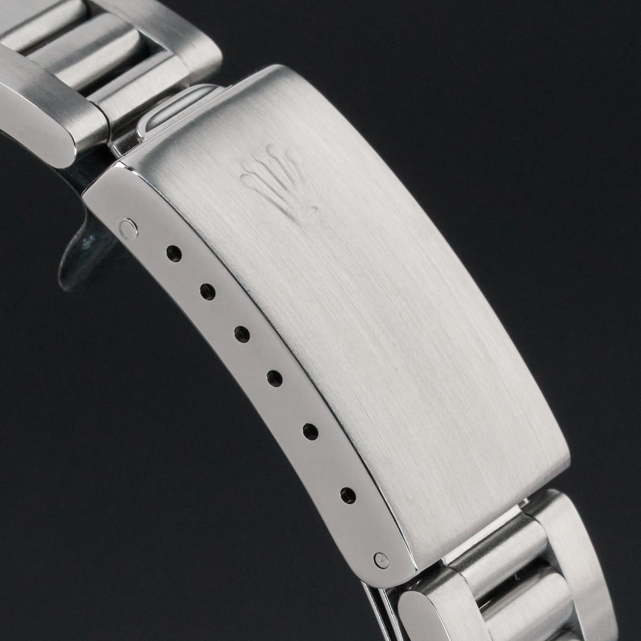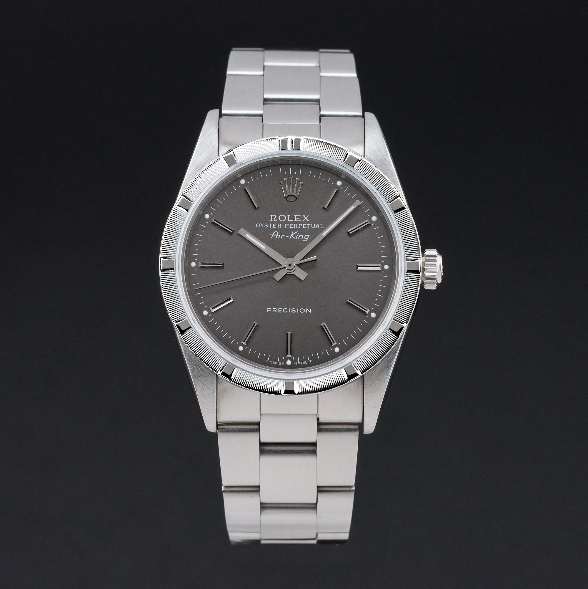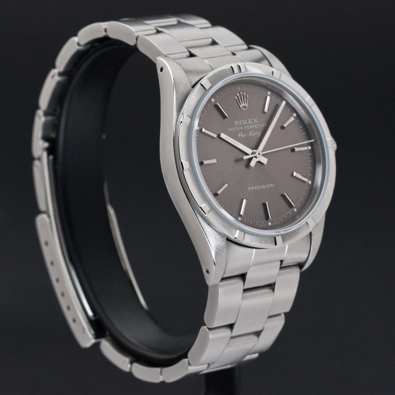 This Rolex Air-King 14010 features a Grey dial and is crafted from stainless steel, with a production year of 1991.