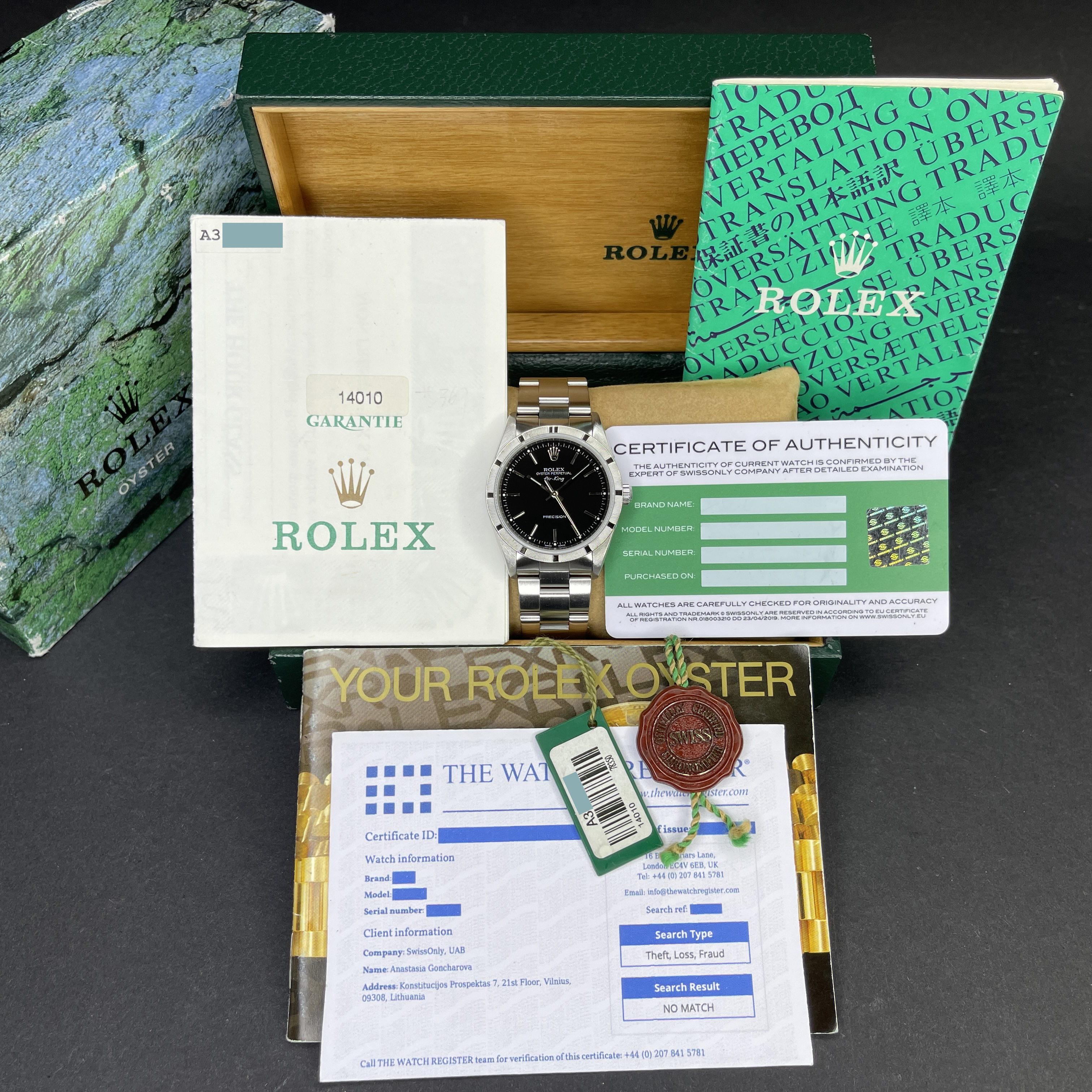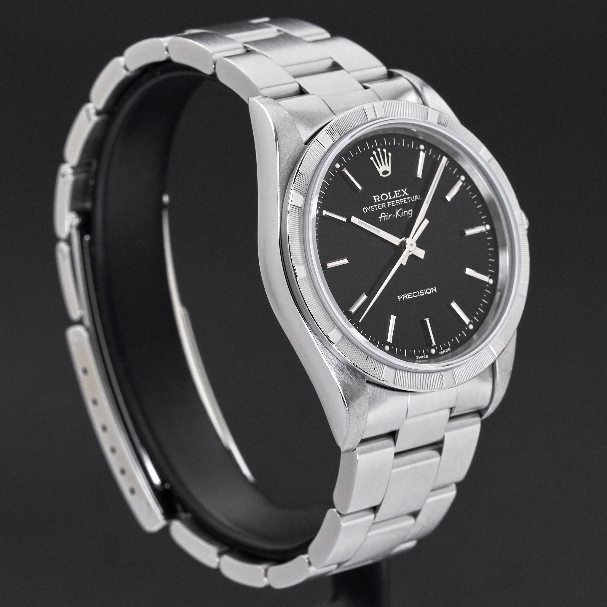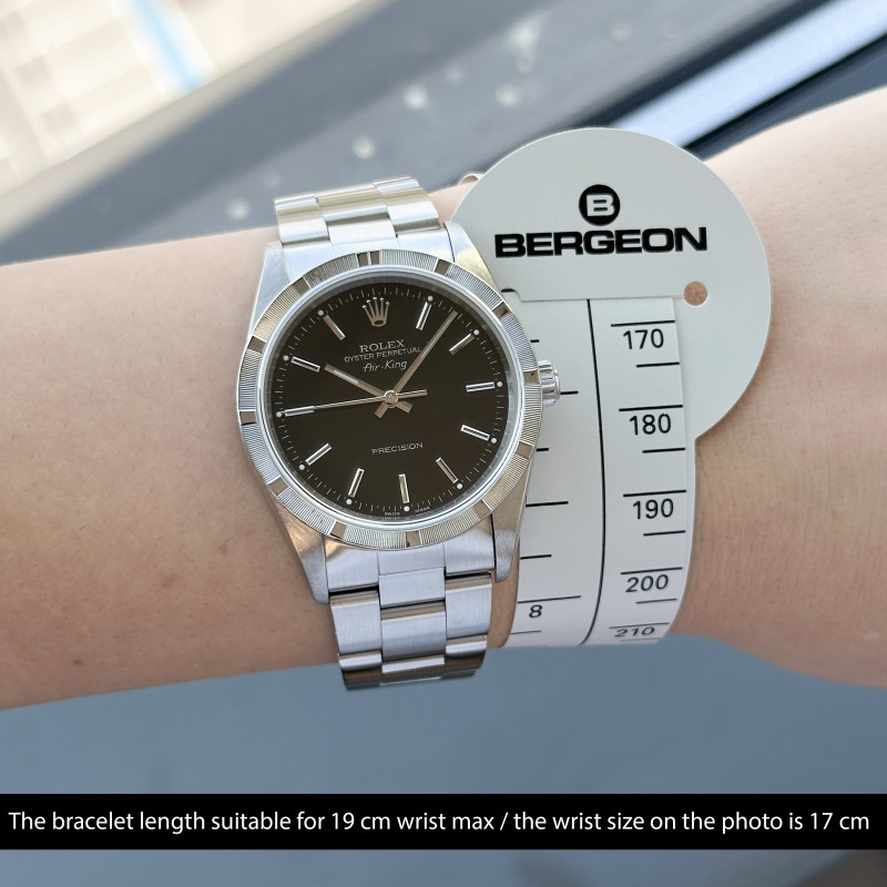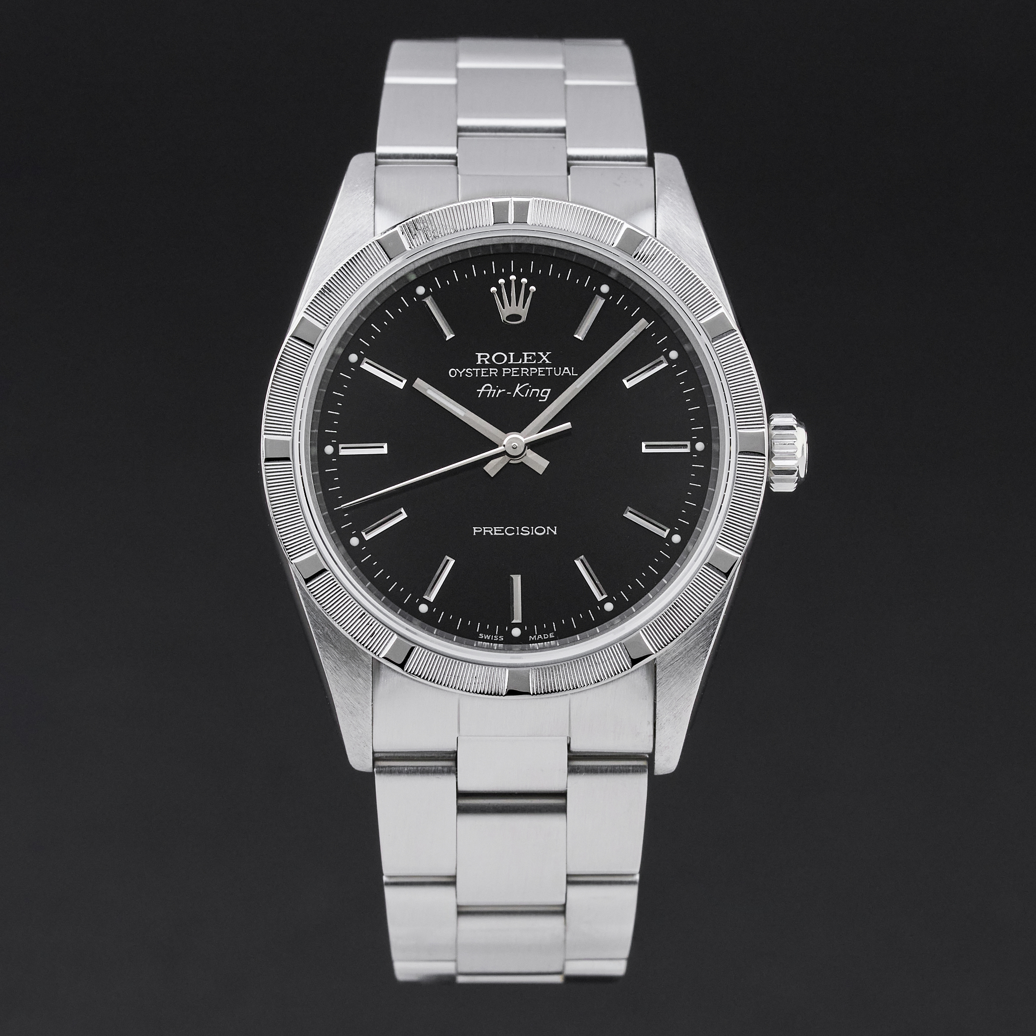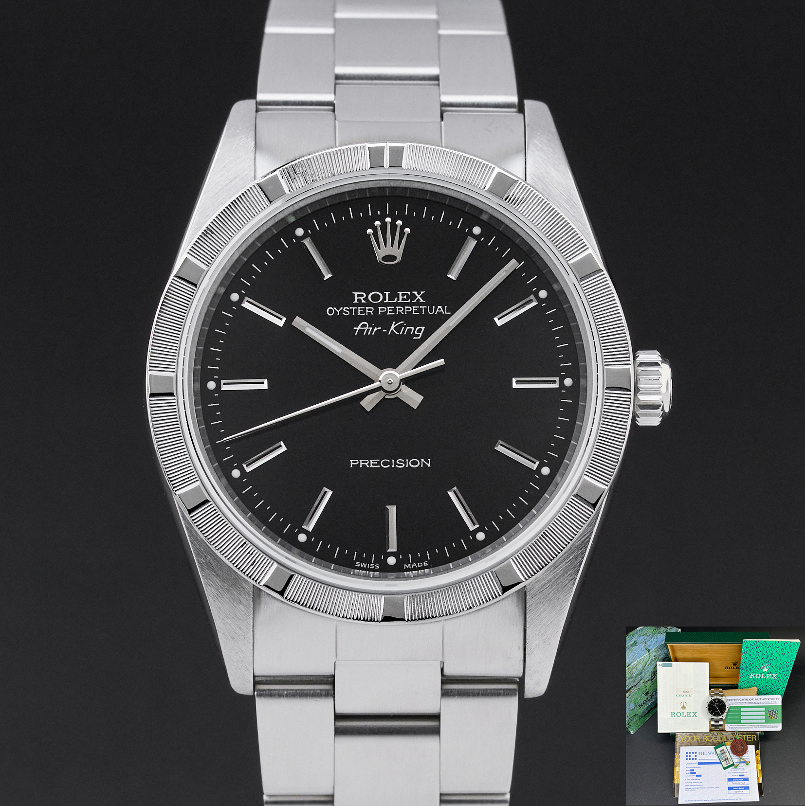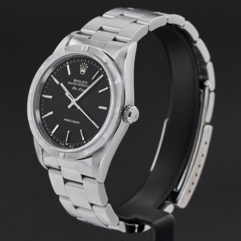 This Rolex Air-King 14010 features a Black dial and is crafted from stainless steel, with a production year of 1999.