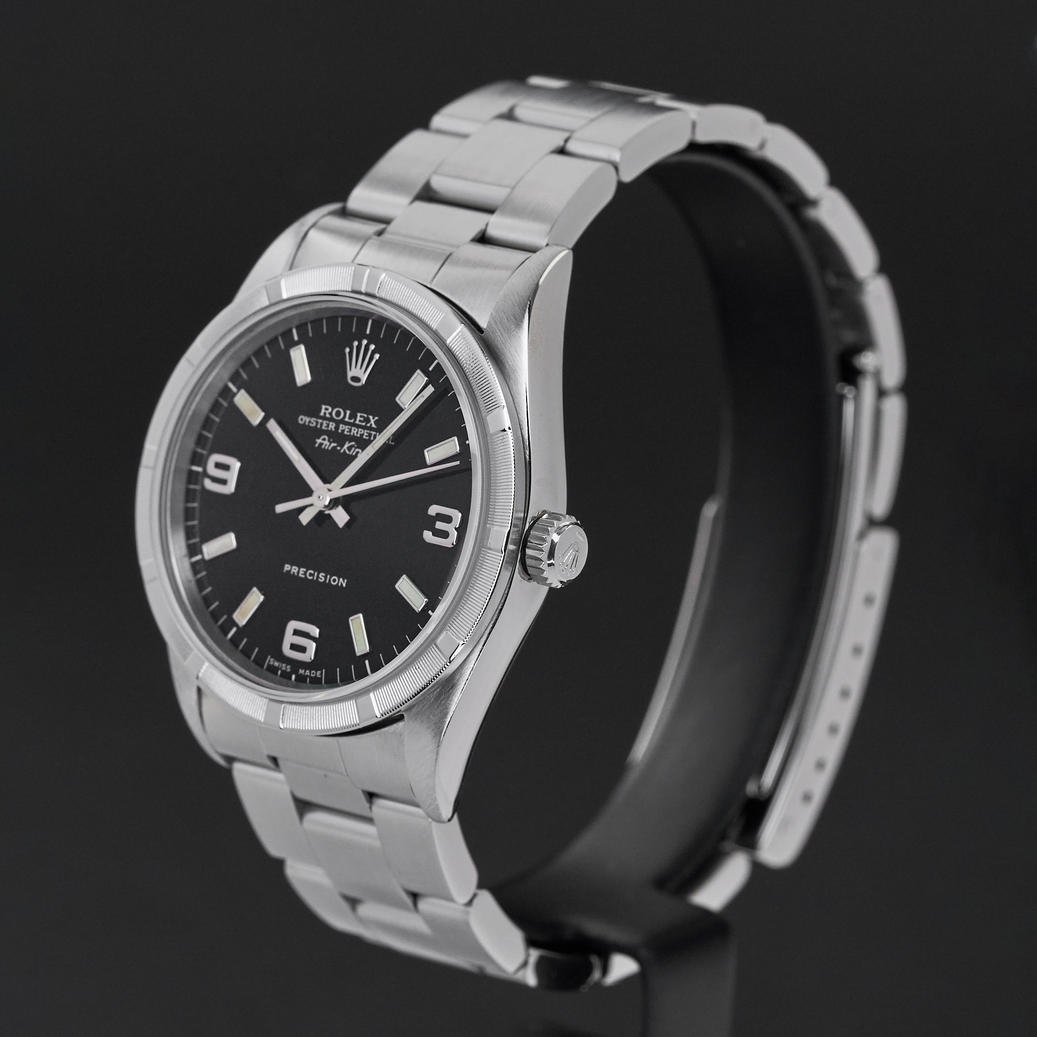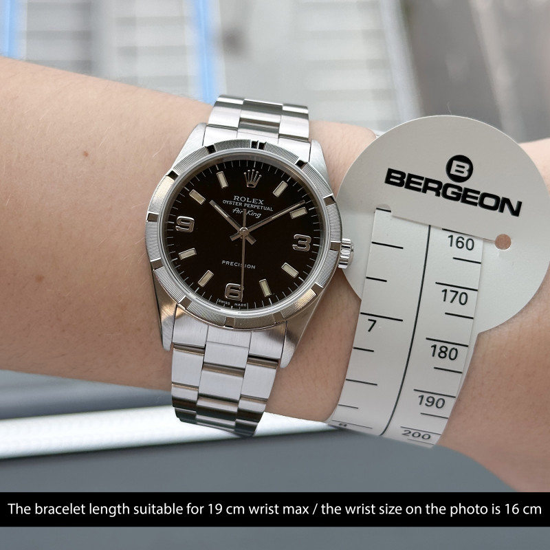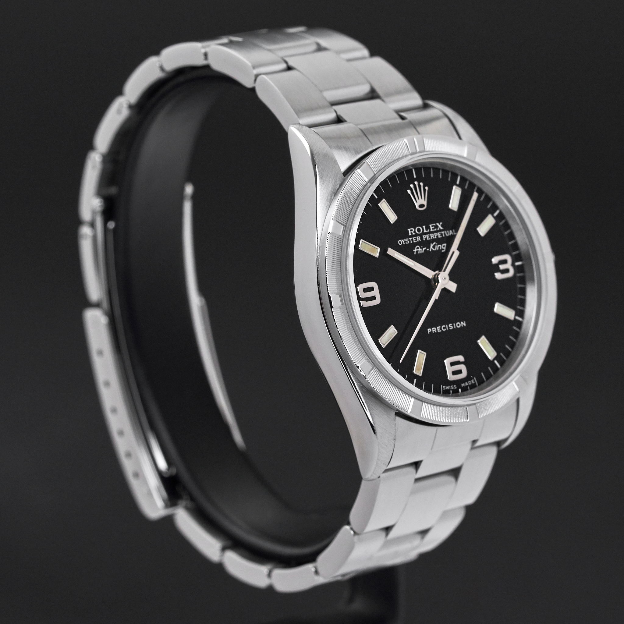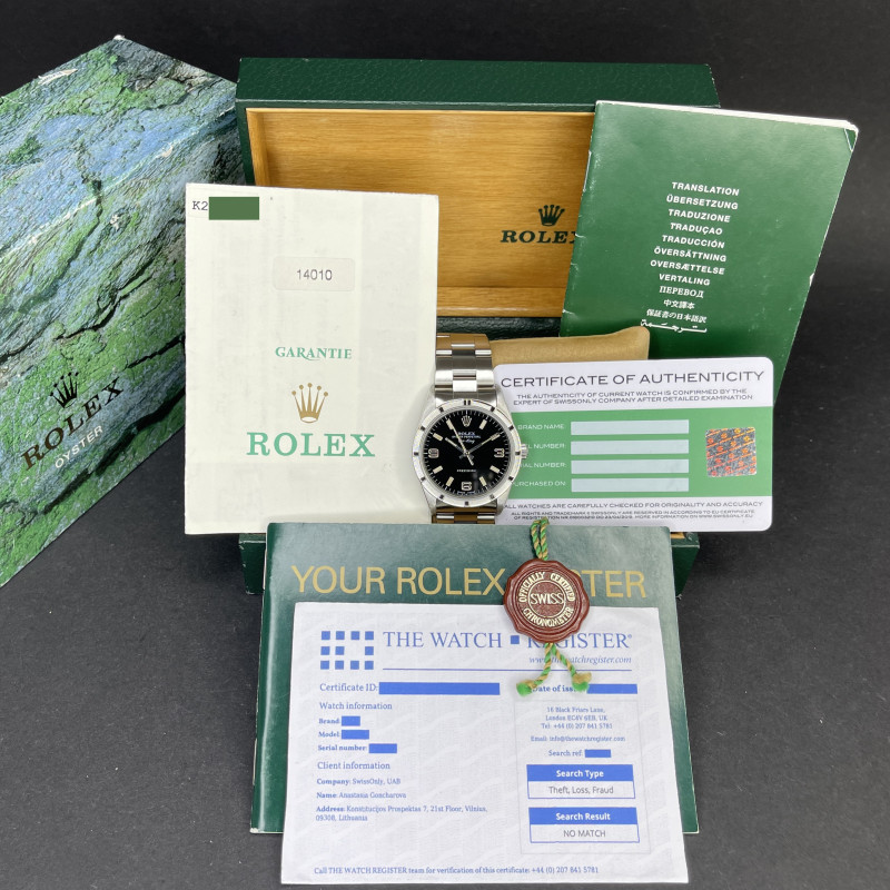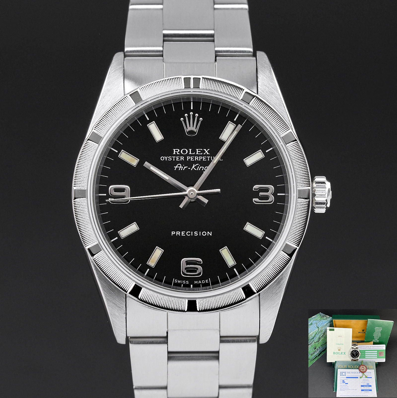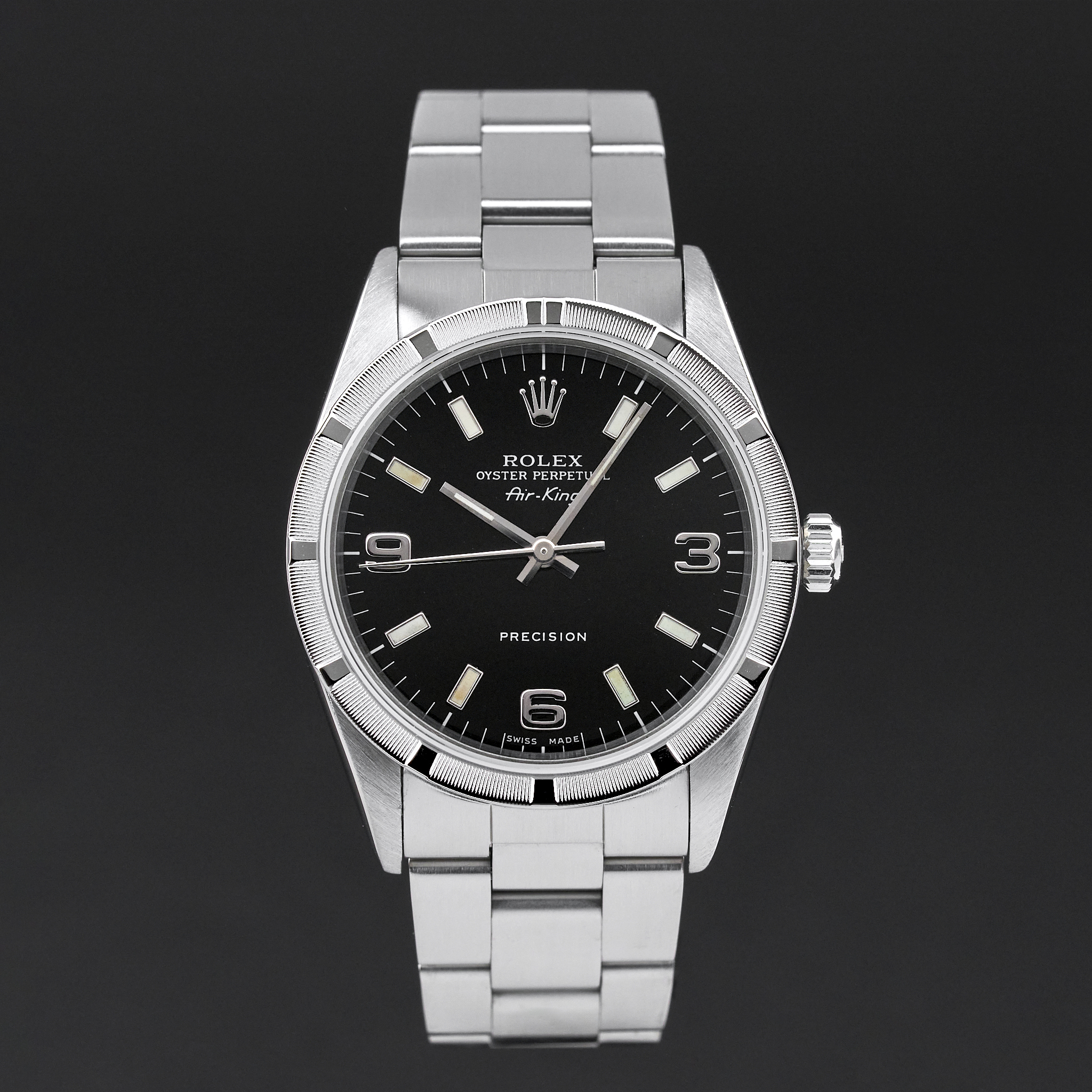 This Rolex Air-King 14010 features a Black Arabic dial and is crafted from stainless steel, with a production year of 2001.