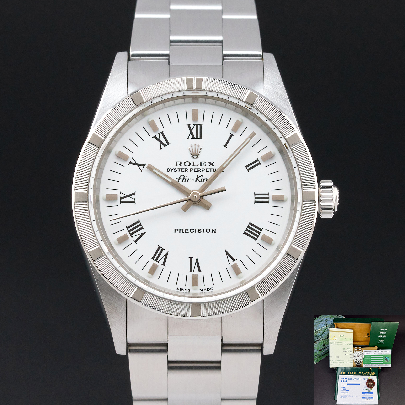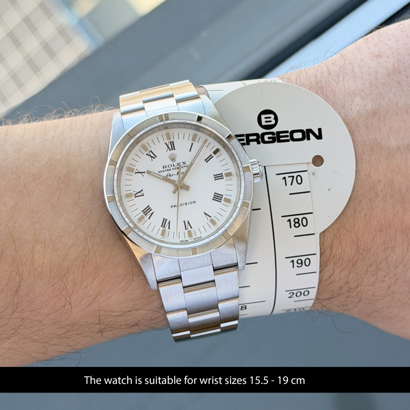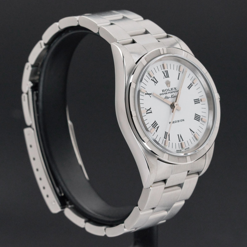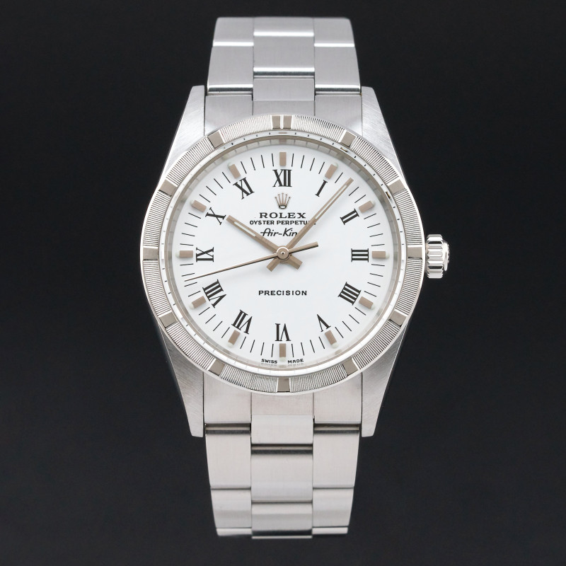 This Rolex Air-King 14010 features a White Roman dial and is crafted from stainless steel, with a production year of 2001.