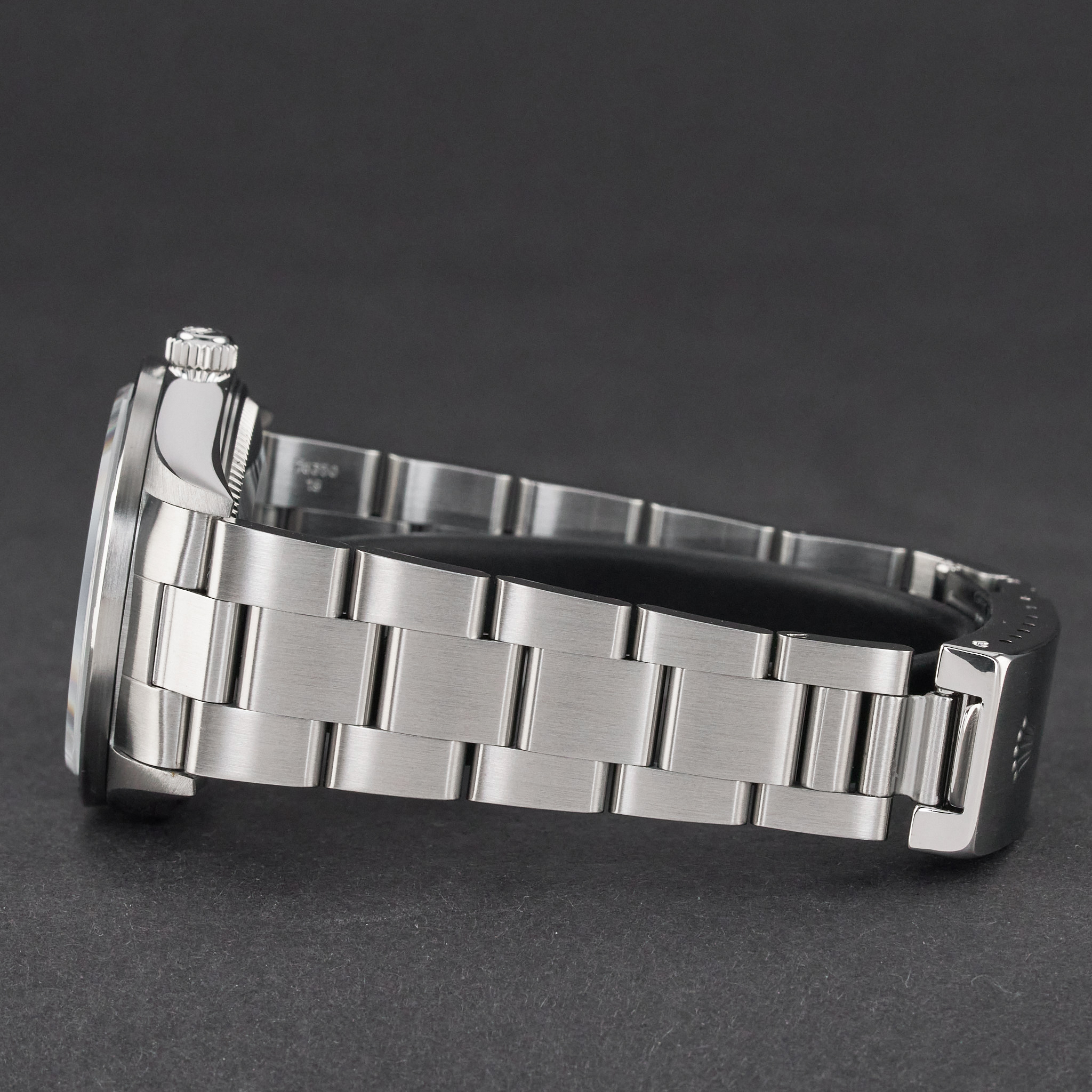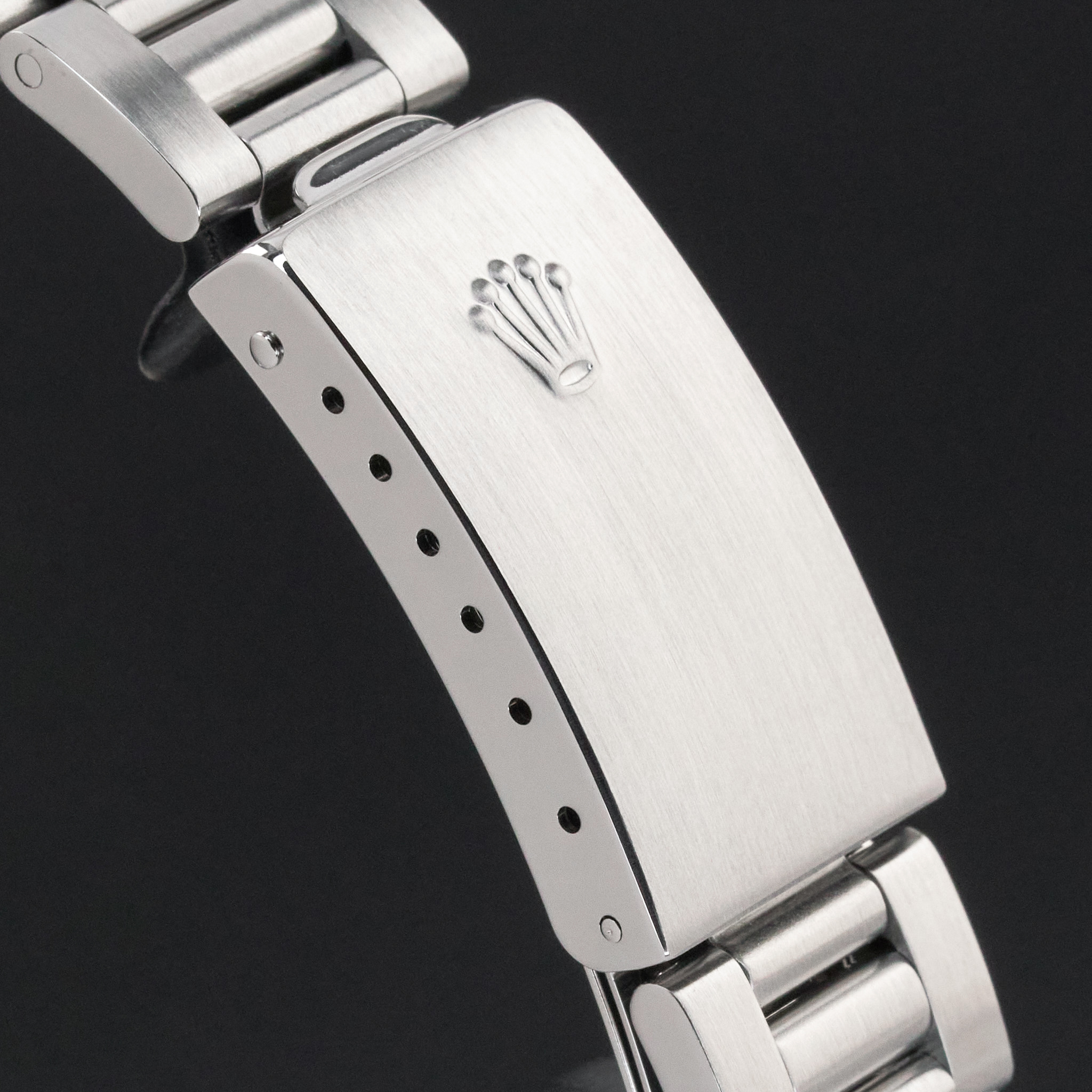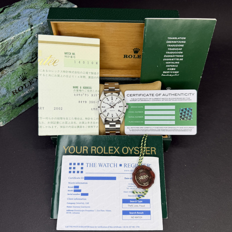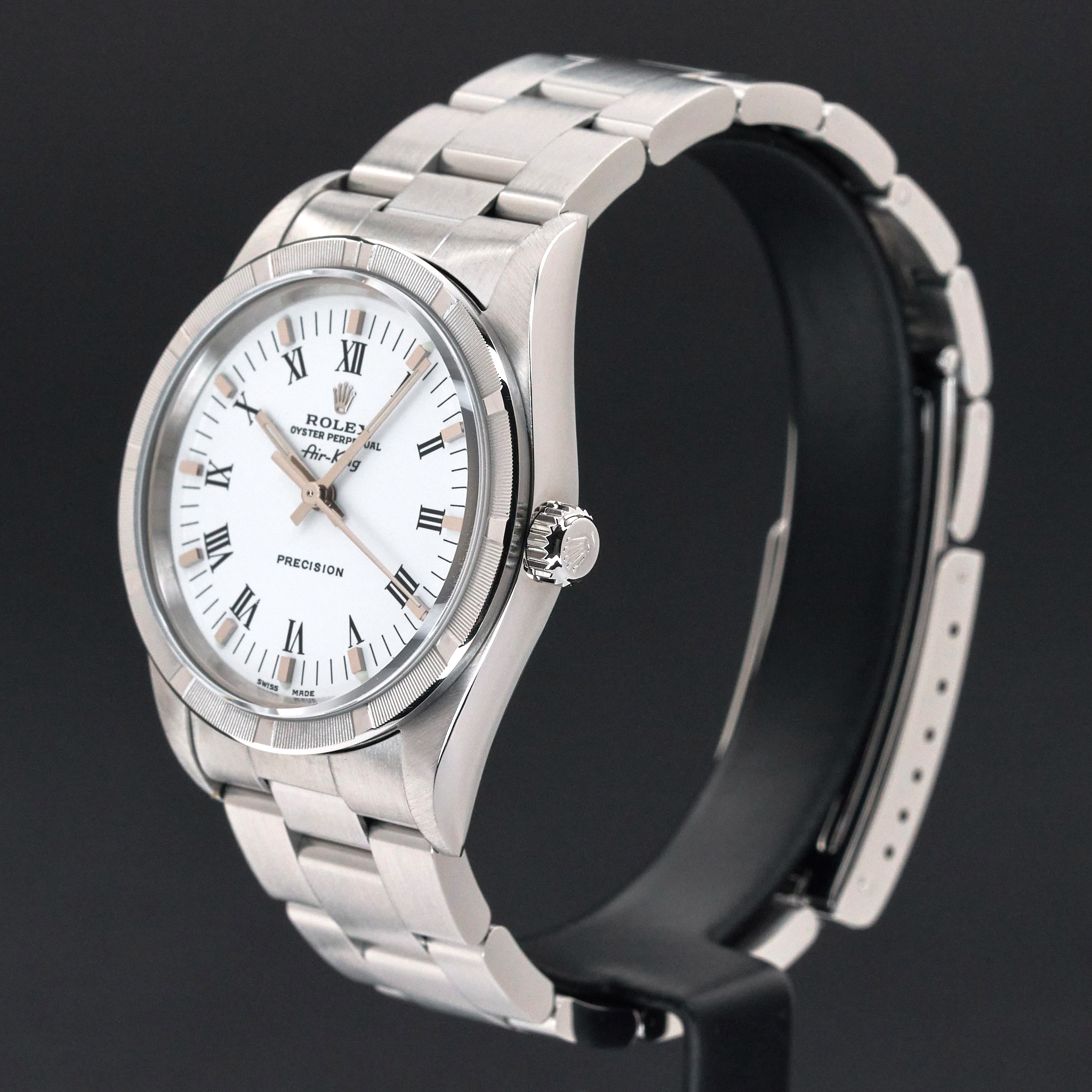 This Rolex Air-King 14010 features a White Roman dial and is crafted from stainless steel, with a production year of 2001.