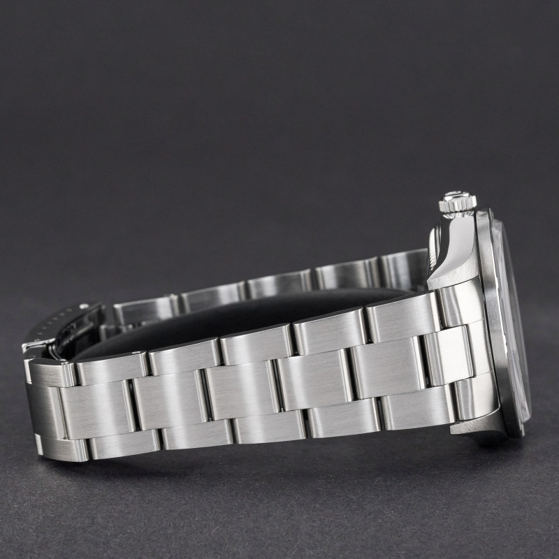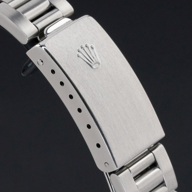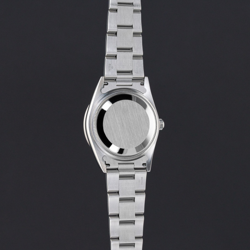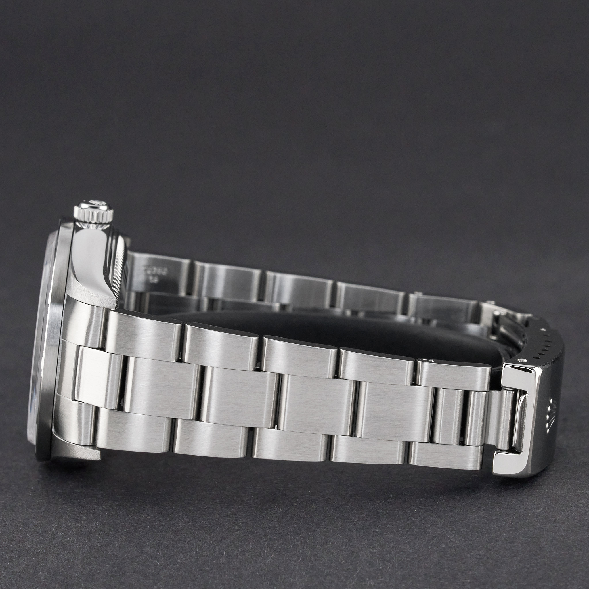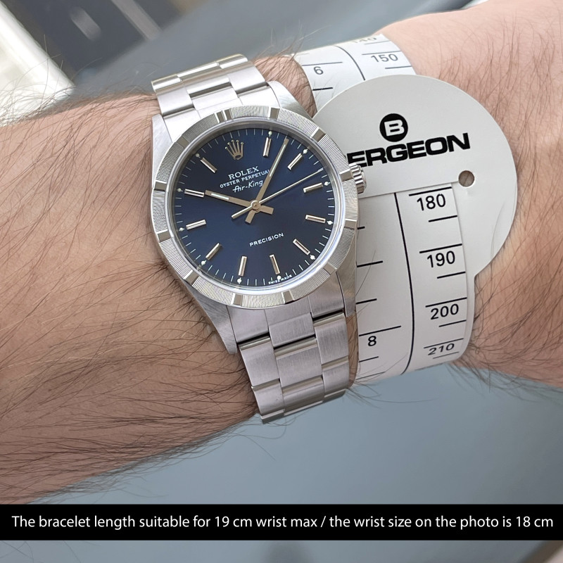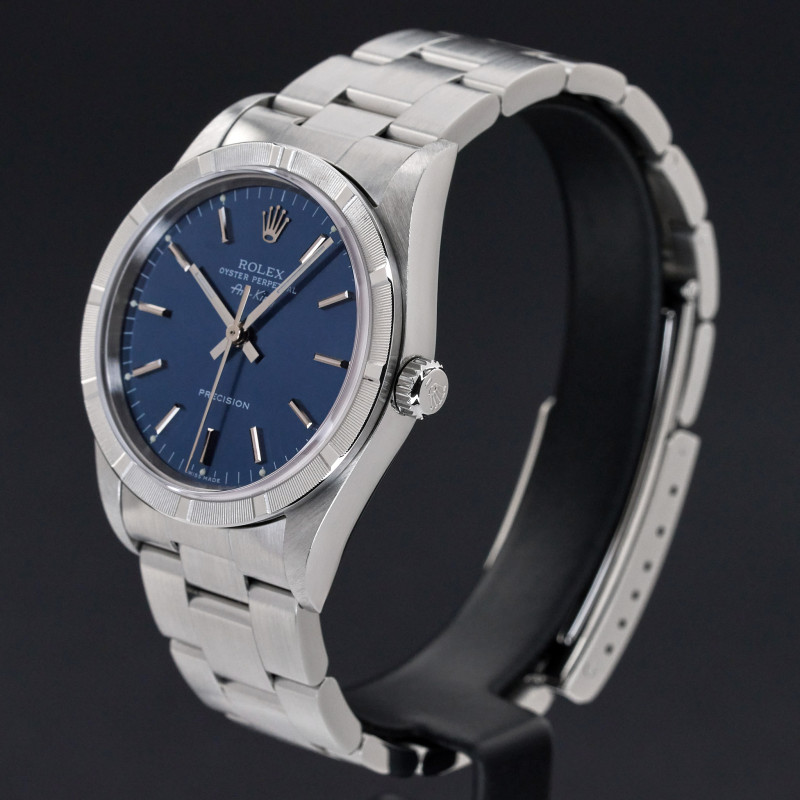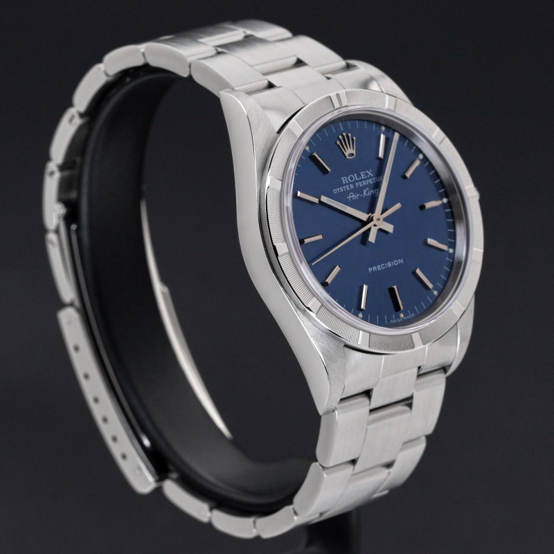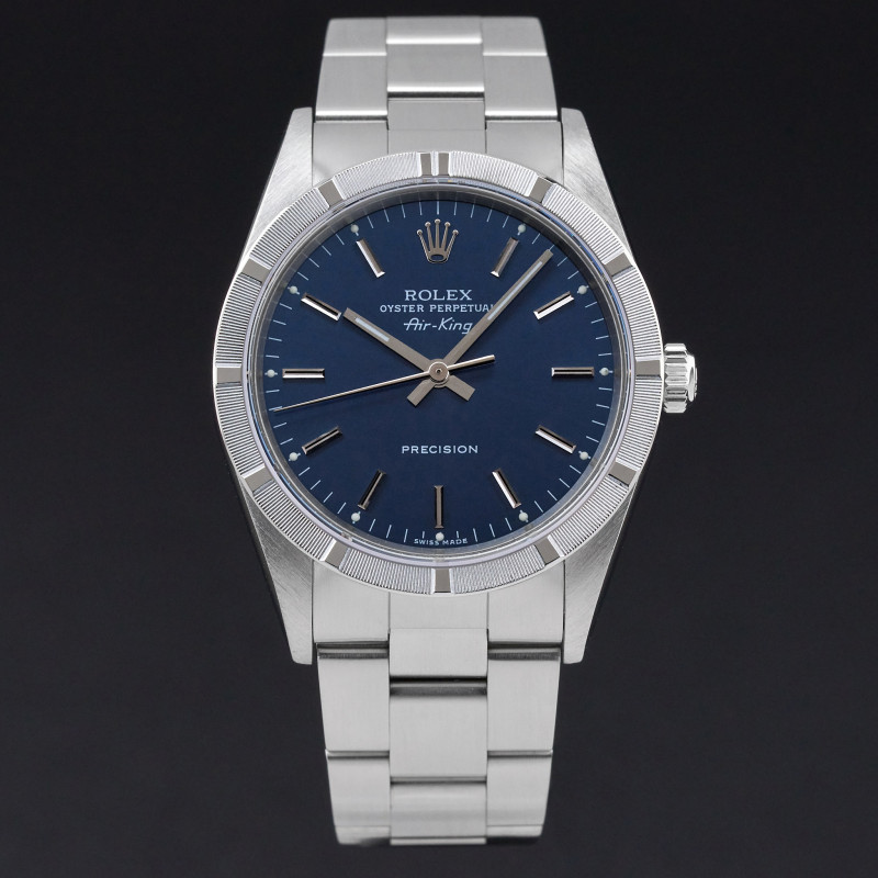This Rolex Air-King 14010 features a Blue dial and is crafted from stainless steel, with a production year of 2002.