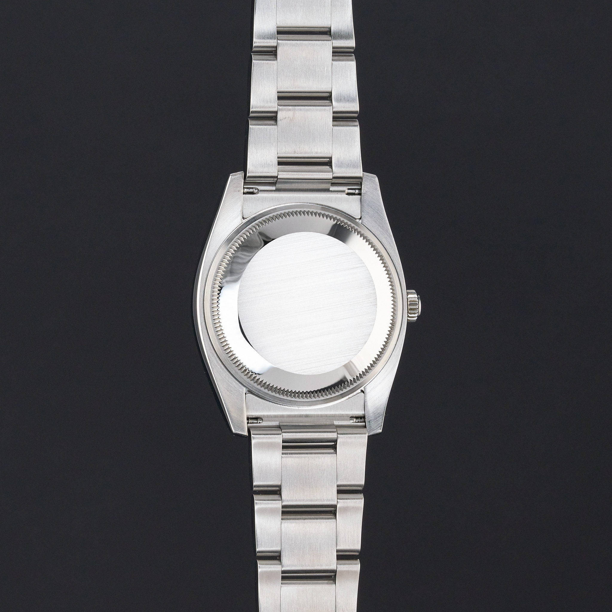 This Rolex Oyster Perpetual Date 115200 features a Blue dial and is crafted from stainless steel.