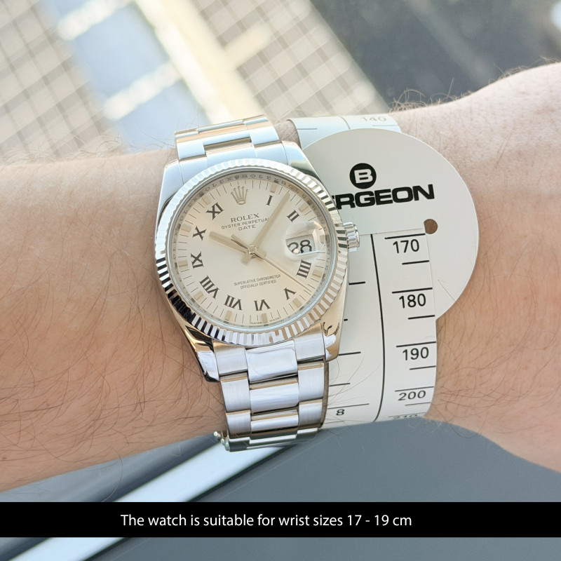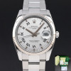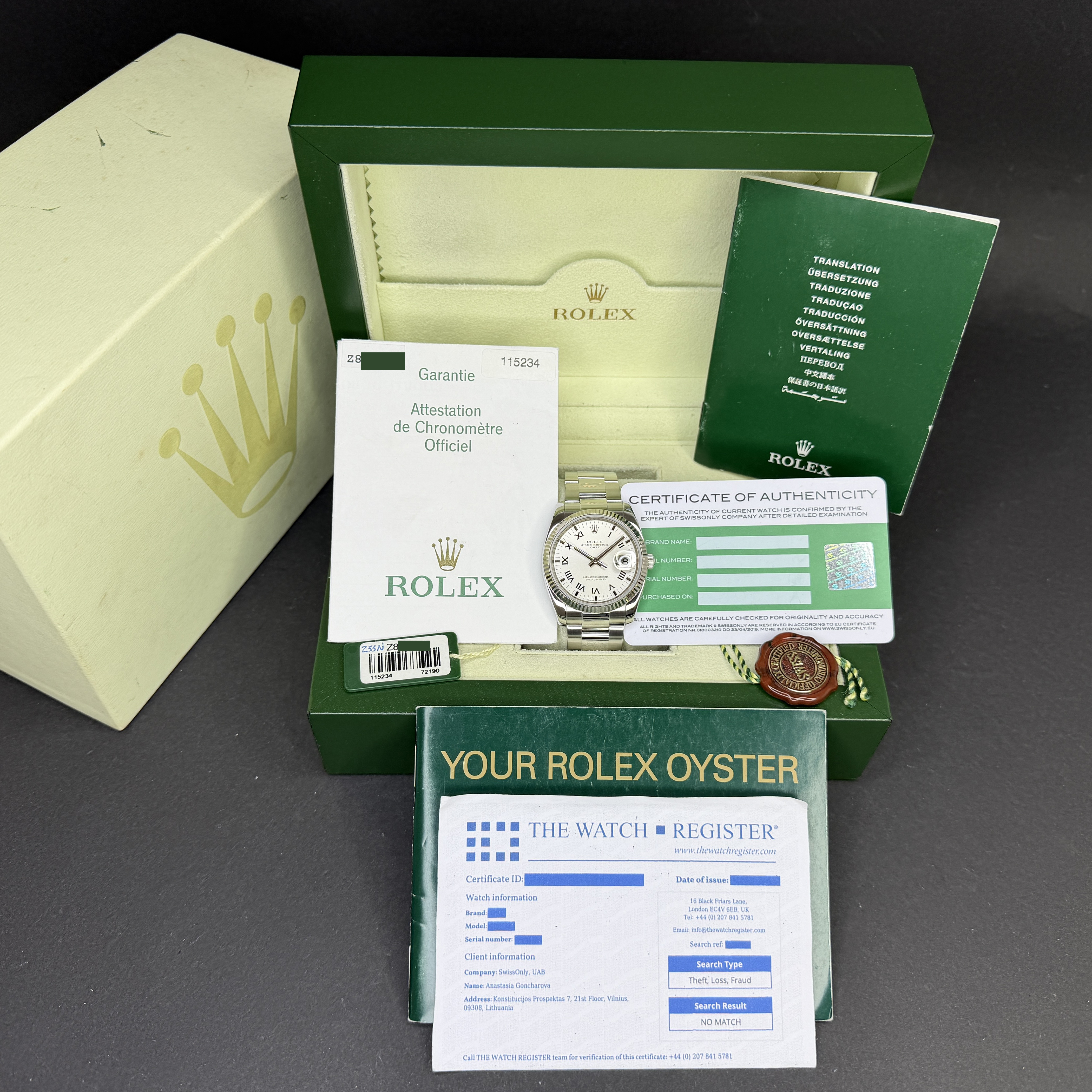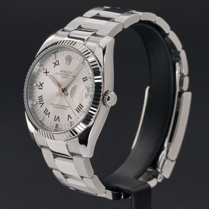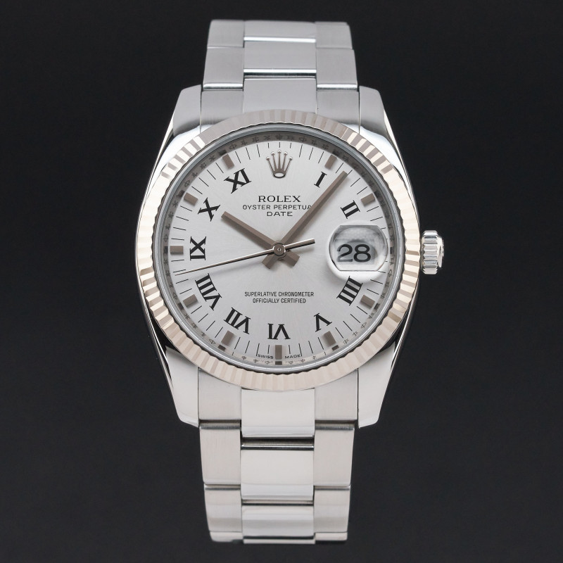 This Rolex Oyster Perpetual Date 115234 features a Silver Roman dial and is crafted from stainless steel, with a production year of 2006.