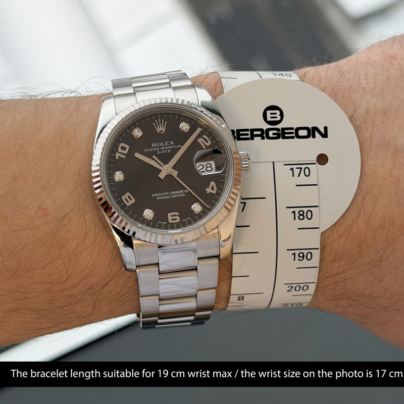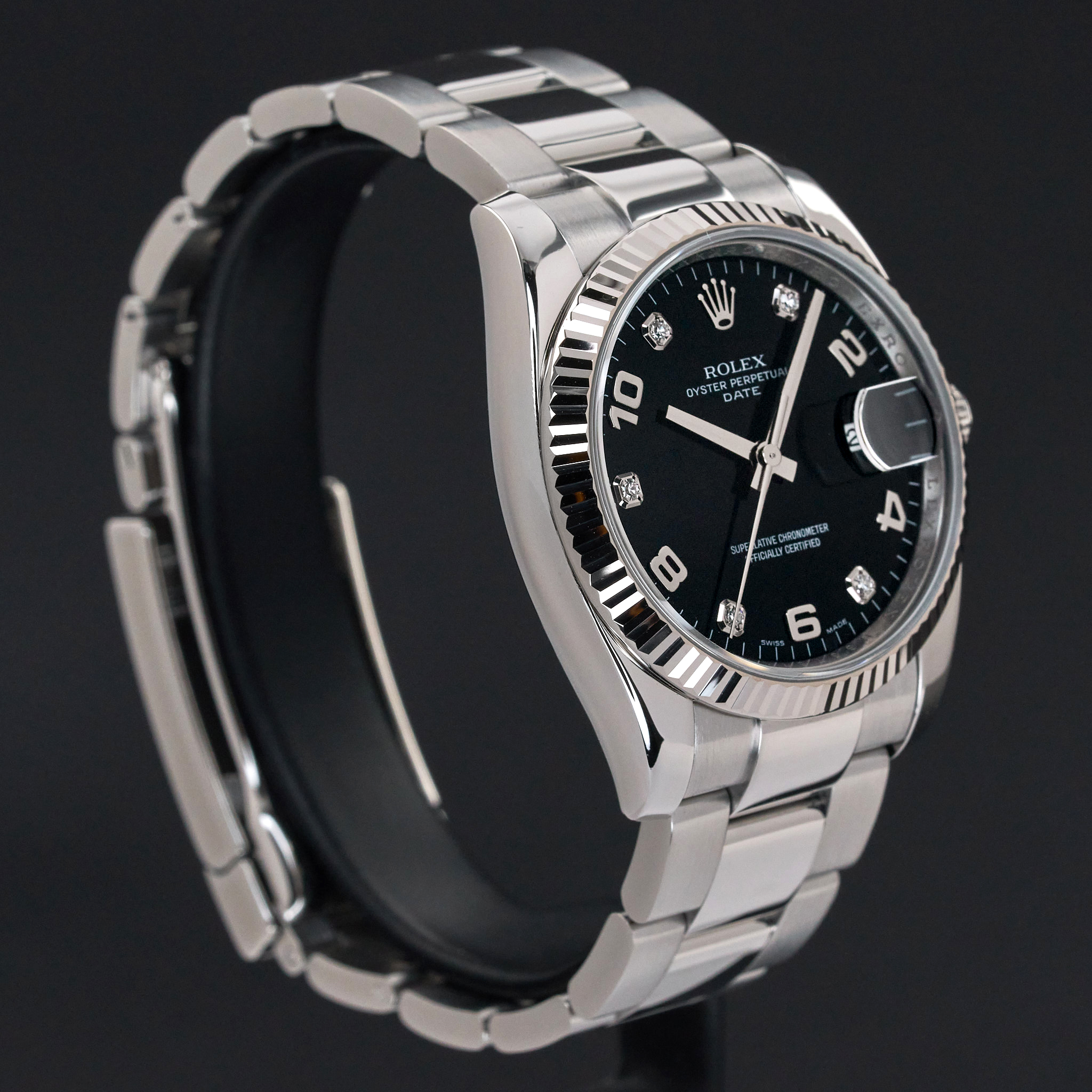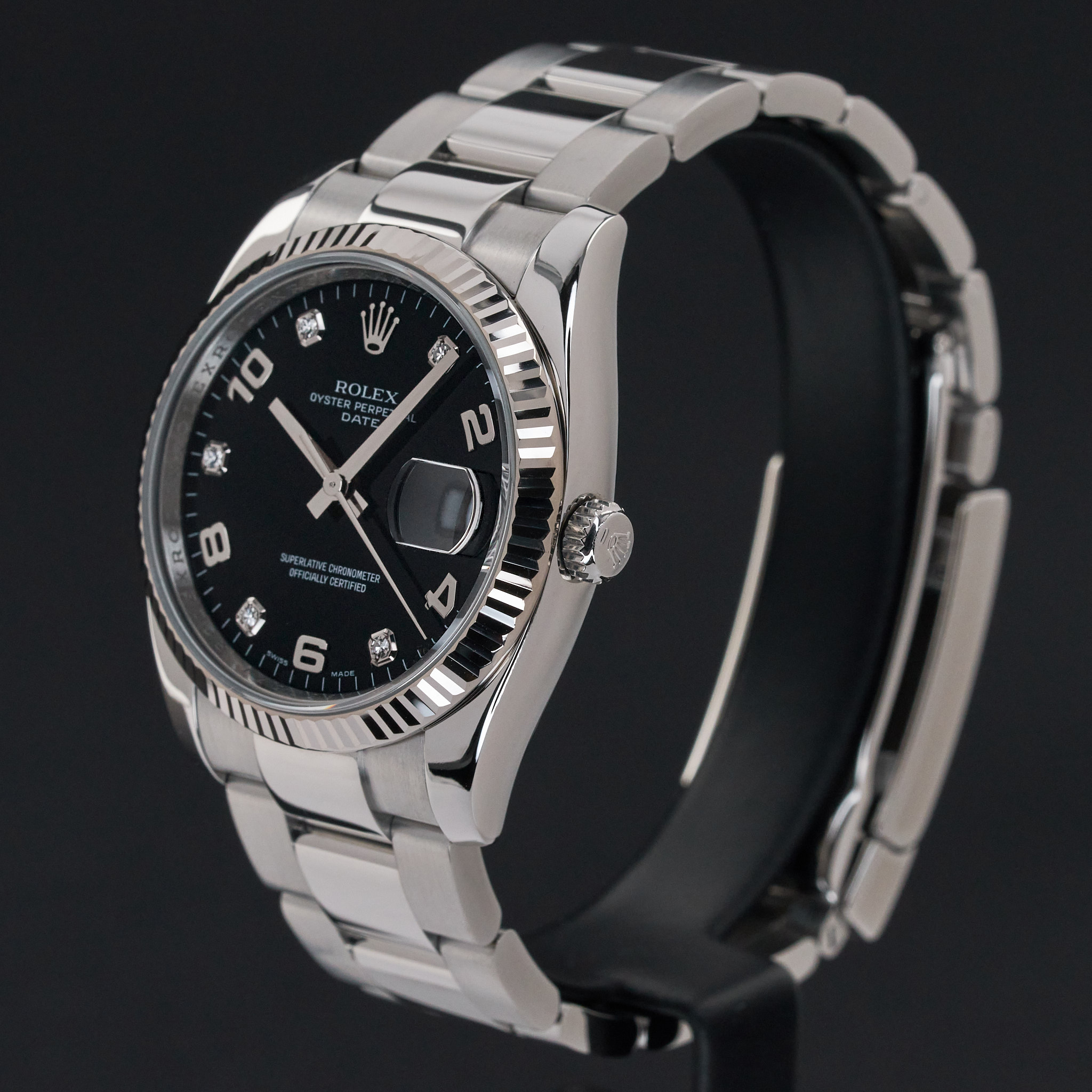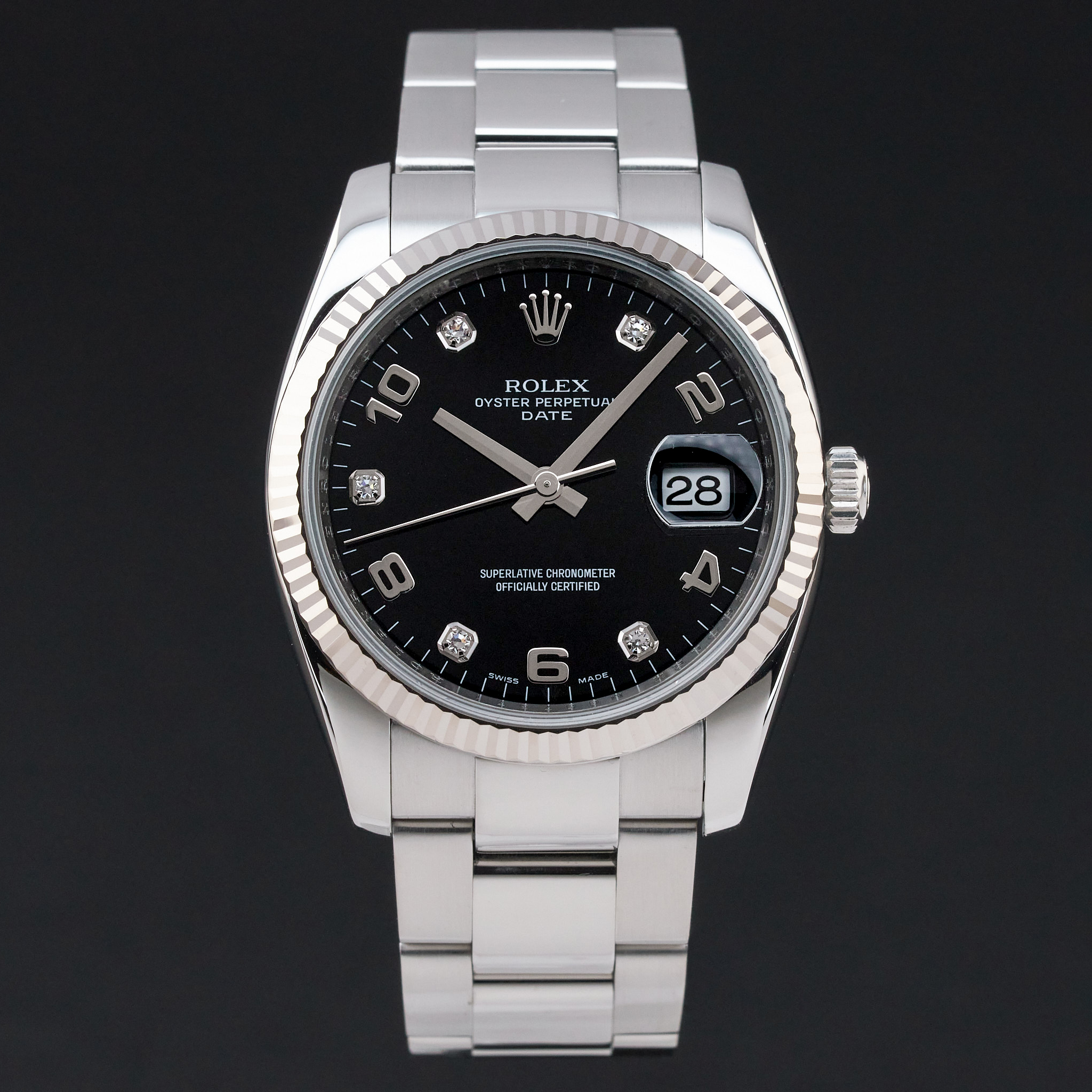 This Rolex Oyster Perpetual Date 115234 features a Black Arabic diamond dial and is crafted from stainless steel, with a production year of 2008.