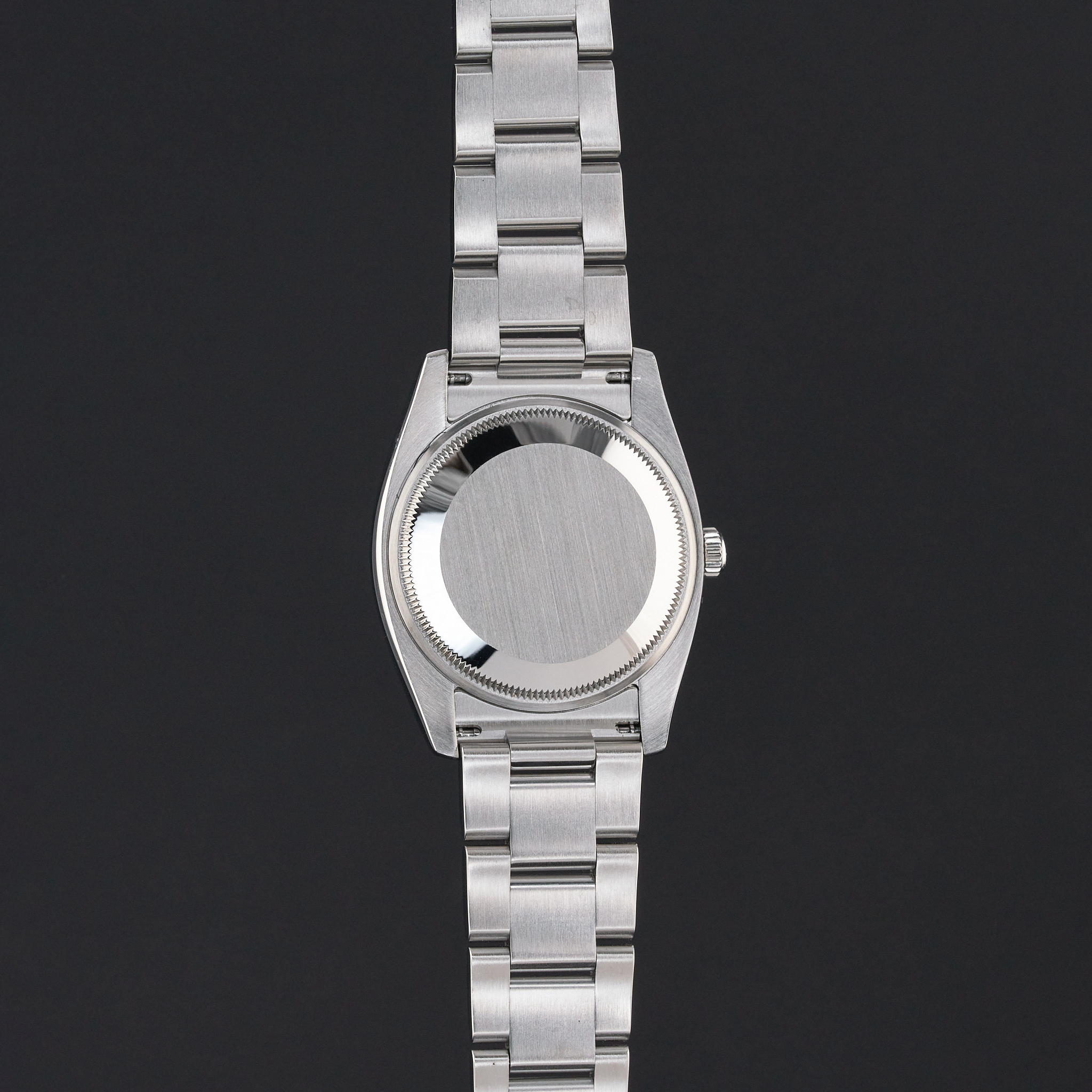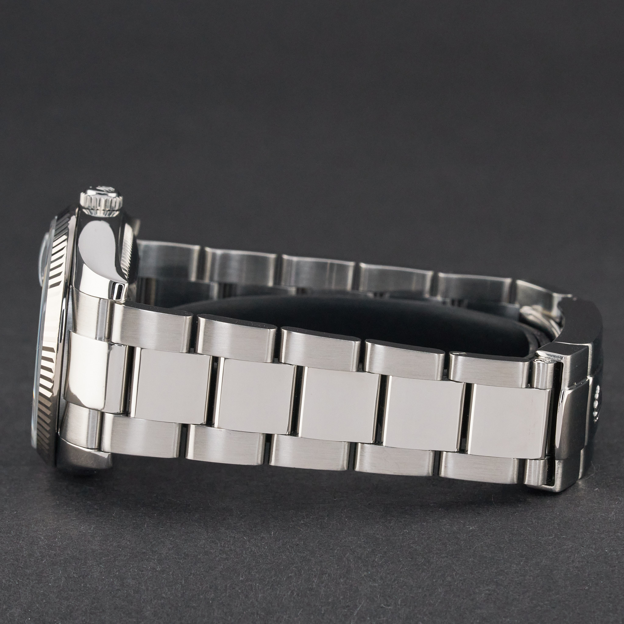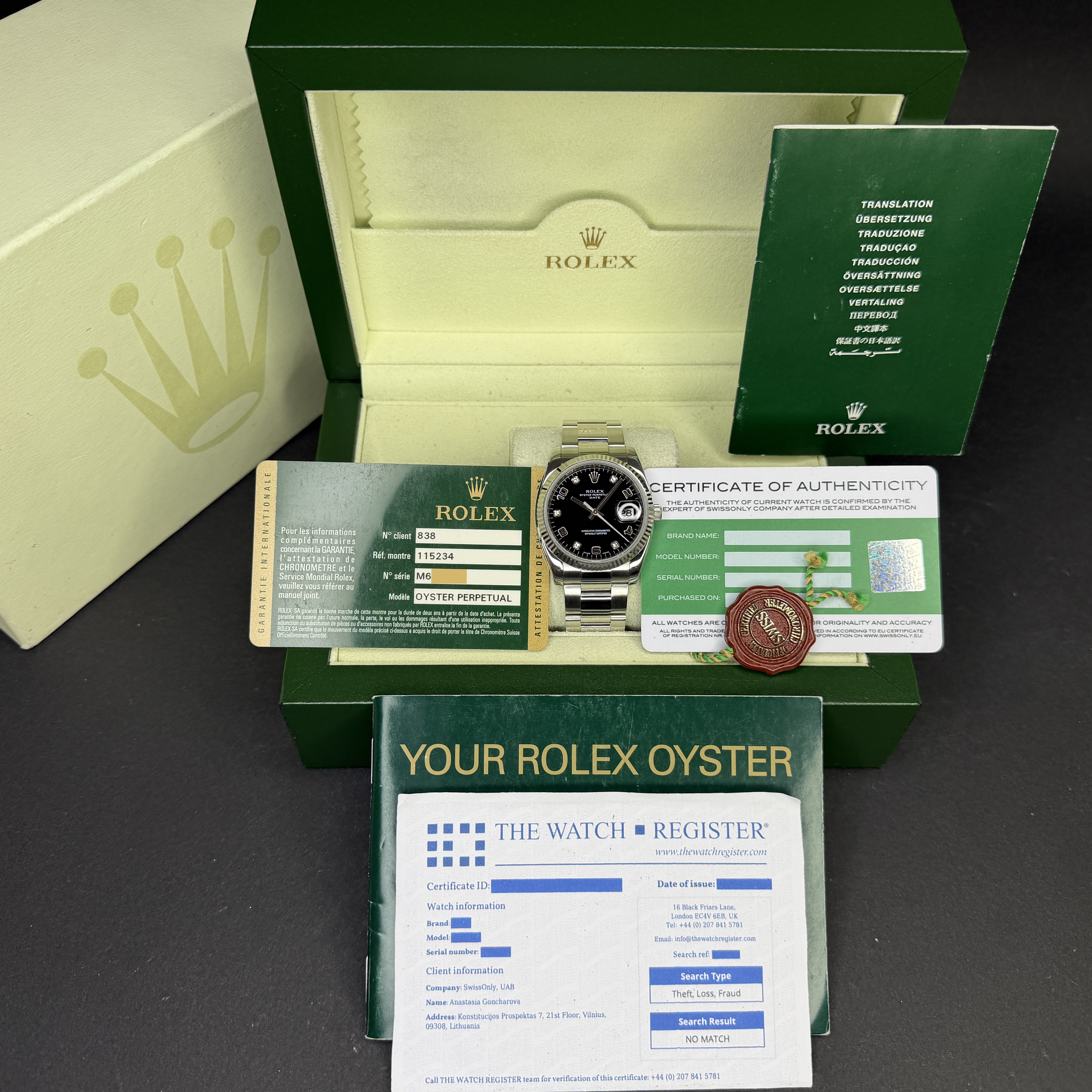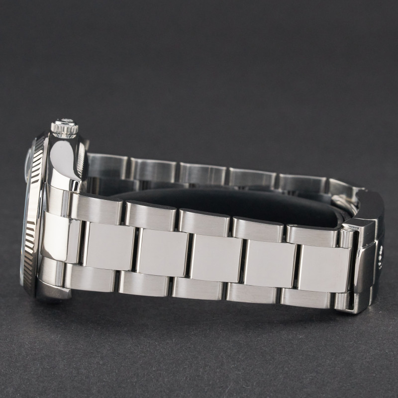 This Rolex Oyster Perpetual Date 115234 features a Black Arabic diamond dial and is crafted from stainless steel, with a production year of 2008.