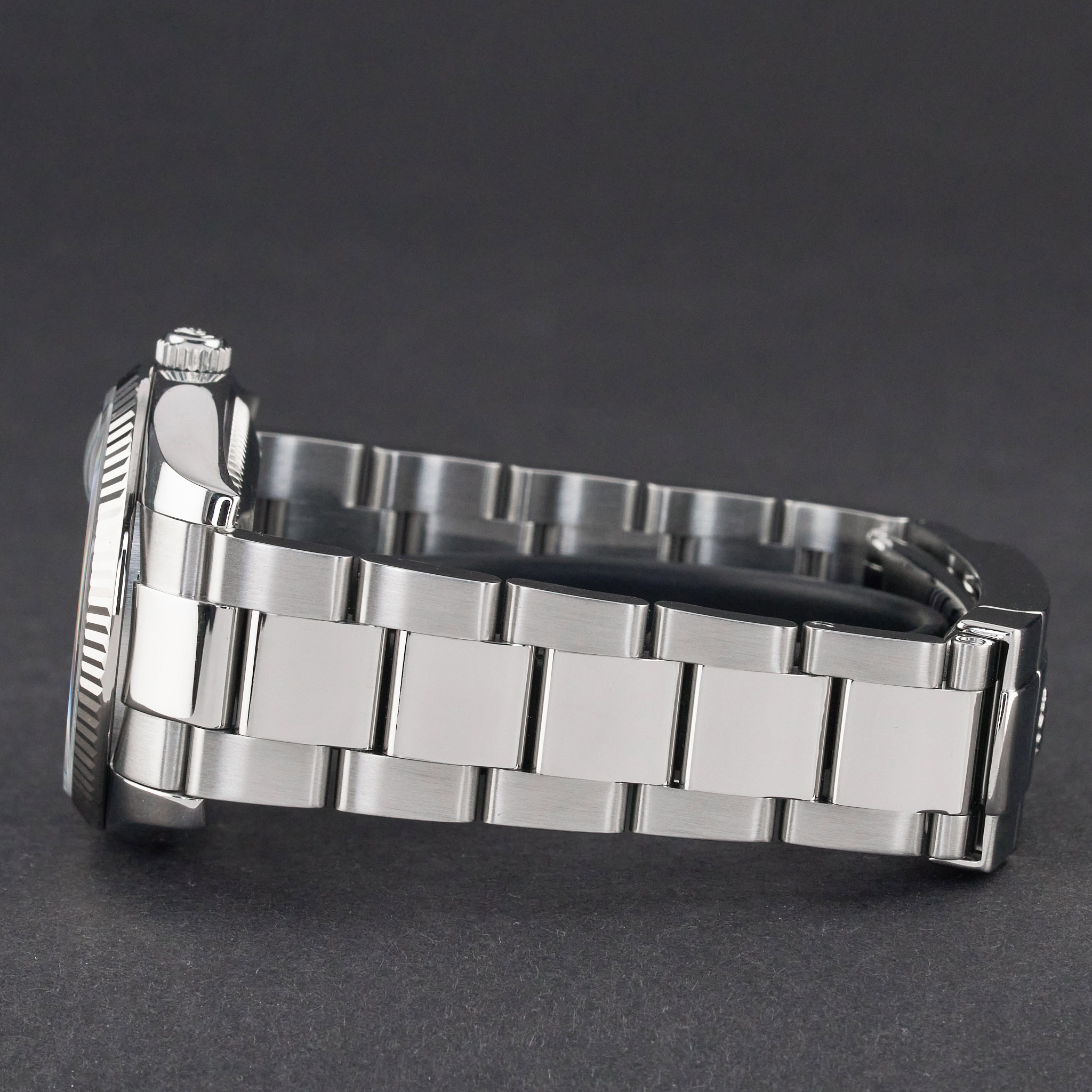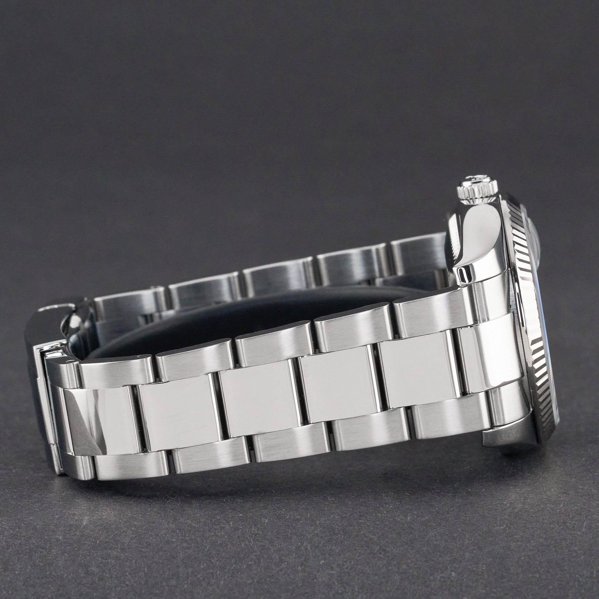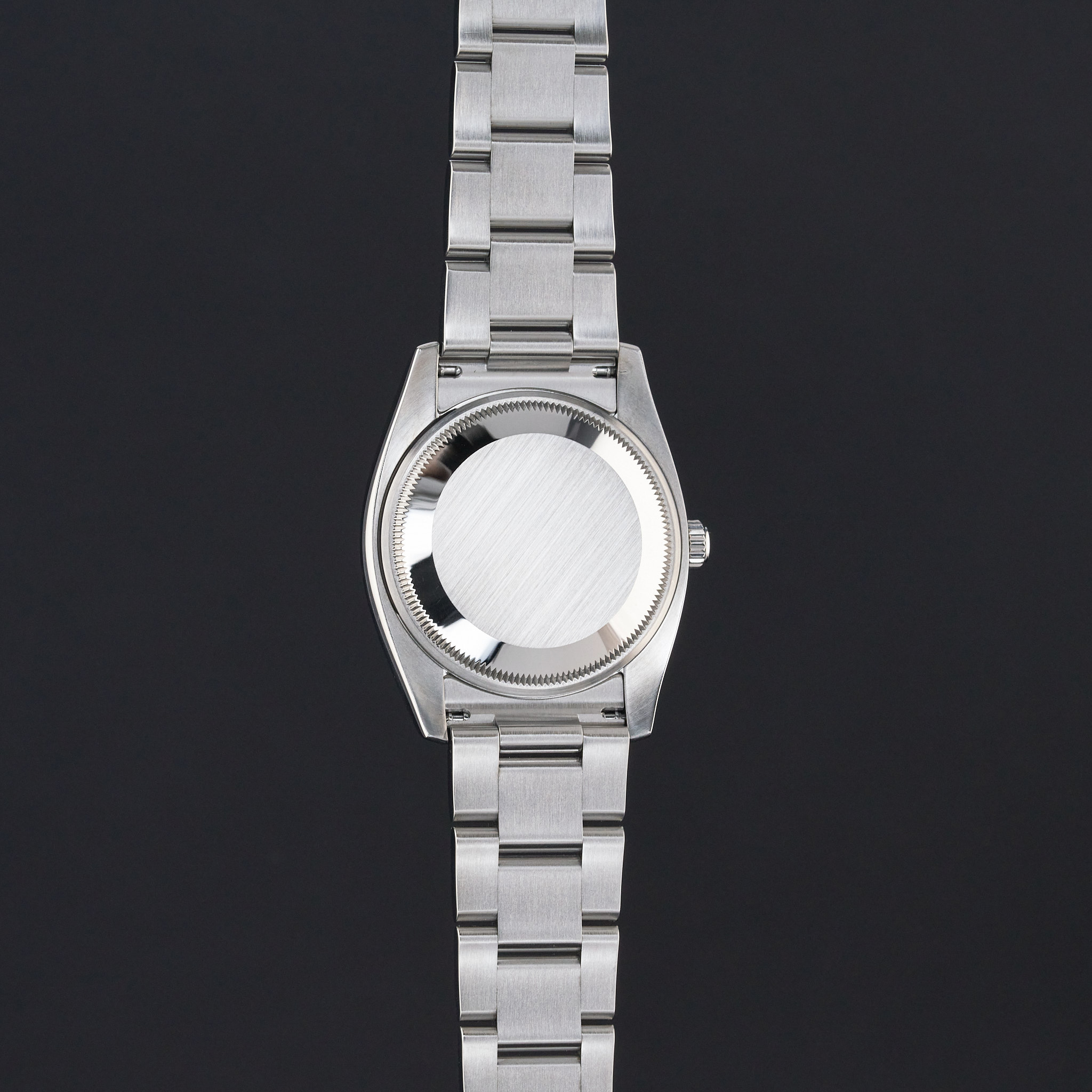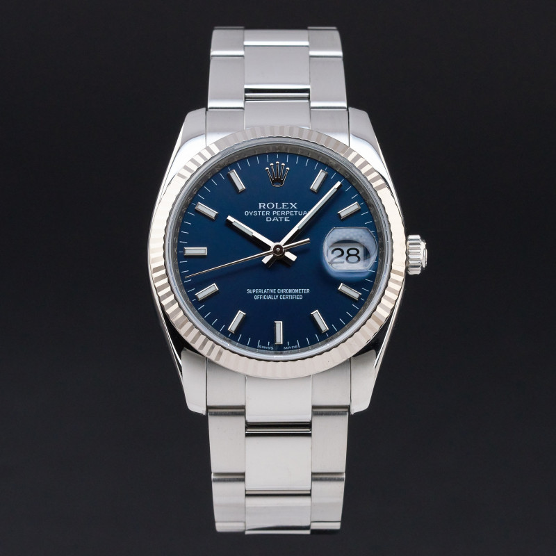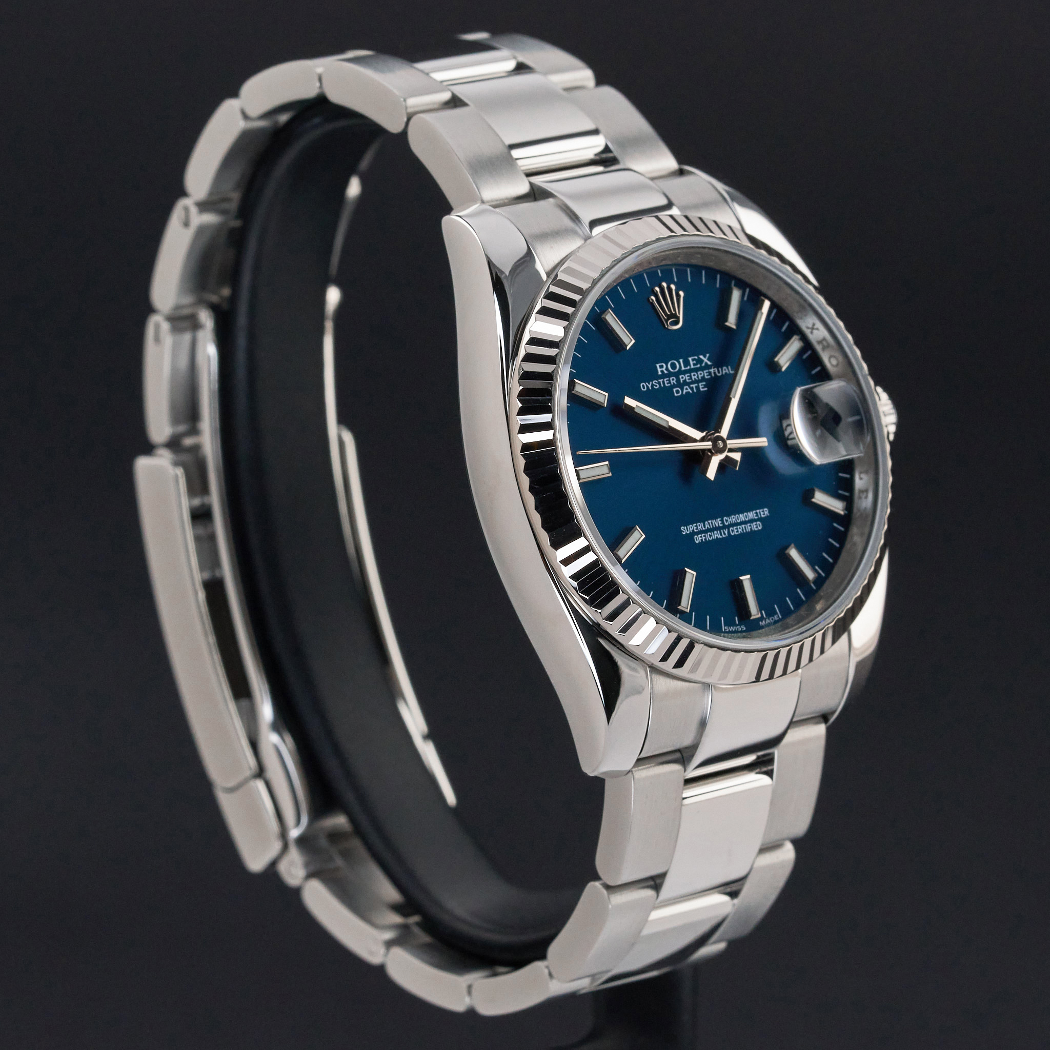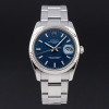 This Rolex Oyster Perpetual Date 115234 features a Blue dial and is crafted from stainless steel, with a production year of 2008.