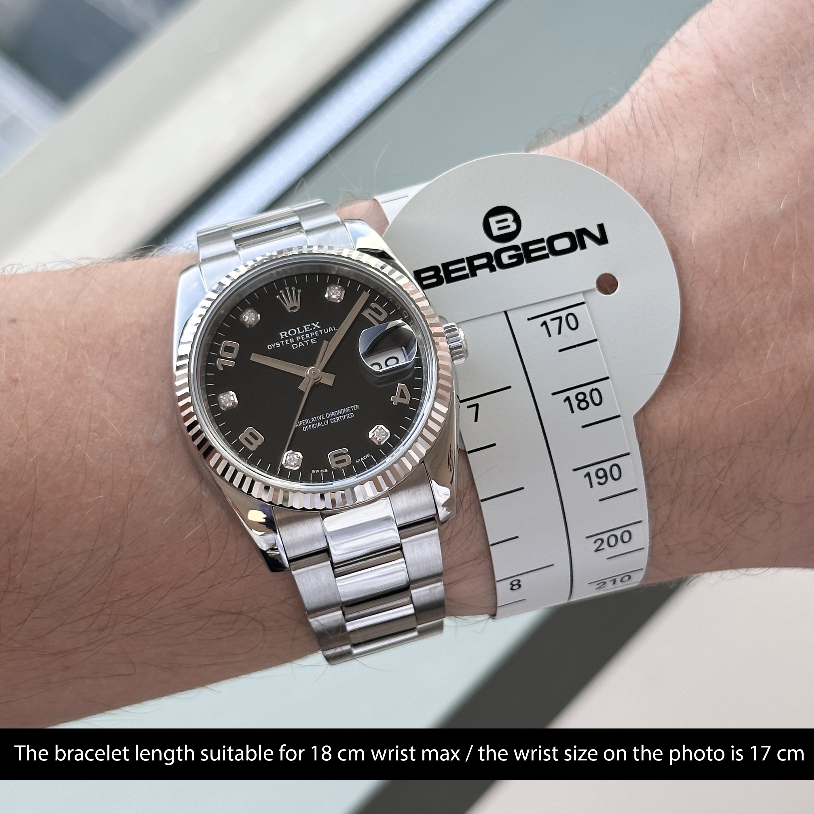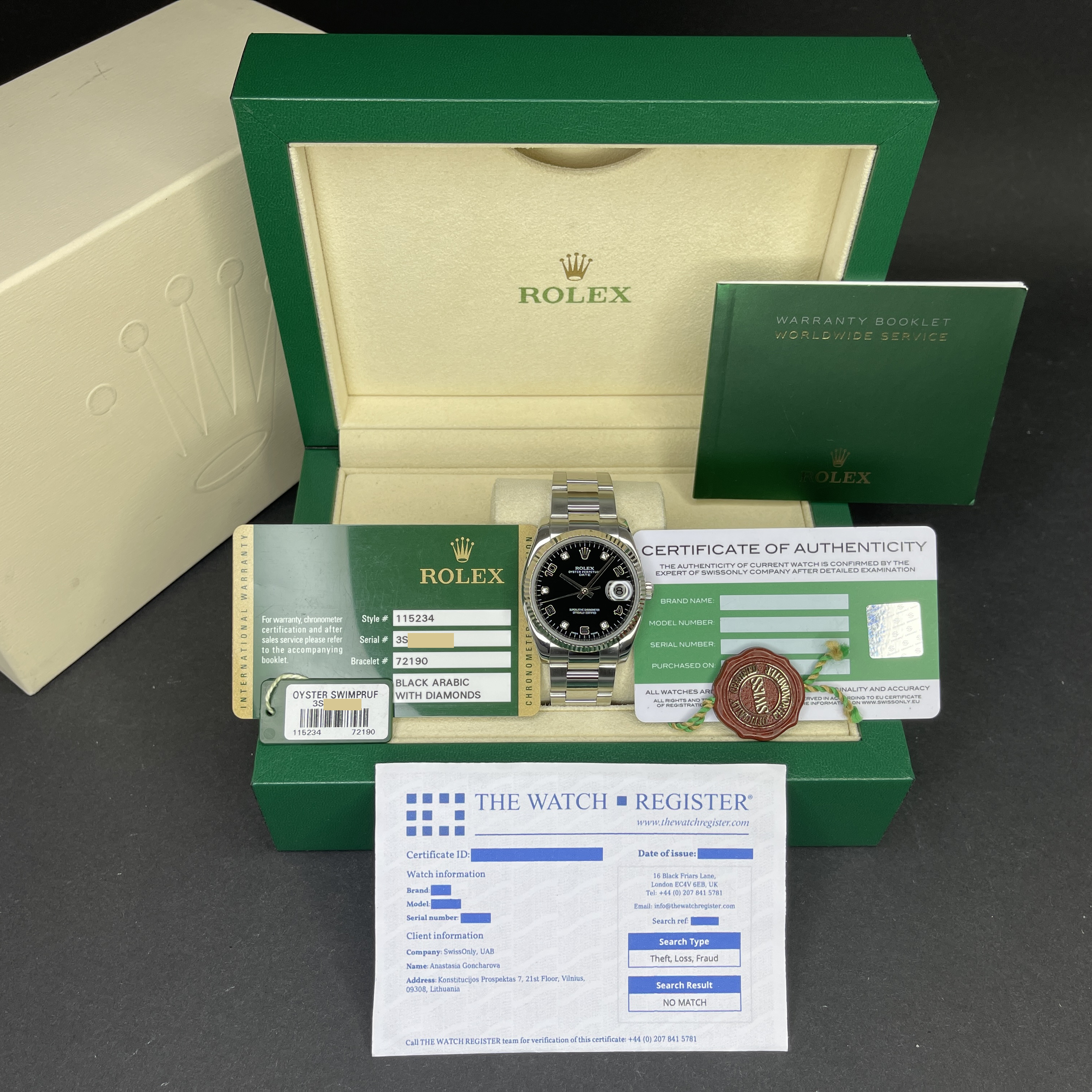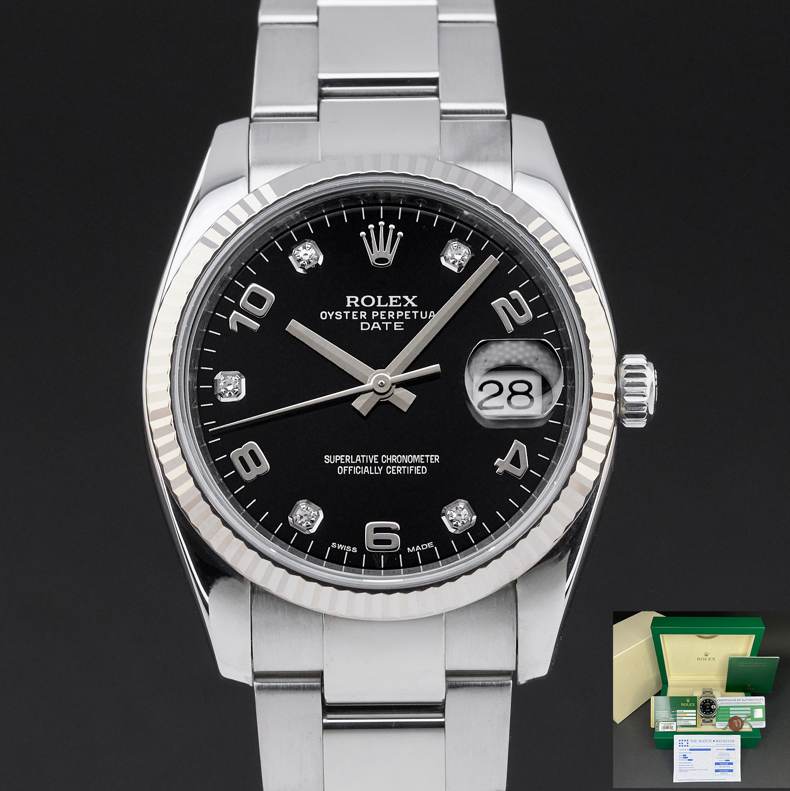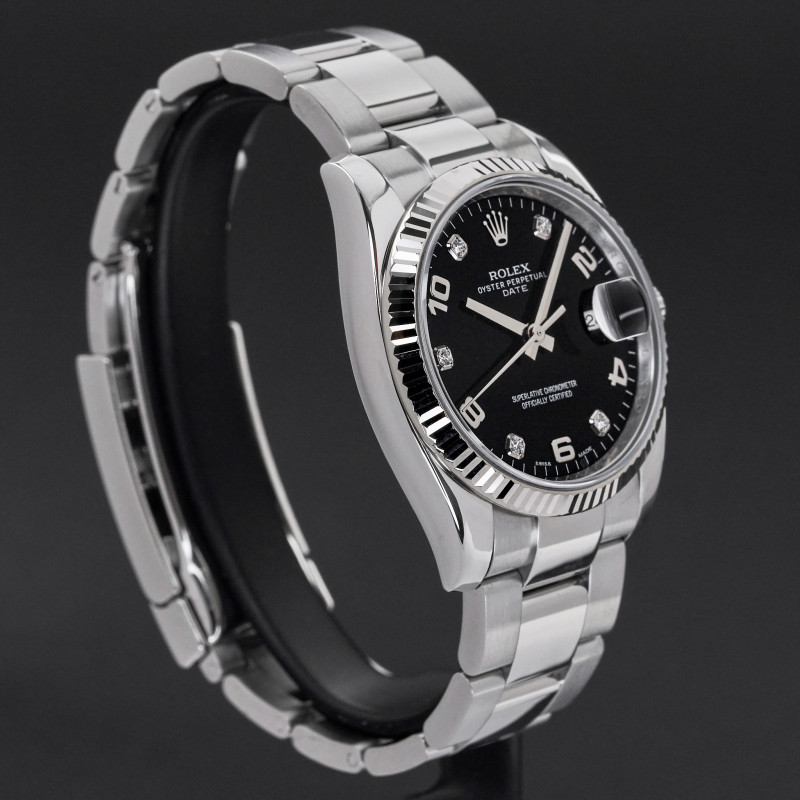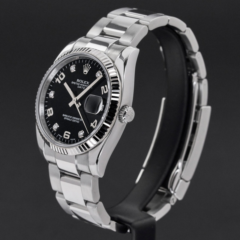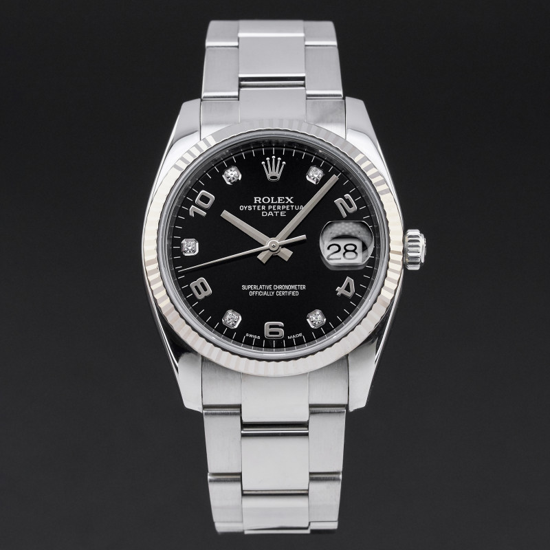This Rolex Oyster Perpetual Date 115234 features a Black diamond Arabic dial and is crafted from stainless steel, with a production year of 2013.