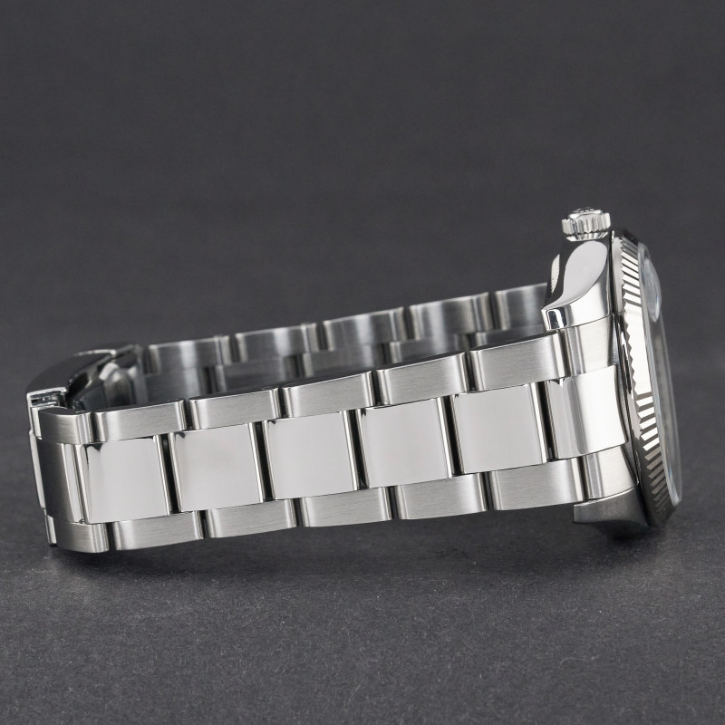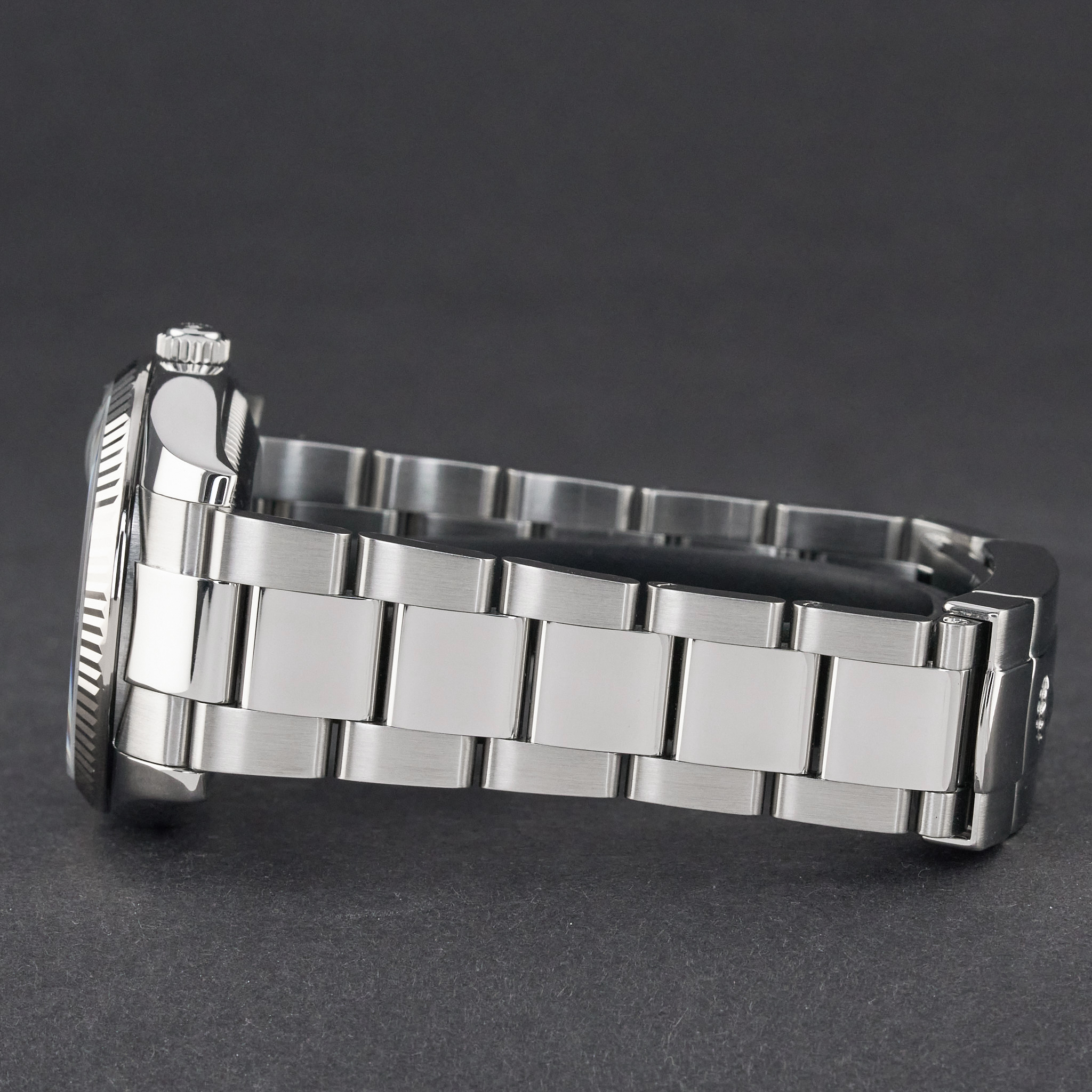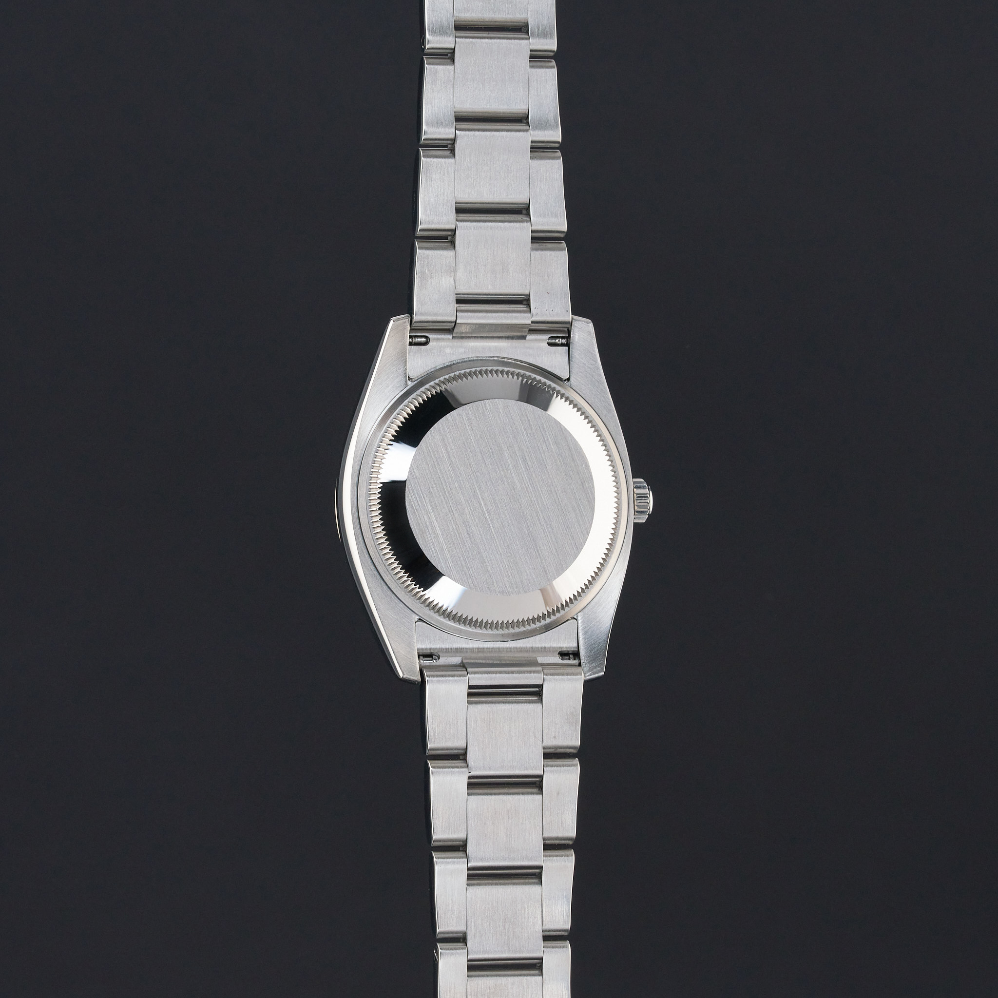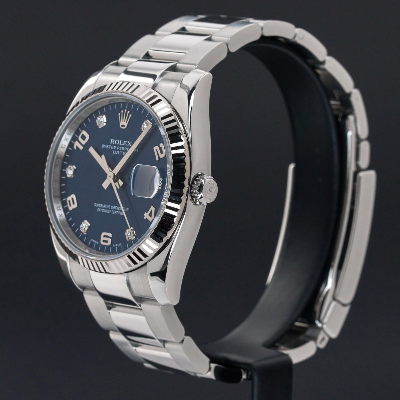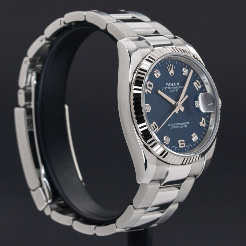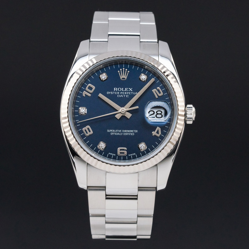 This Rolex Oyster Perpetual Date 115234 features a Blue Arabic diamond dial and is crafted from stainless steel, with a production year of 2013.