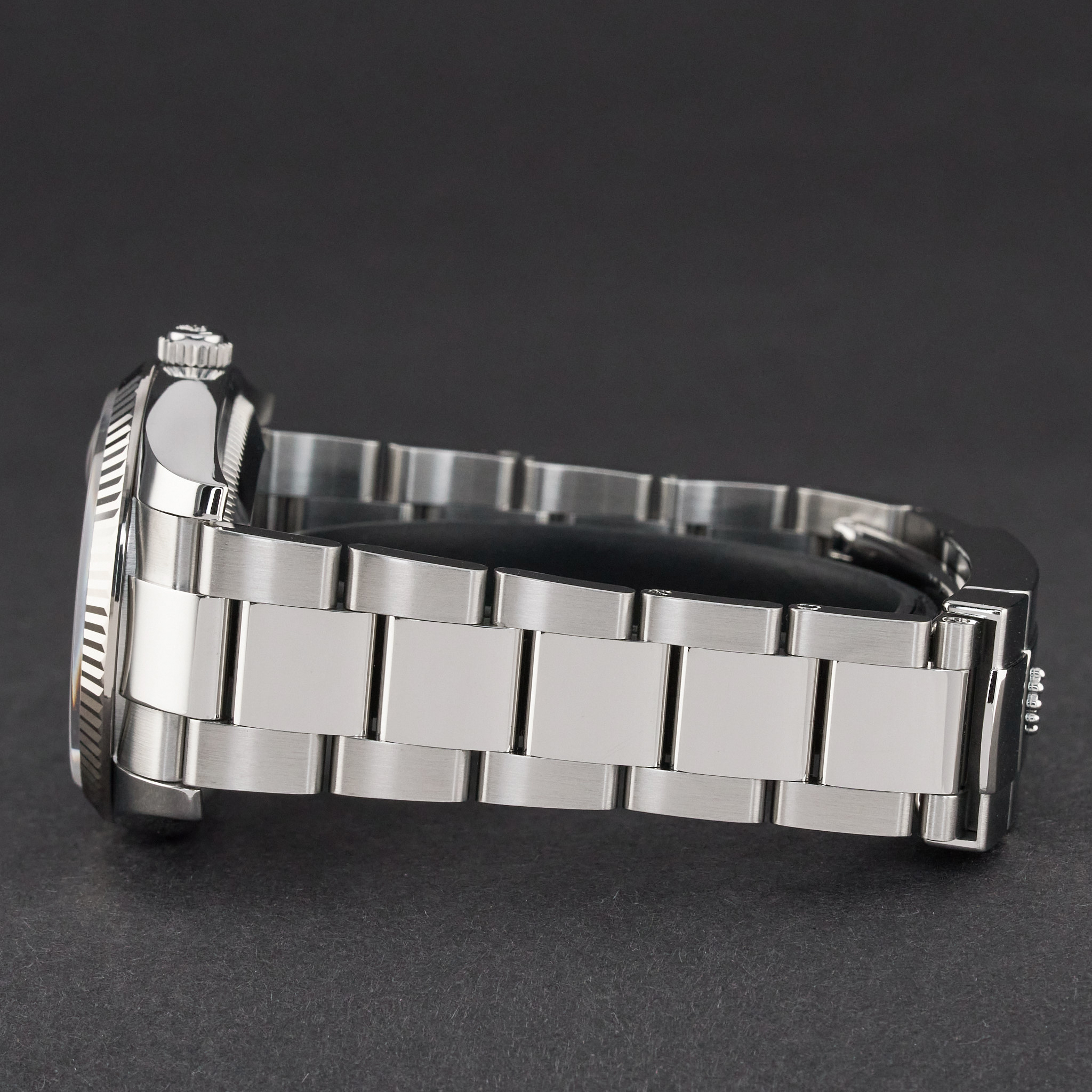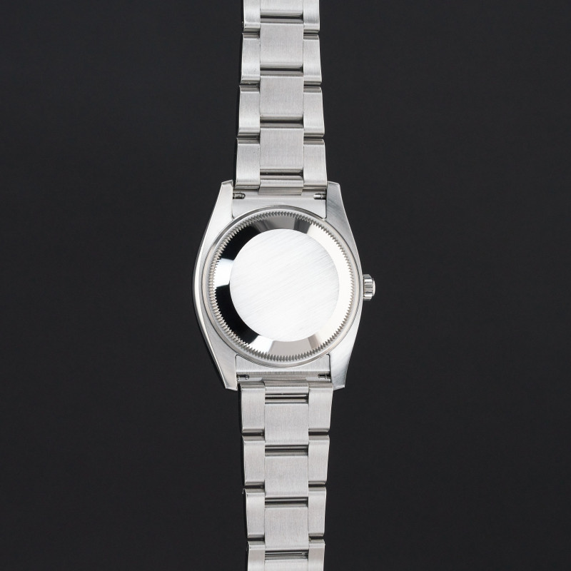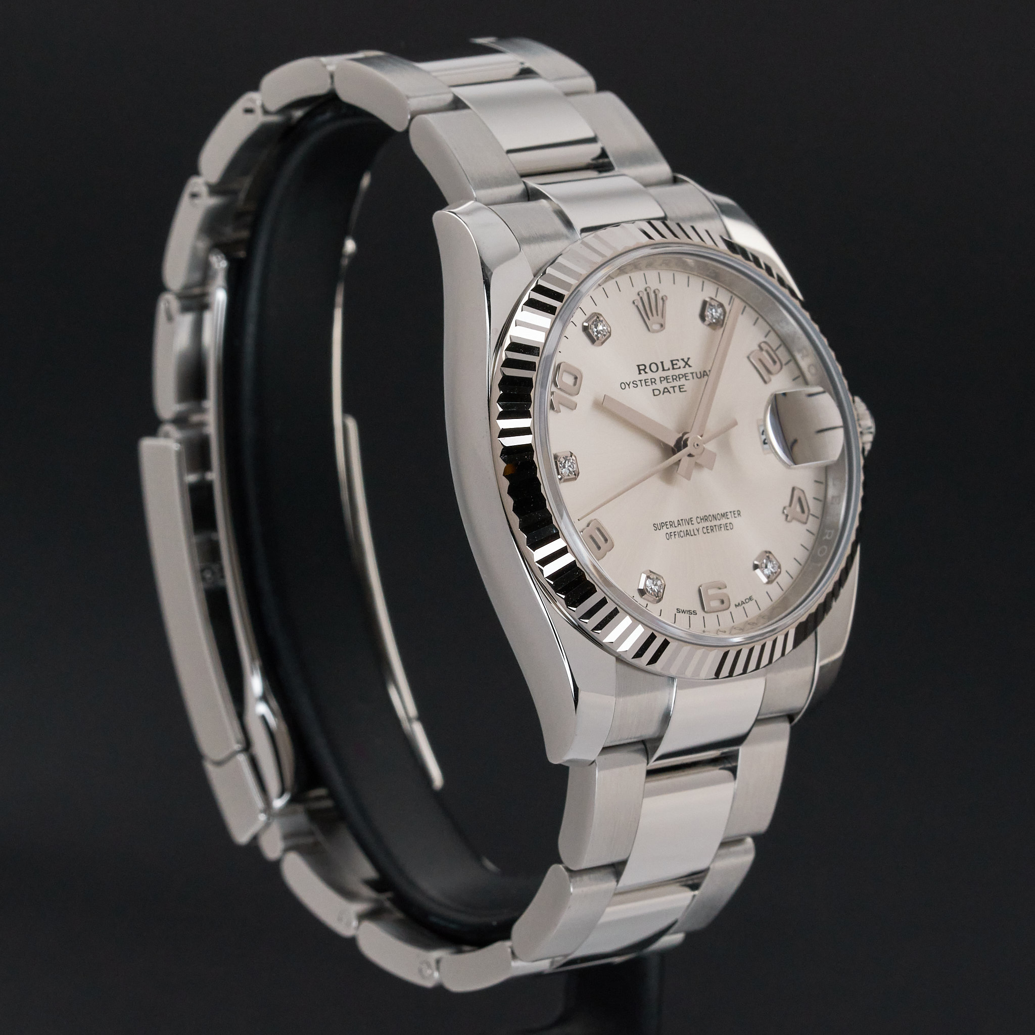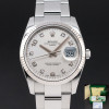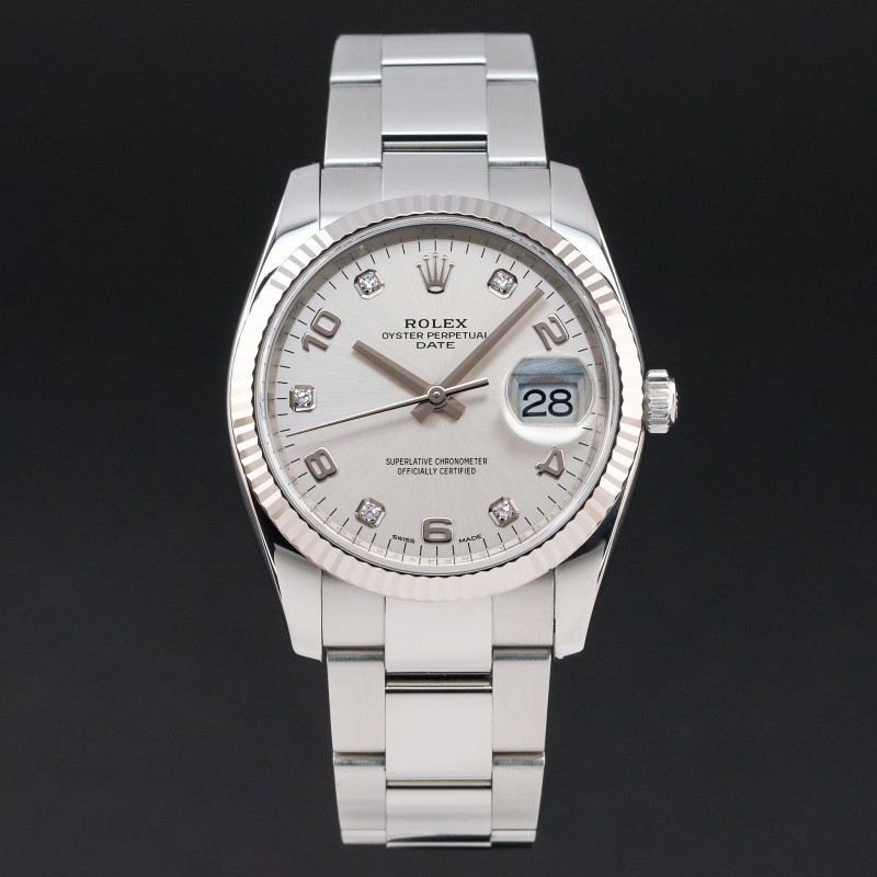 This Rolex Oyster Perpetual Date 115234 features a Silver Arabic diamond dial and is crafted from stainless steel, with a production year of 2020.