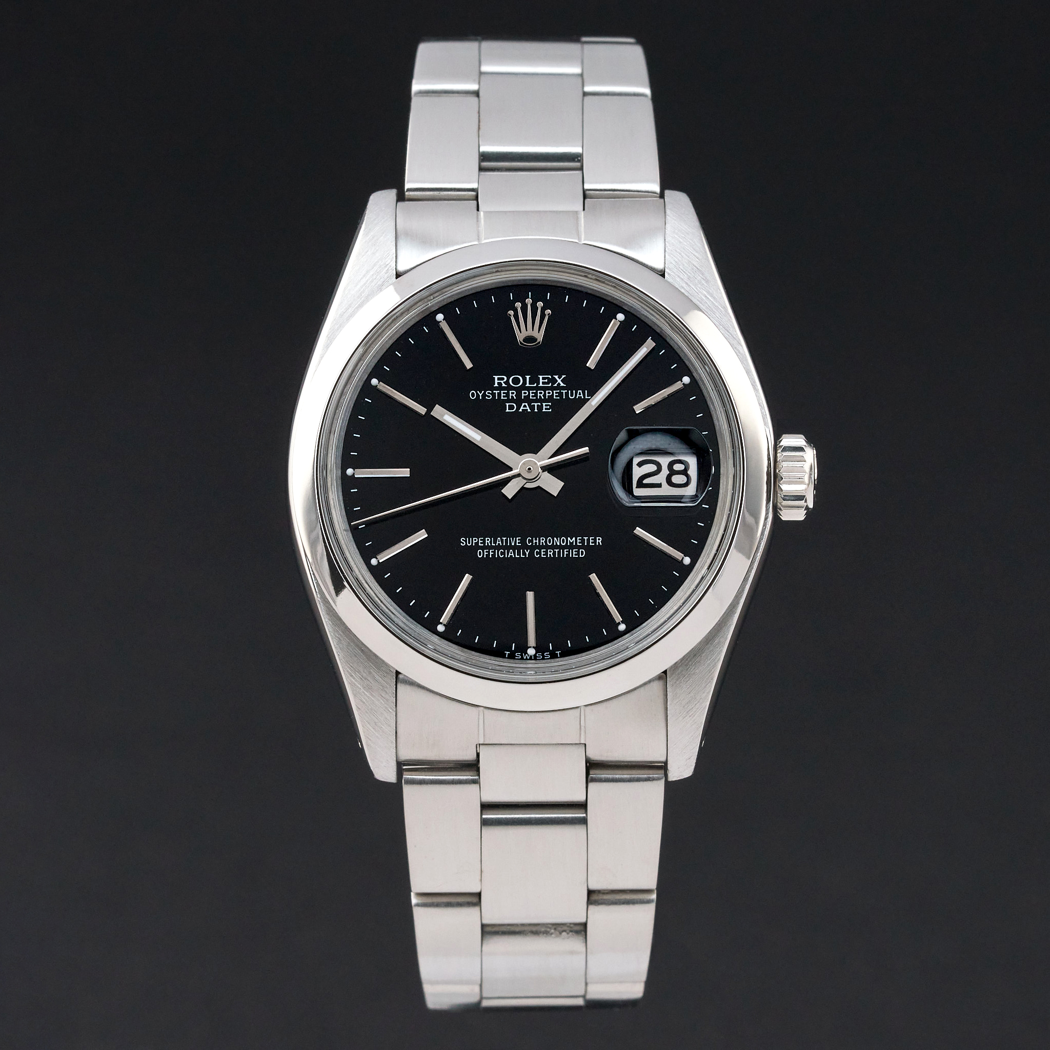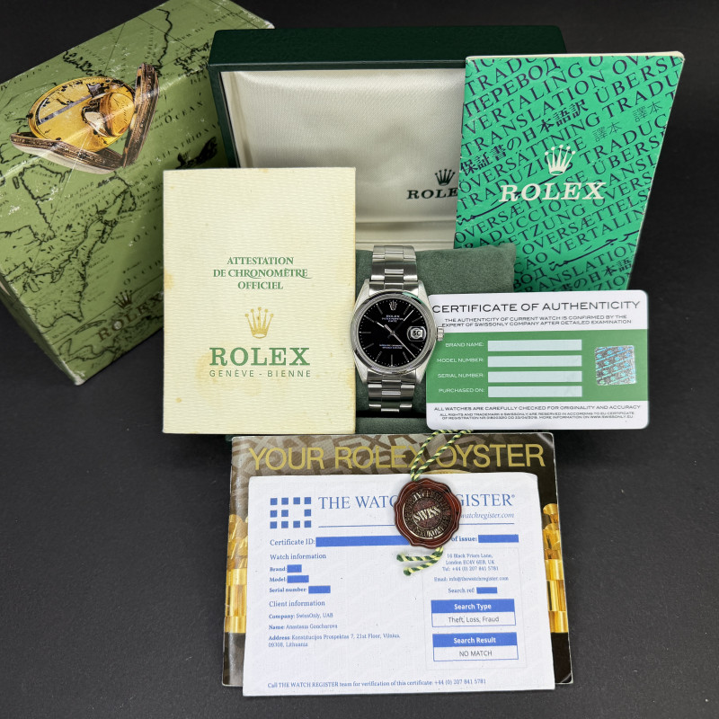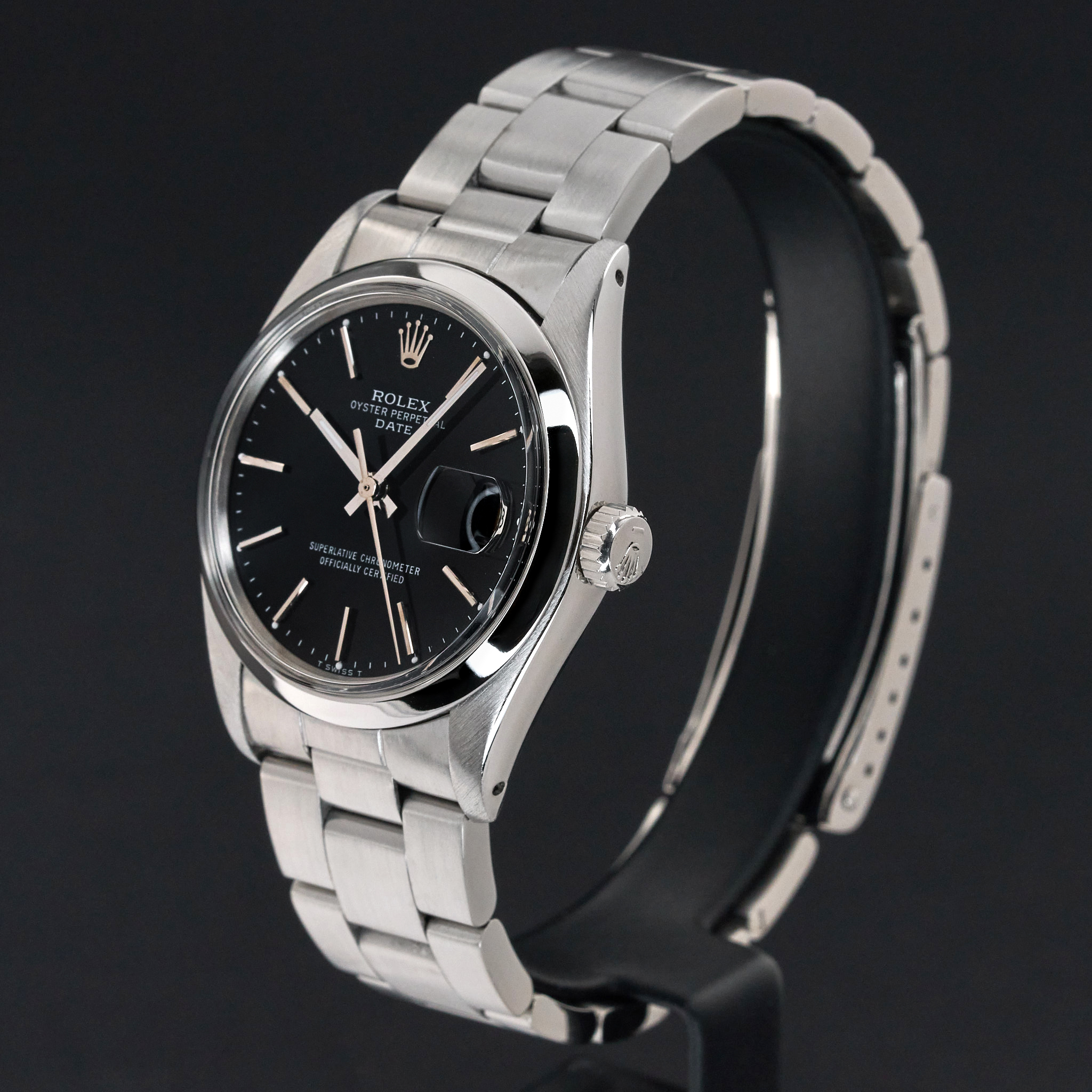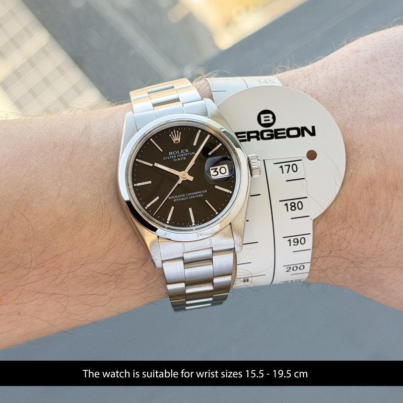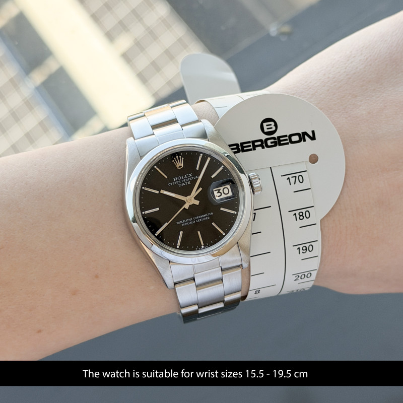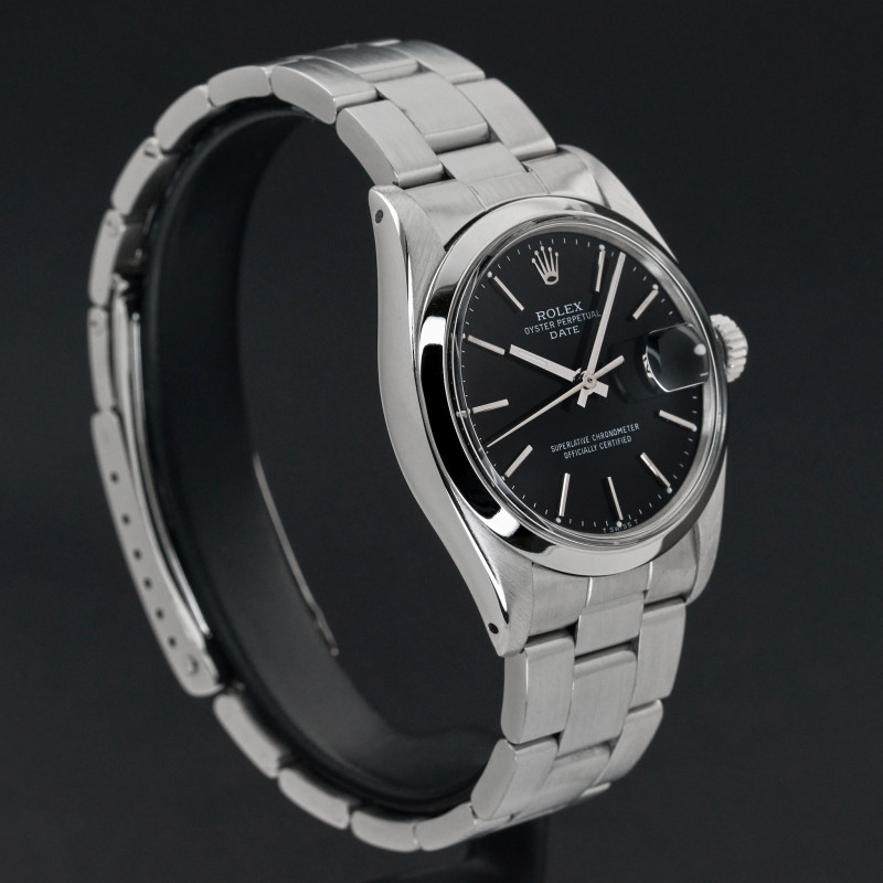 This Rolex Oyster Perpetual Date 1500 features a Black dial and is crafted from from stainless steel, with a production year of 1975.