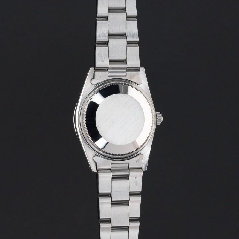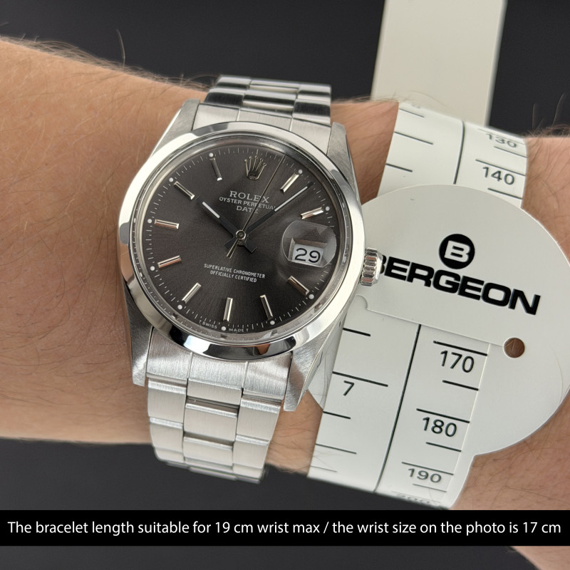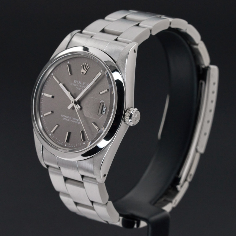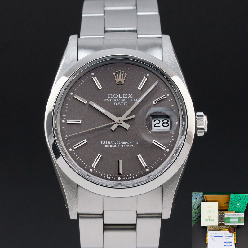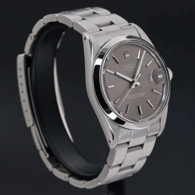 This Rolex Oyster Perpetual Date 15000 features a Grey dial and is crafted from stainless steel, with a production year of 1987.