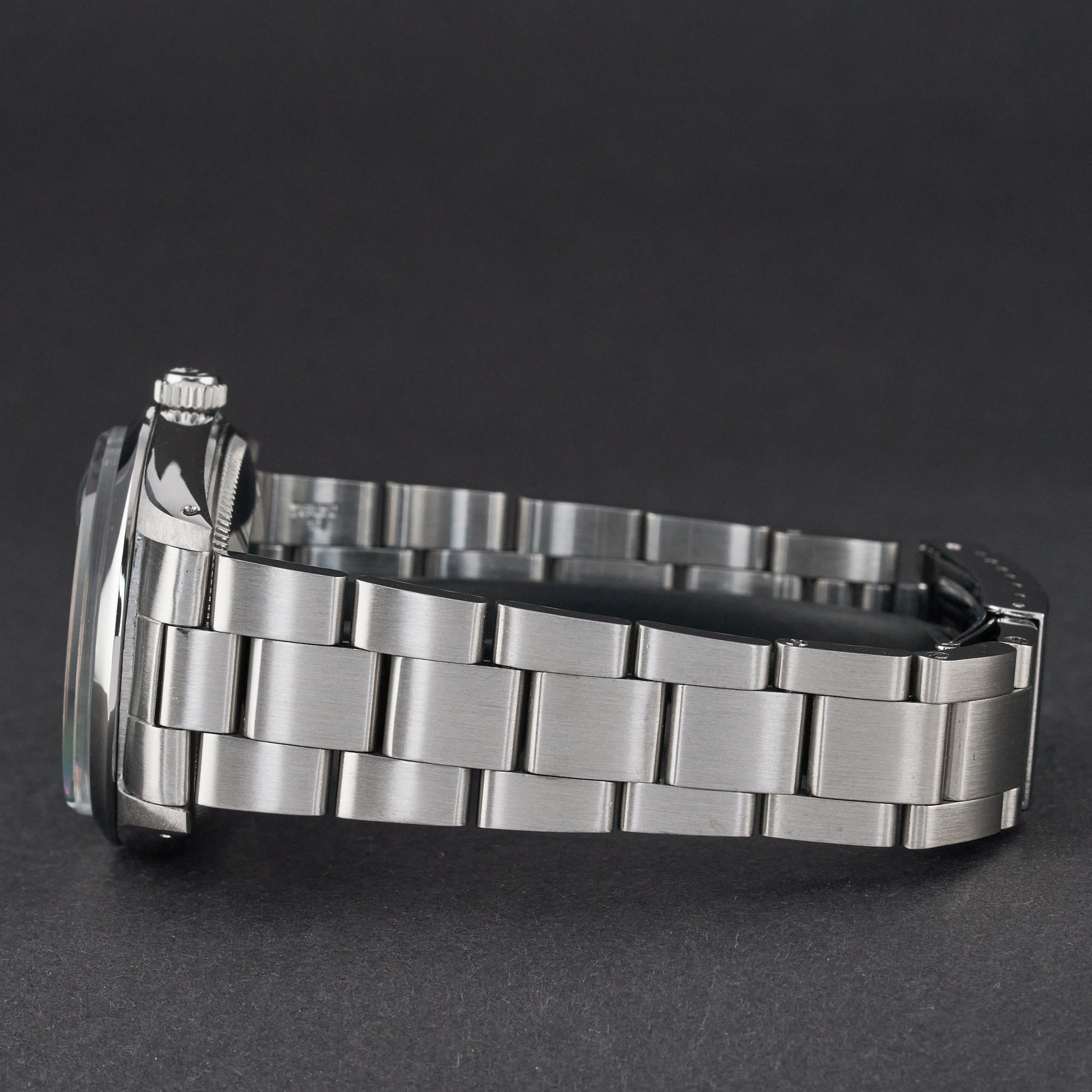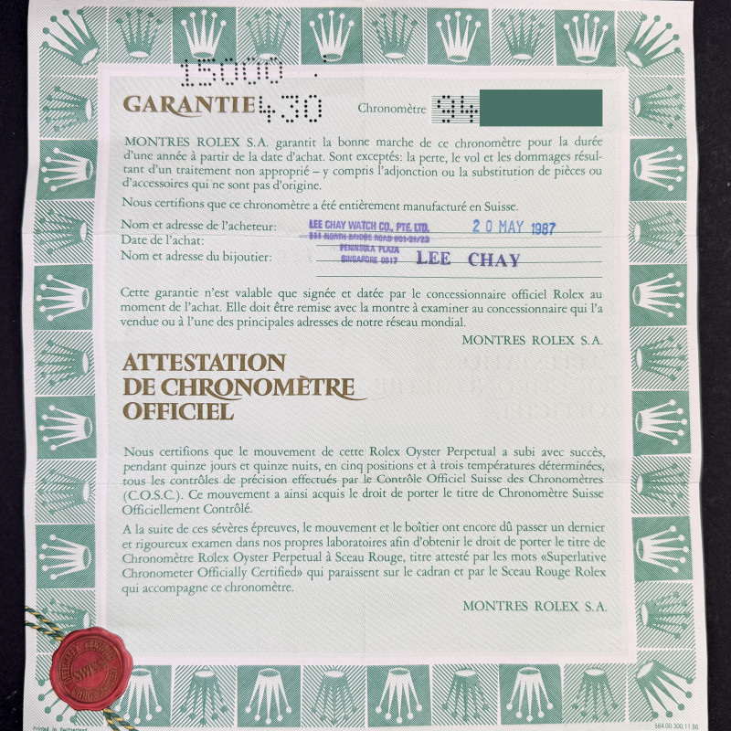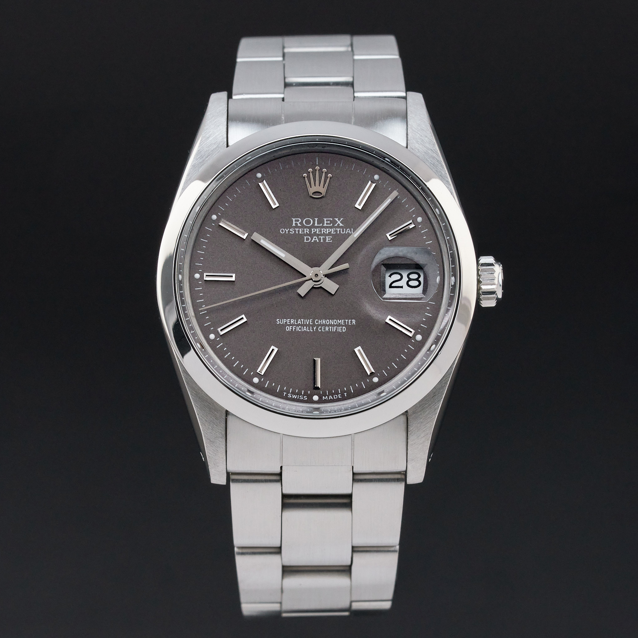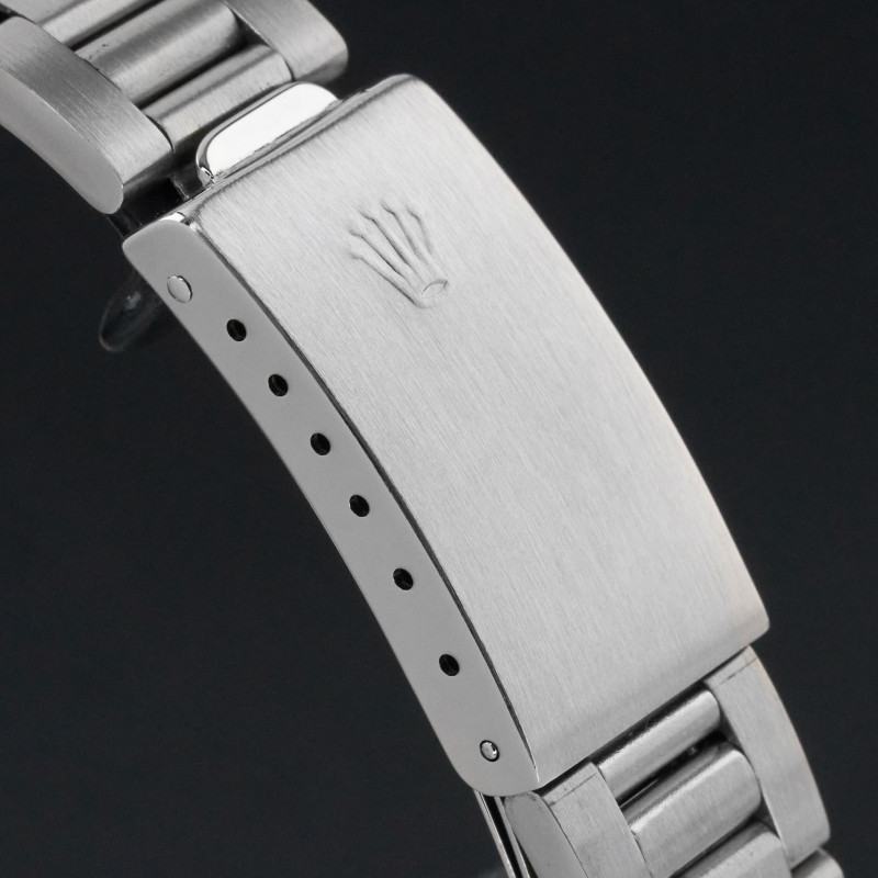 This Rolex Oyster Perpetual Date 15000 features a Grey dial and is crafted from stainless steel, with a production year of 1987.