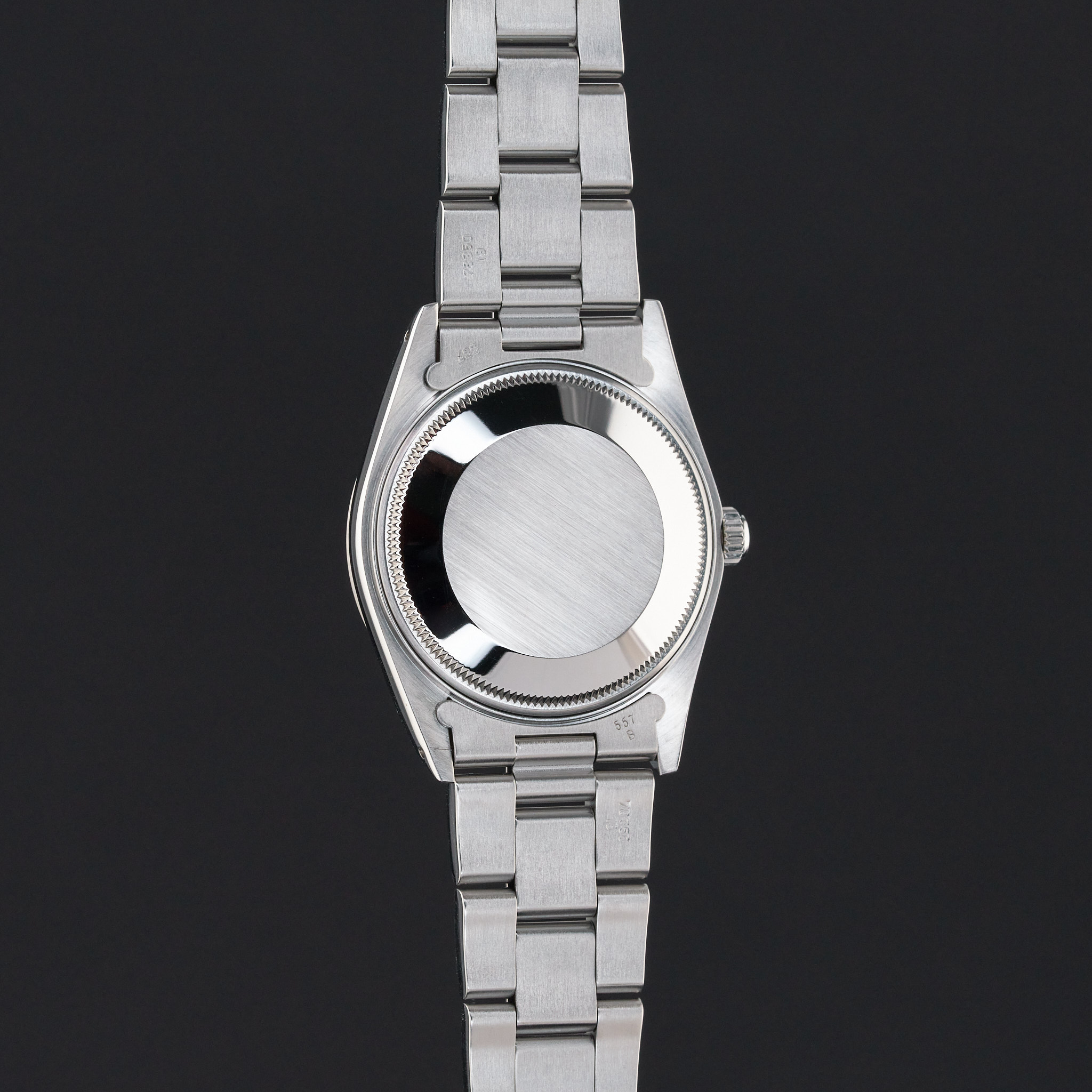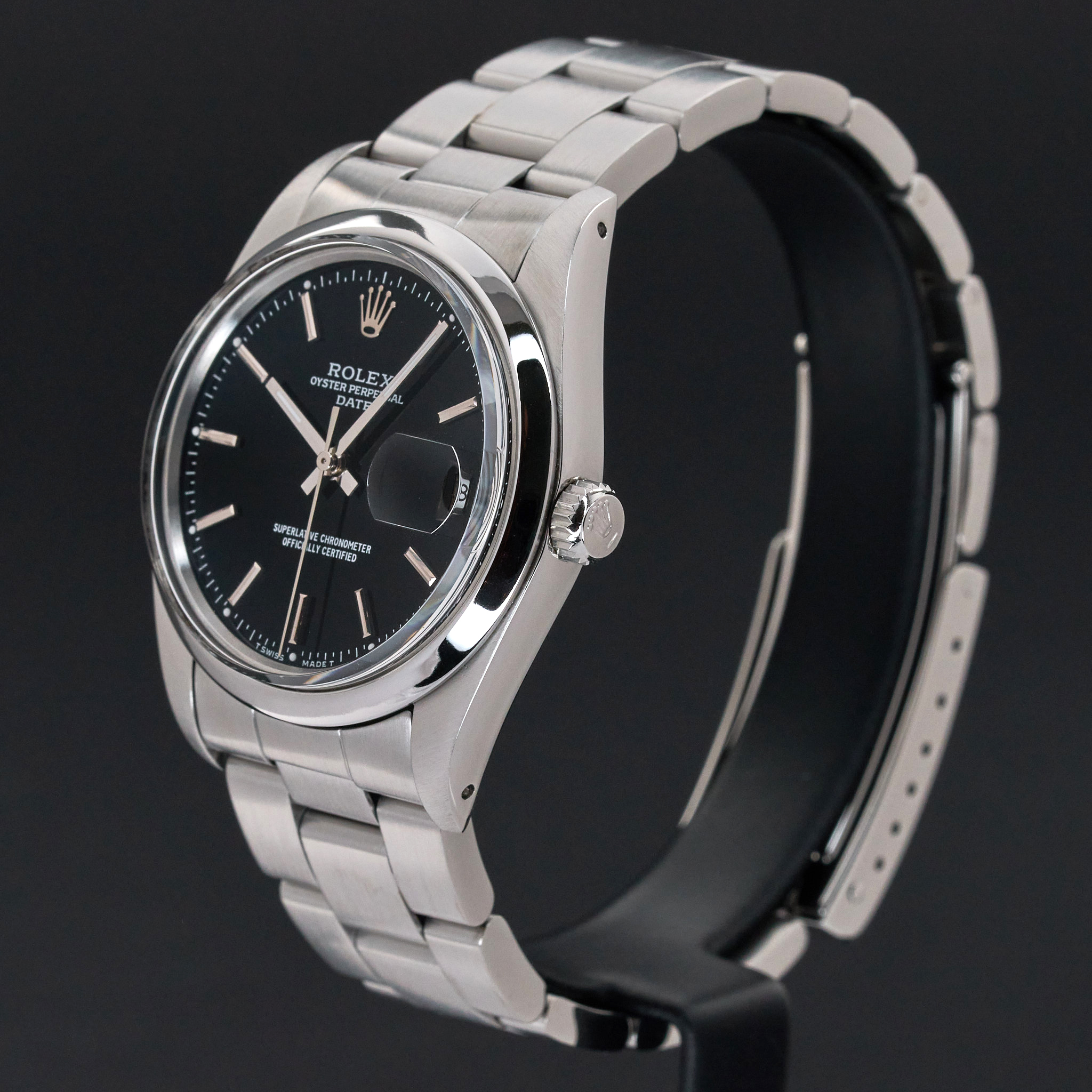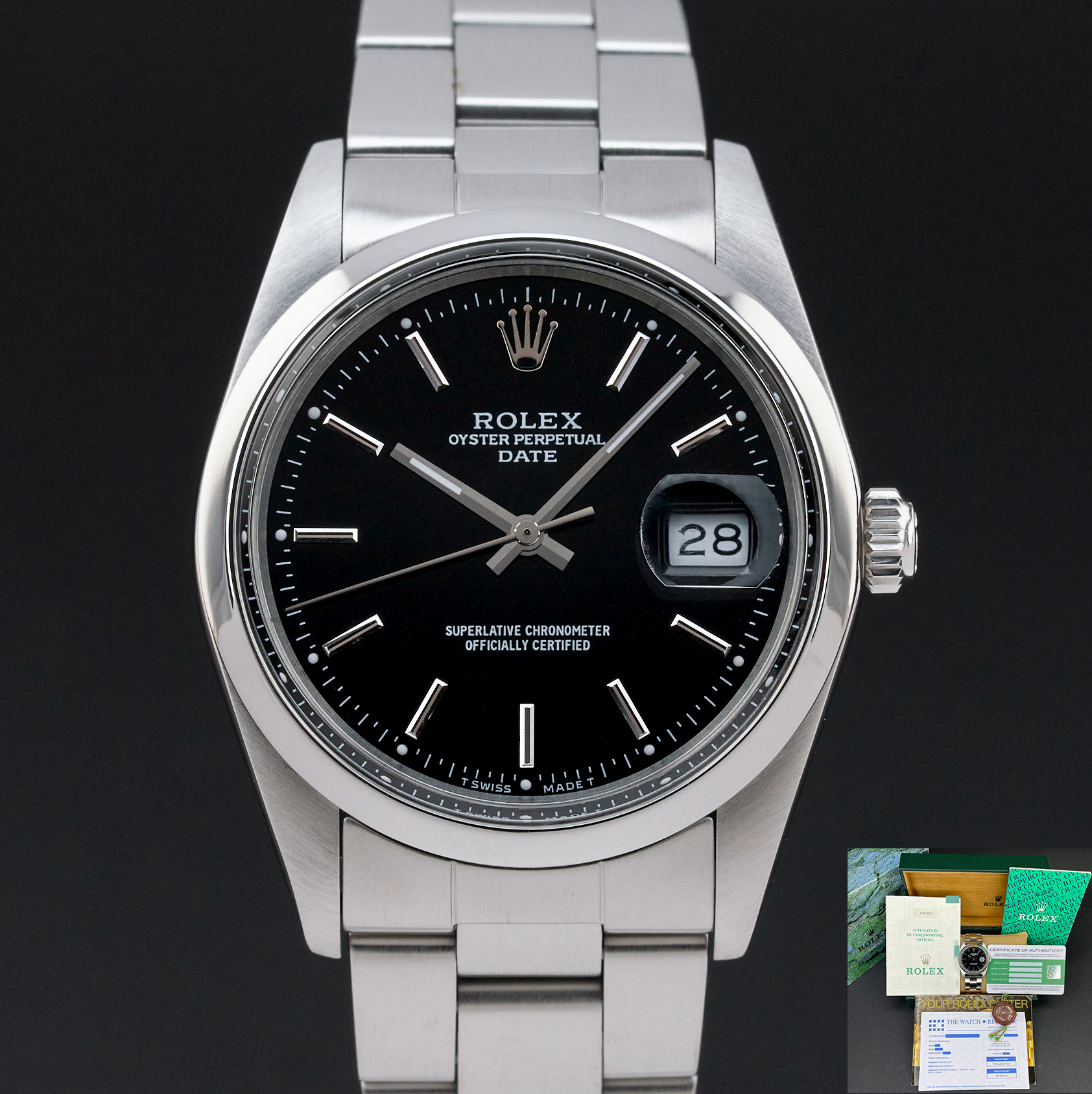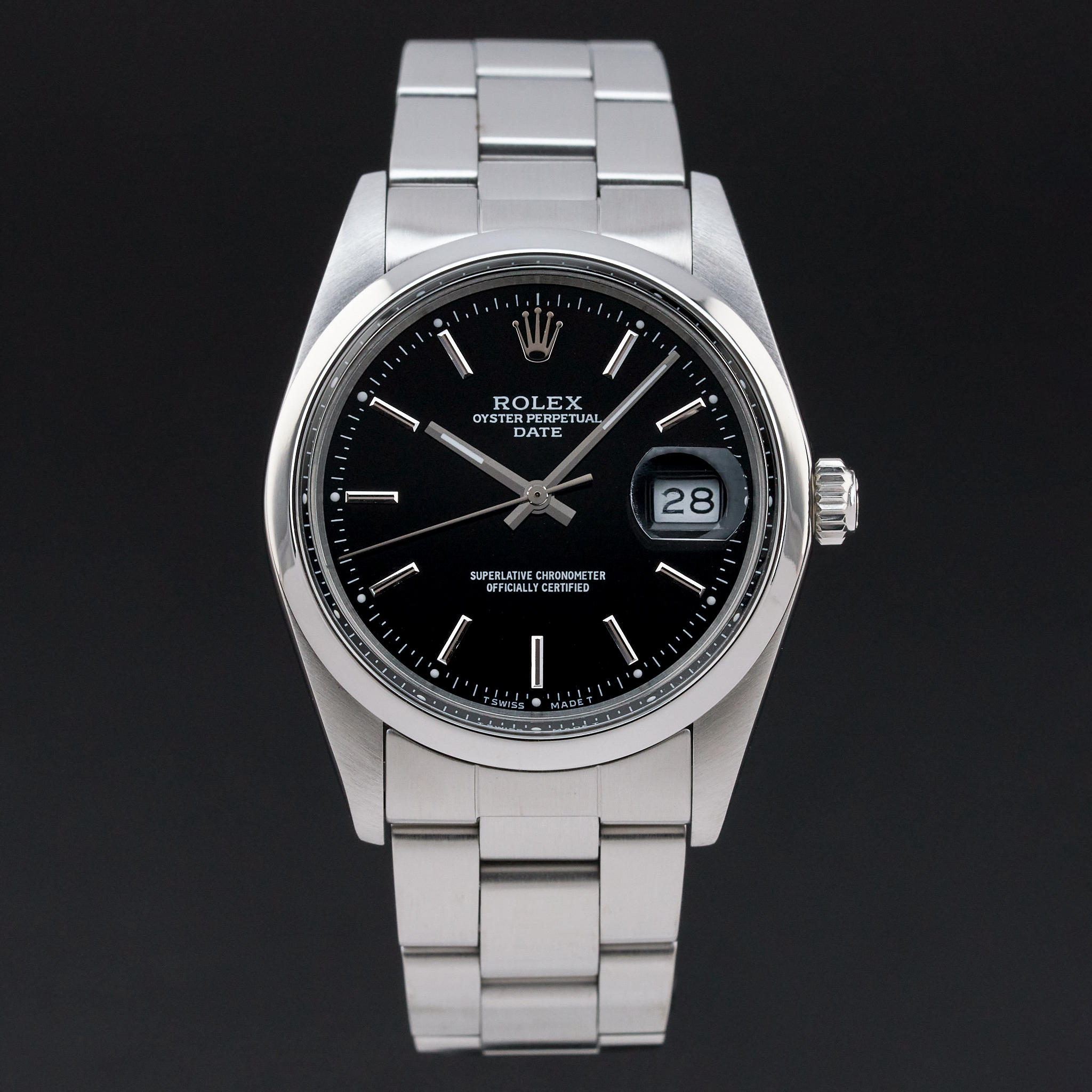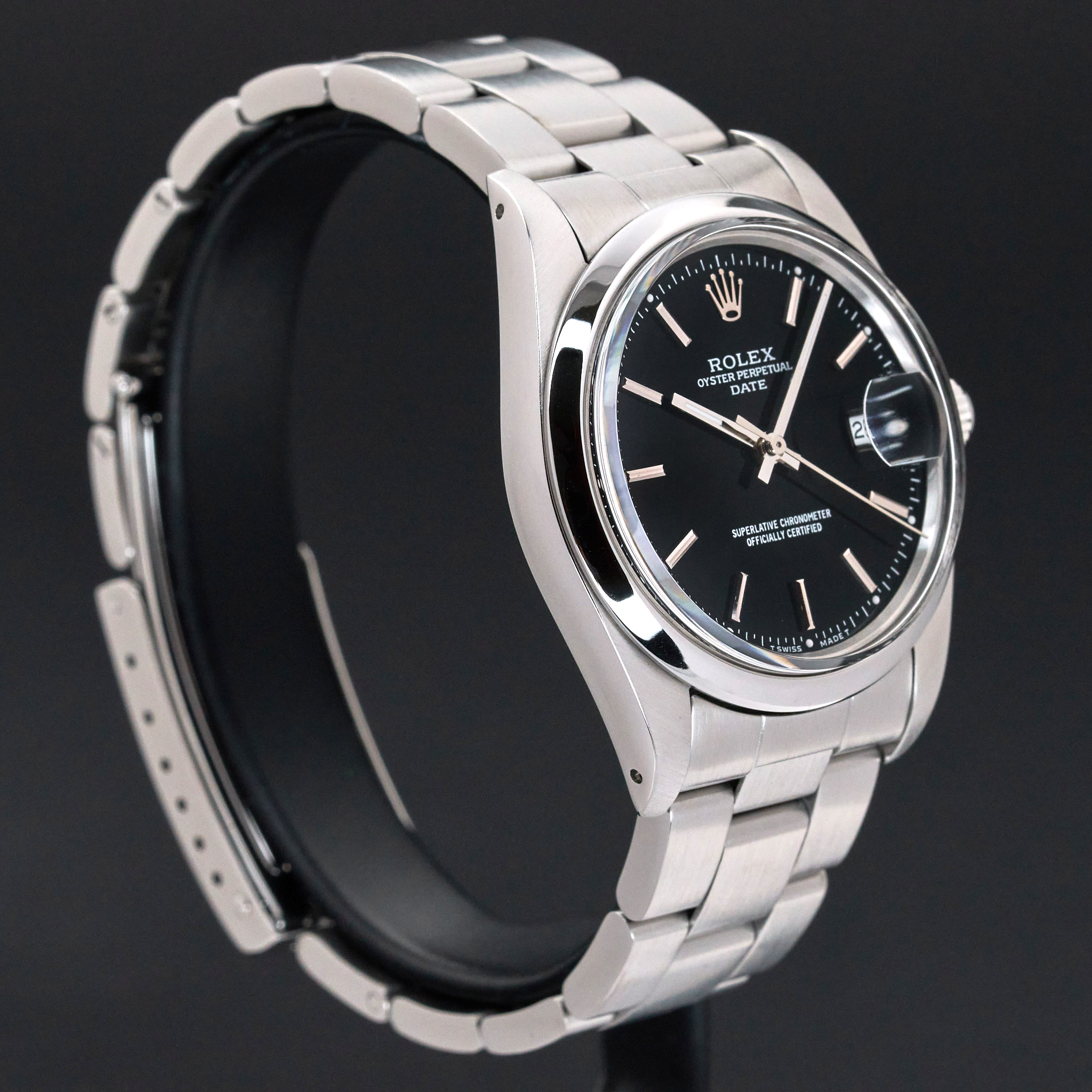 This Rolex Oyster Perpetual Date 15000 features a Black dial and is crafted from stainless steel, with a production year of 1988.