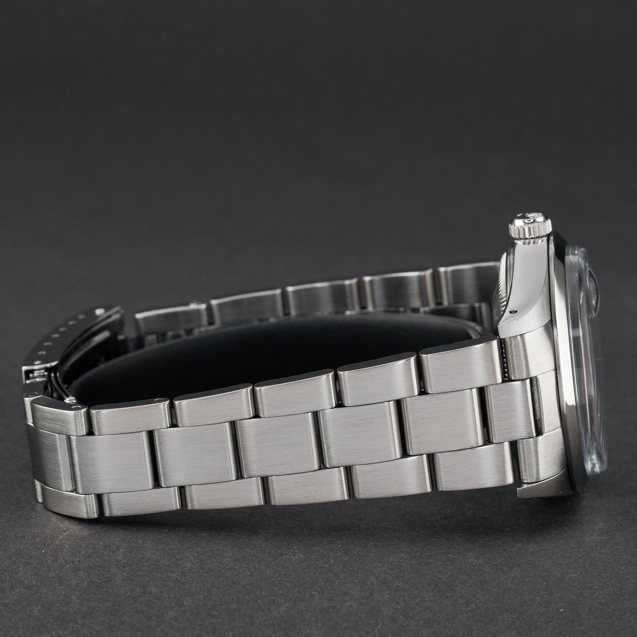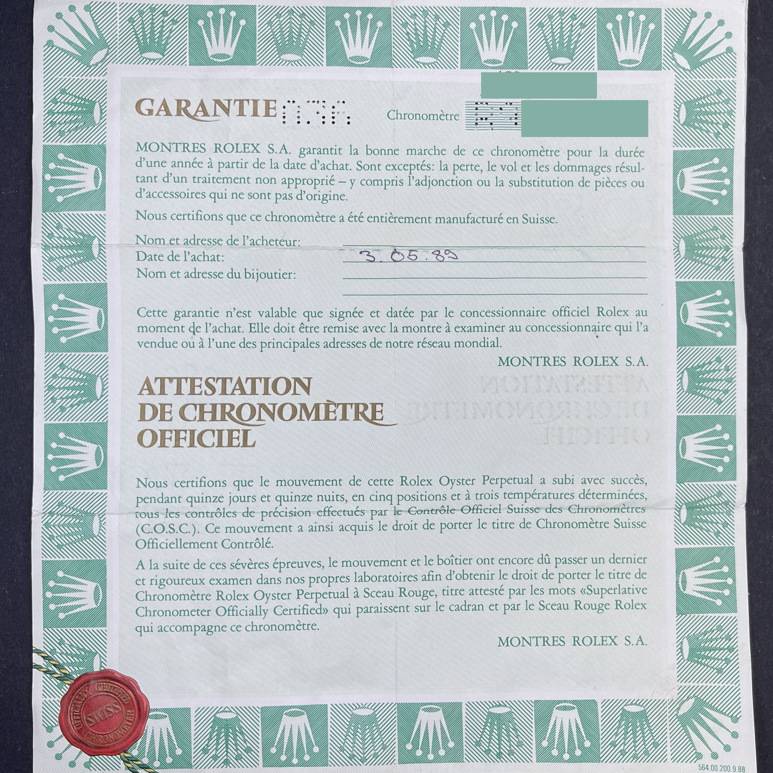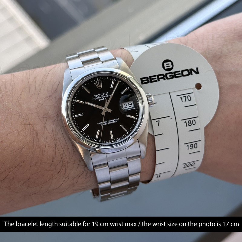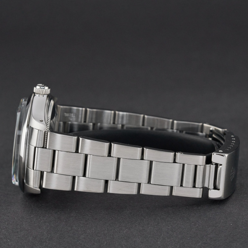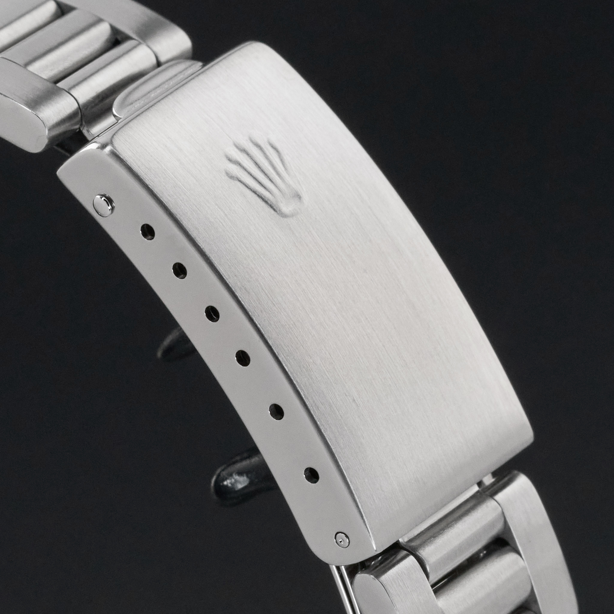 This Rolex Oyster Perpetual Date 15000 features a Black dial and is crafted from stainless steel, with a production year of 1988.