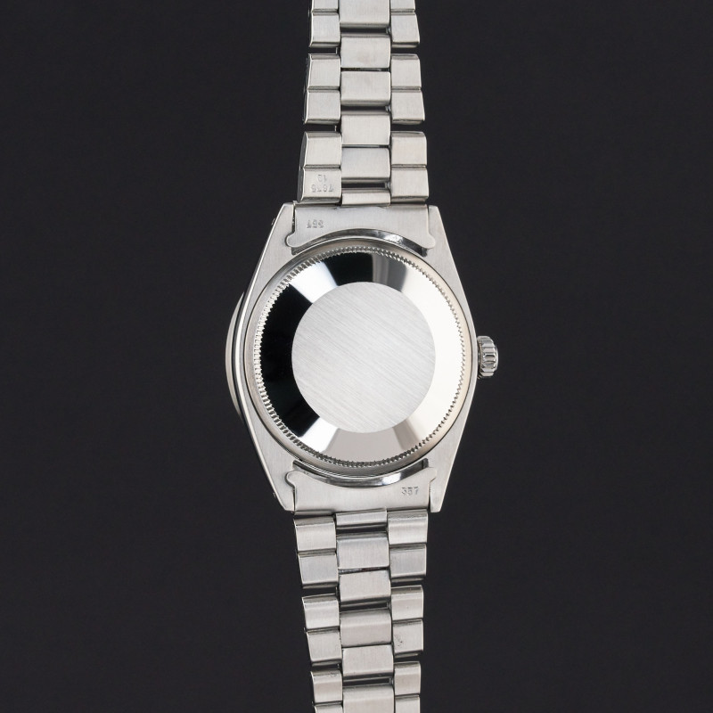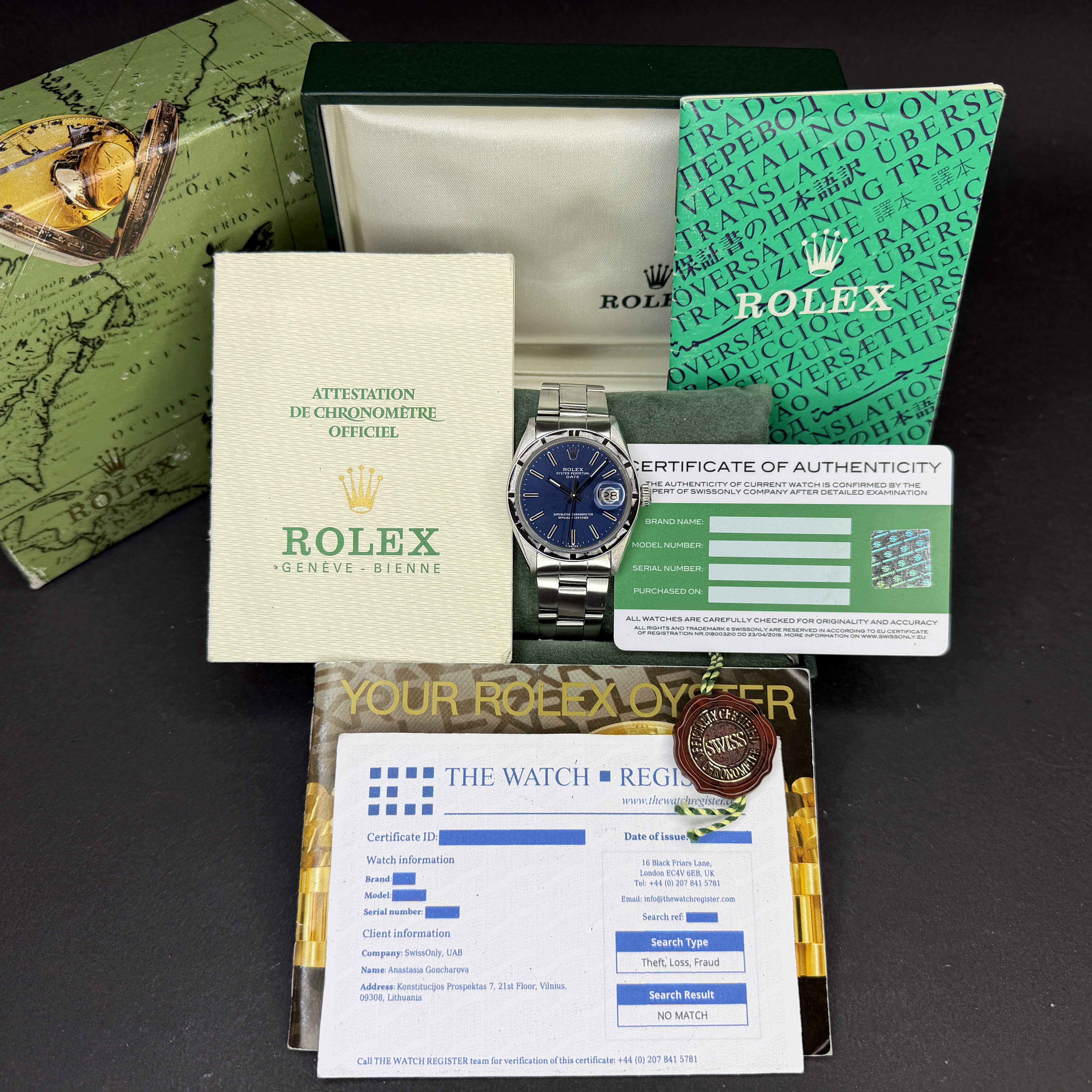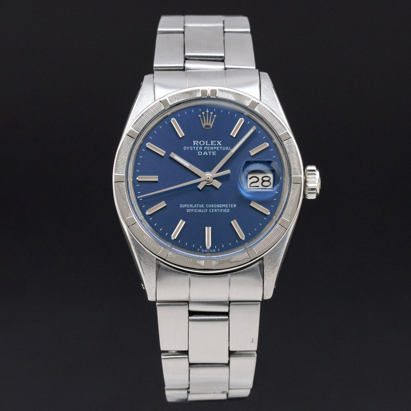 This Rolex Oyster Perpetual Date 1501 features a Blue dial and is crafted from stainless steel, with a production year of 1970.