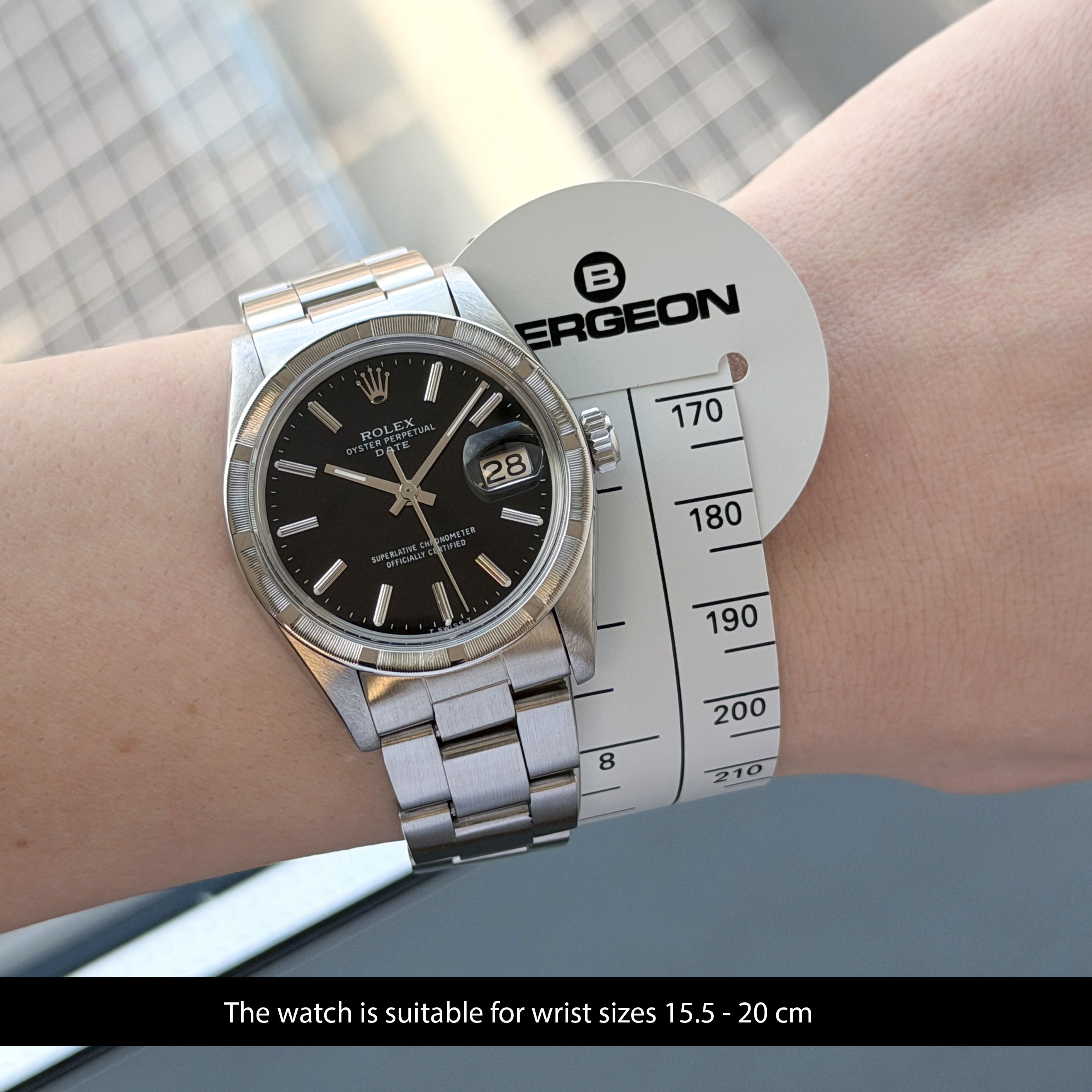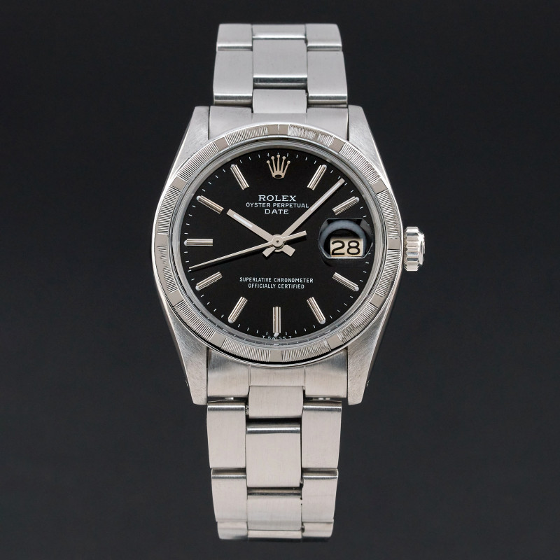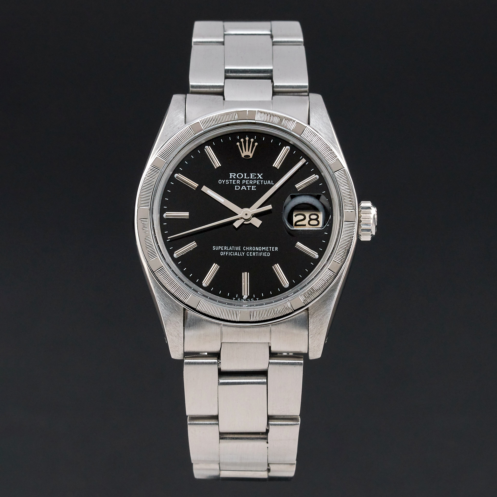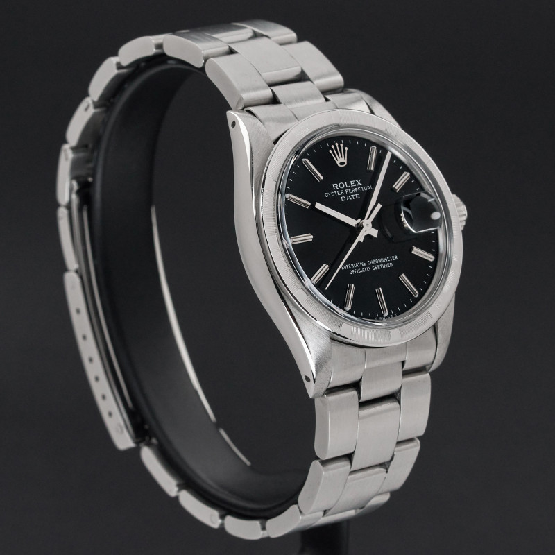 This Rolex Oyster Perpetual Date 1501 features a Black dial and is crafted from stainless steel, with a production year of 1980.