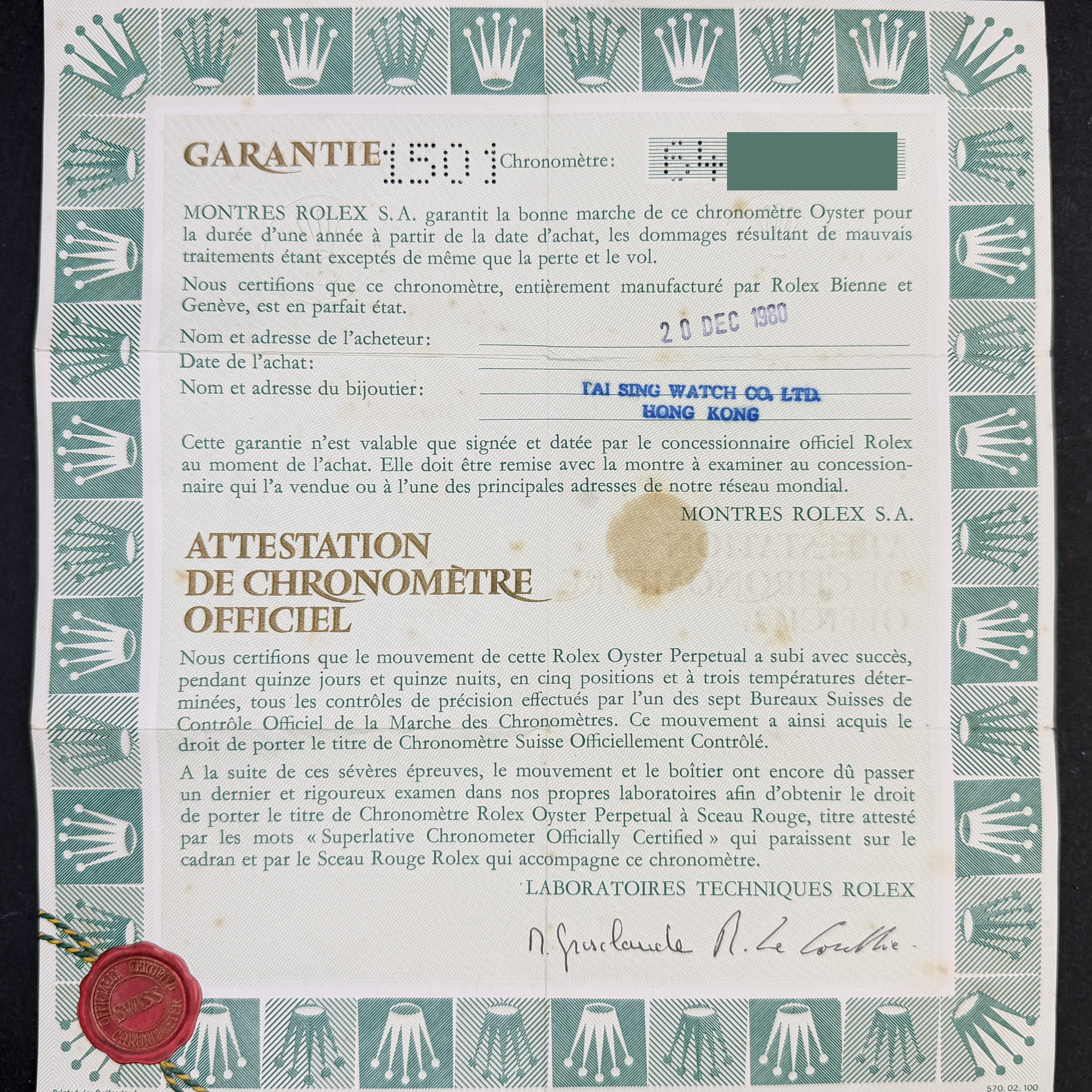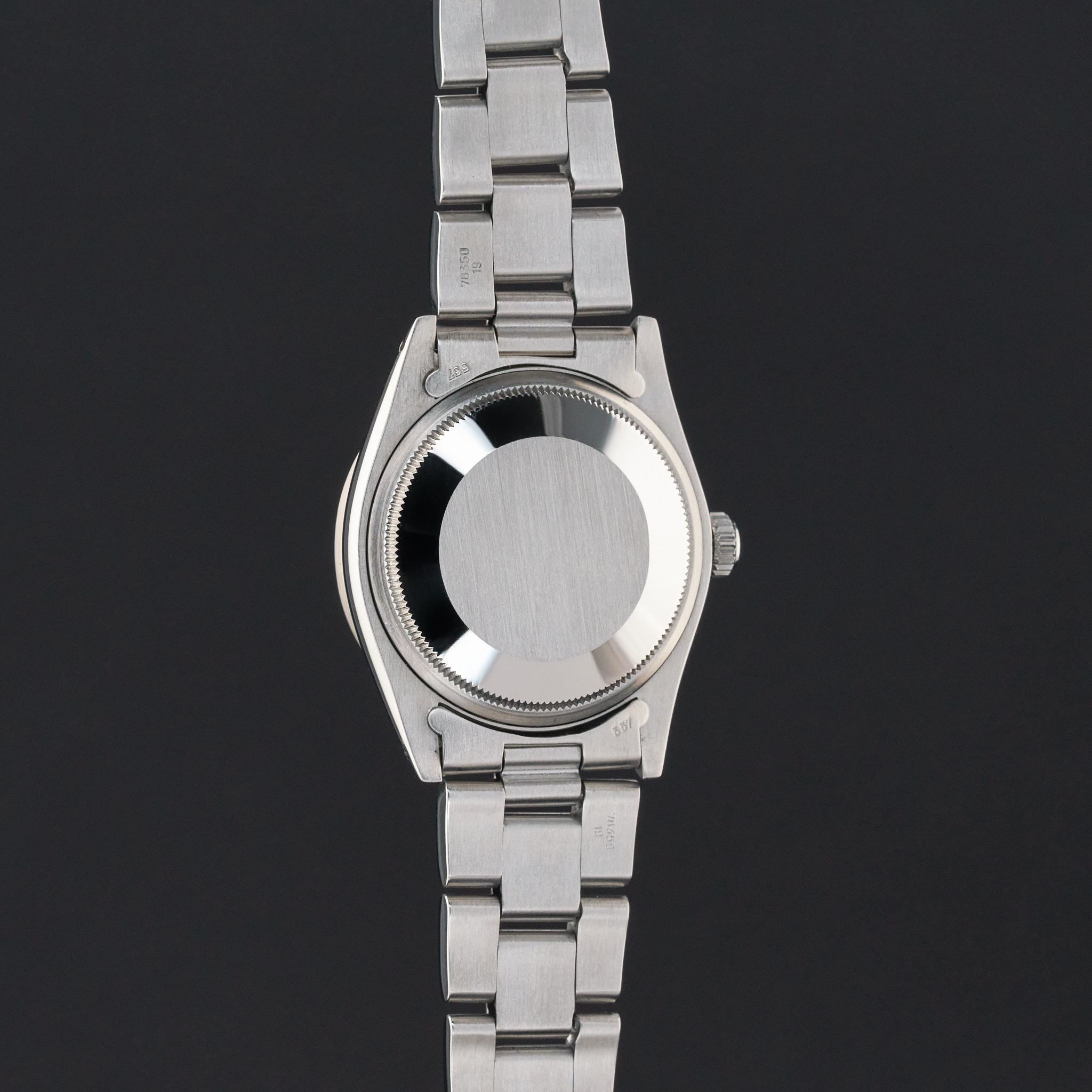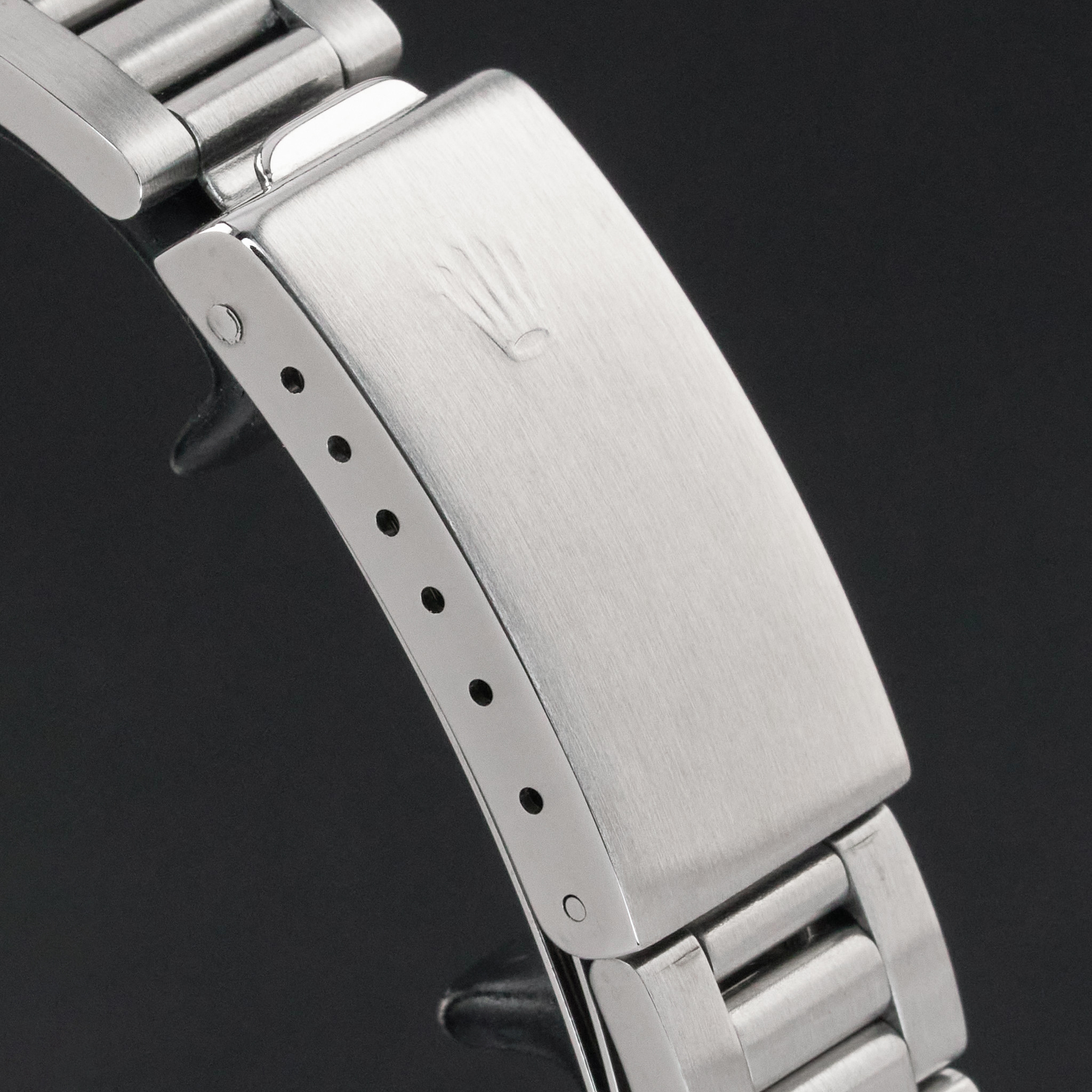 This Rolex Oyster Perpetual Date 1501 features a Black dial and is crafted from stainless steel, with a production year of 1980.