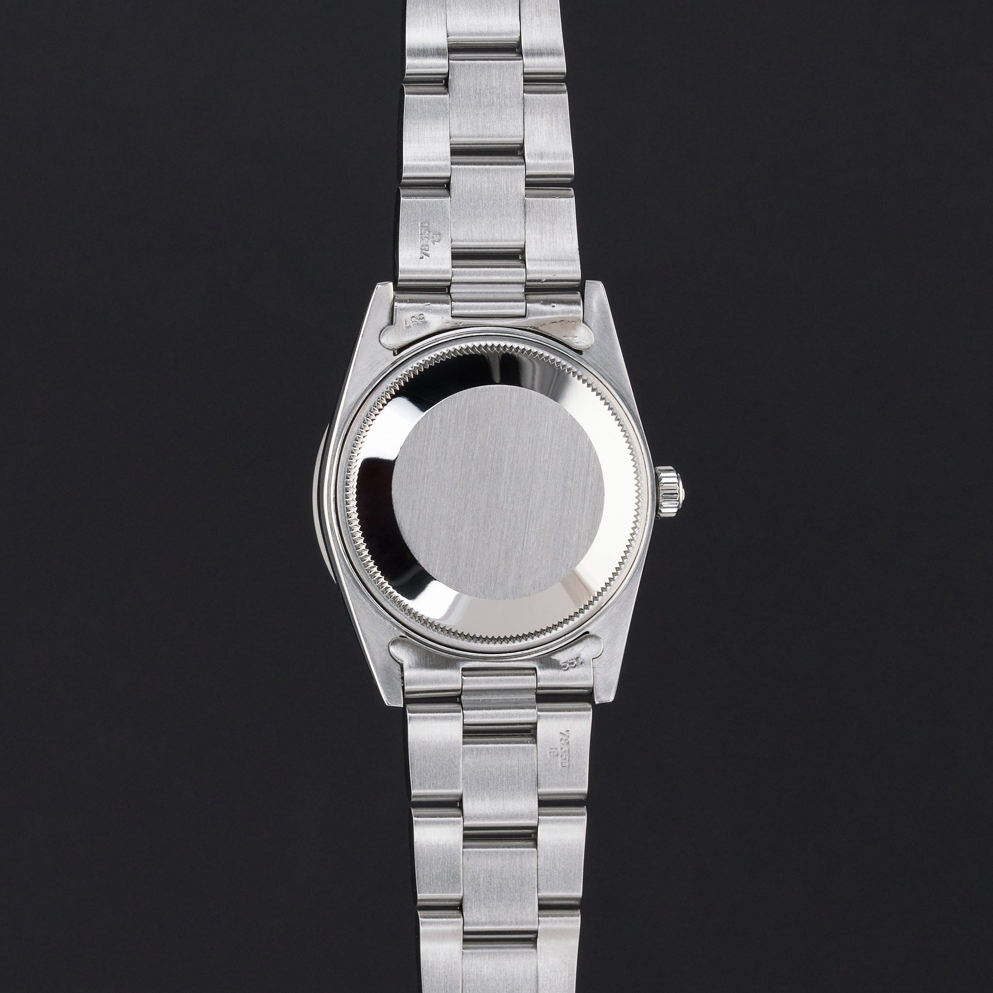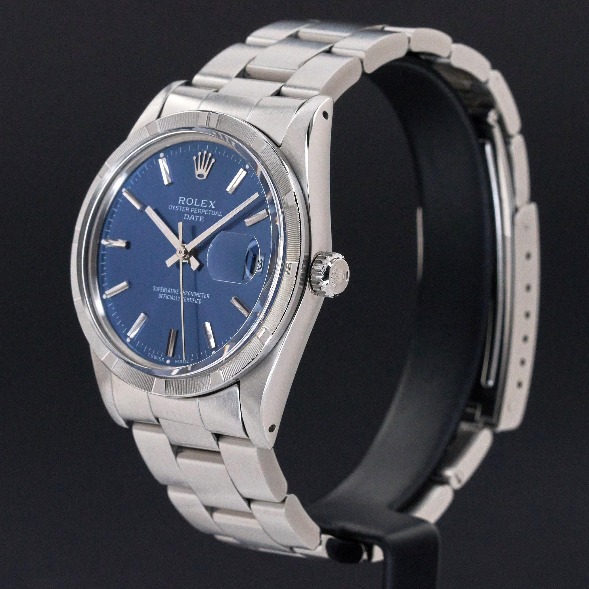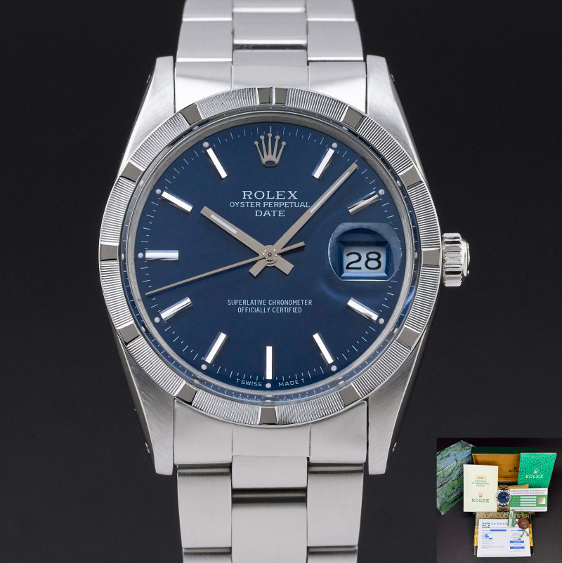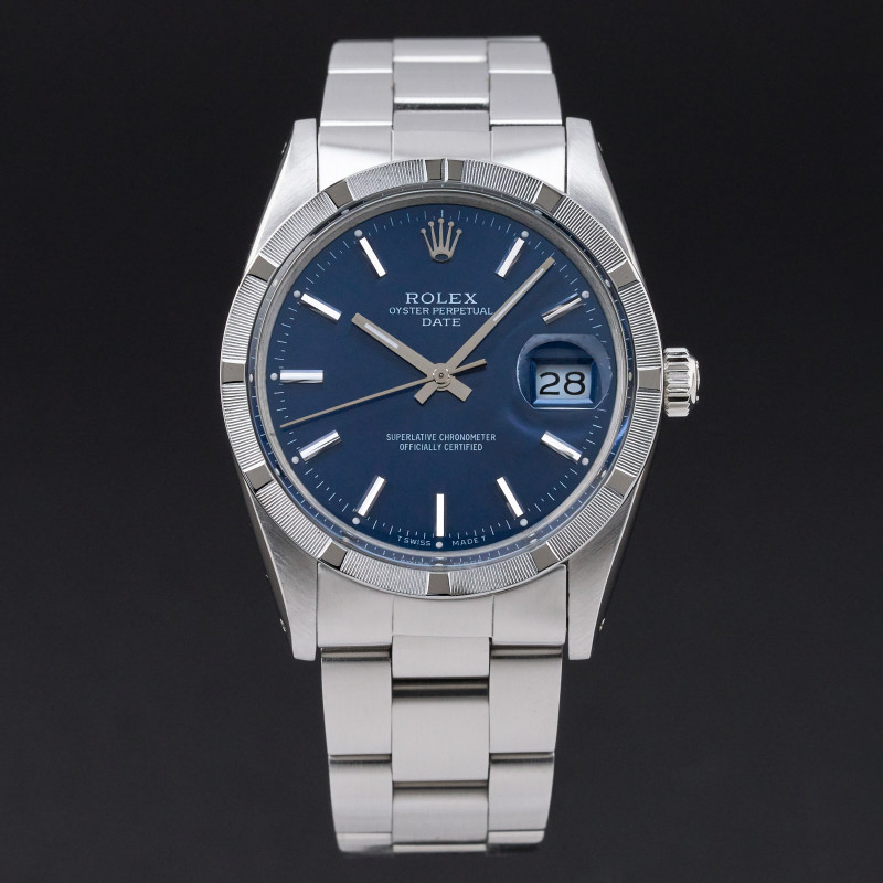 This Rolex Oyster Perpetual Date 15010 features a Blue dial and is crafted from stainless steel, with a production year of 1985.