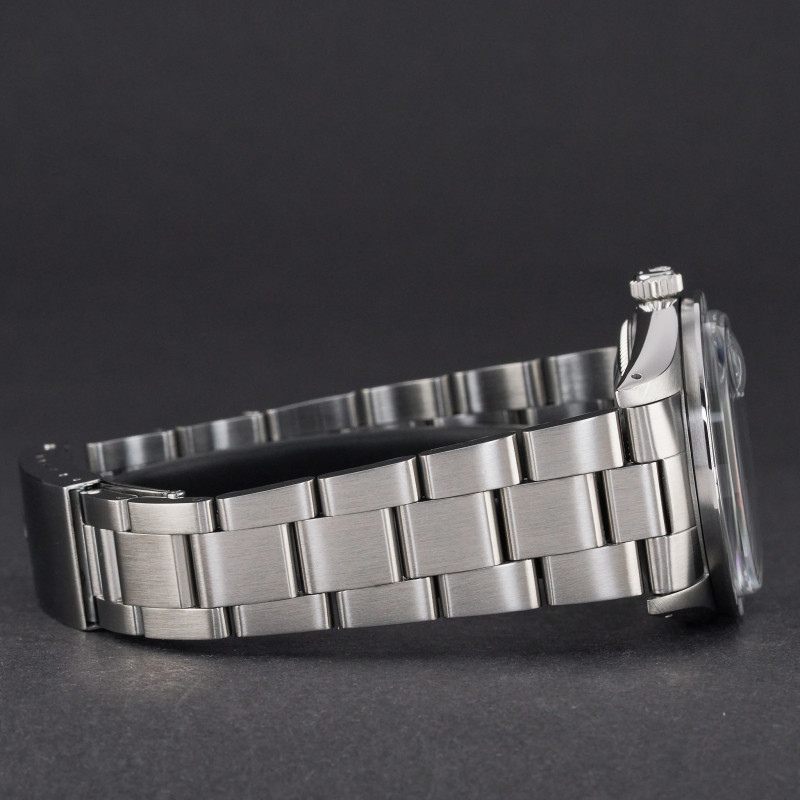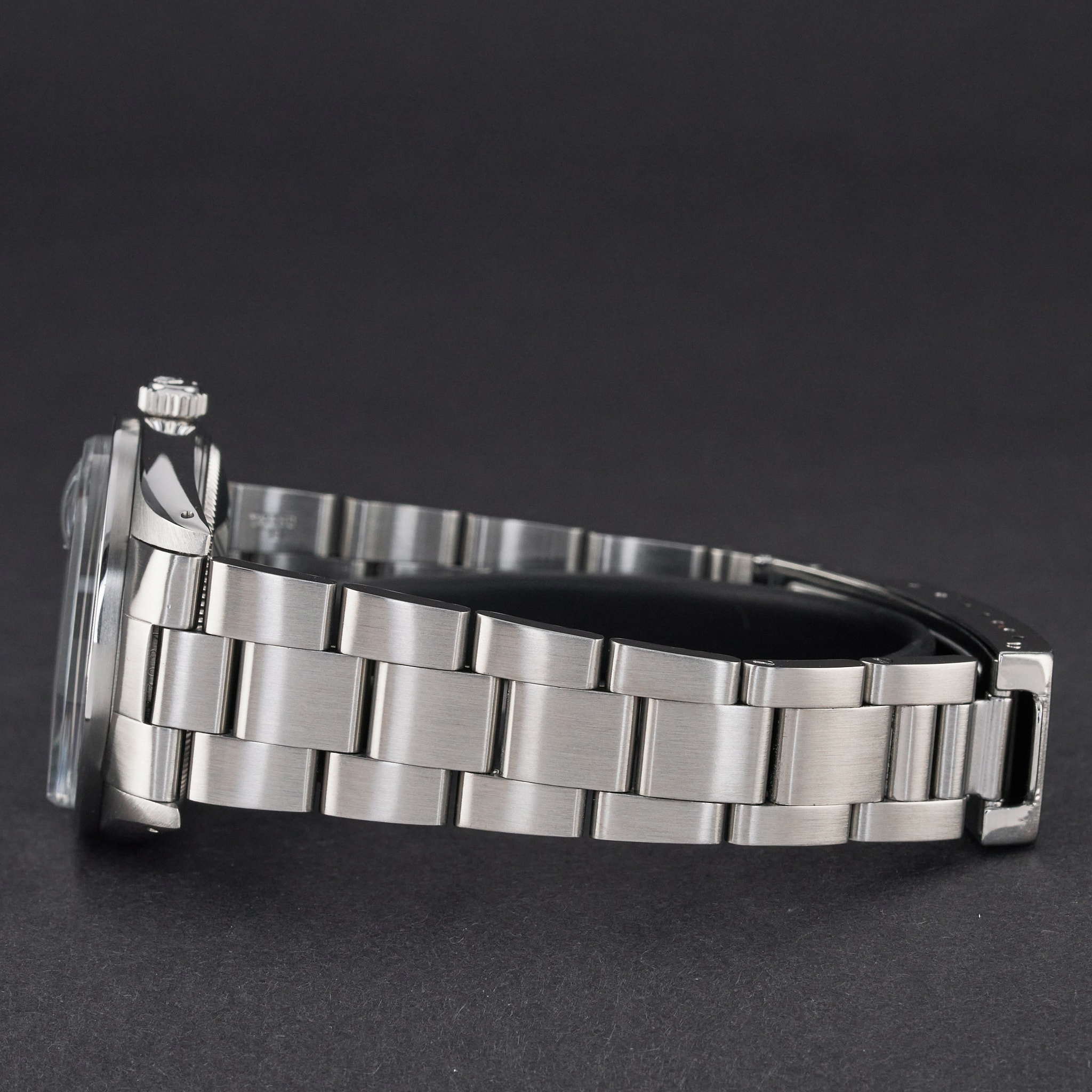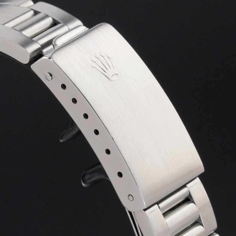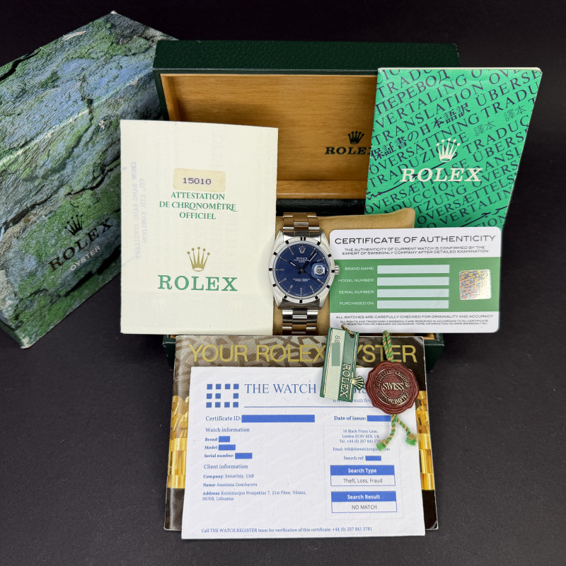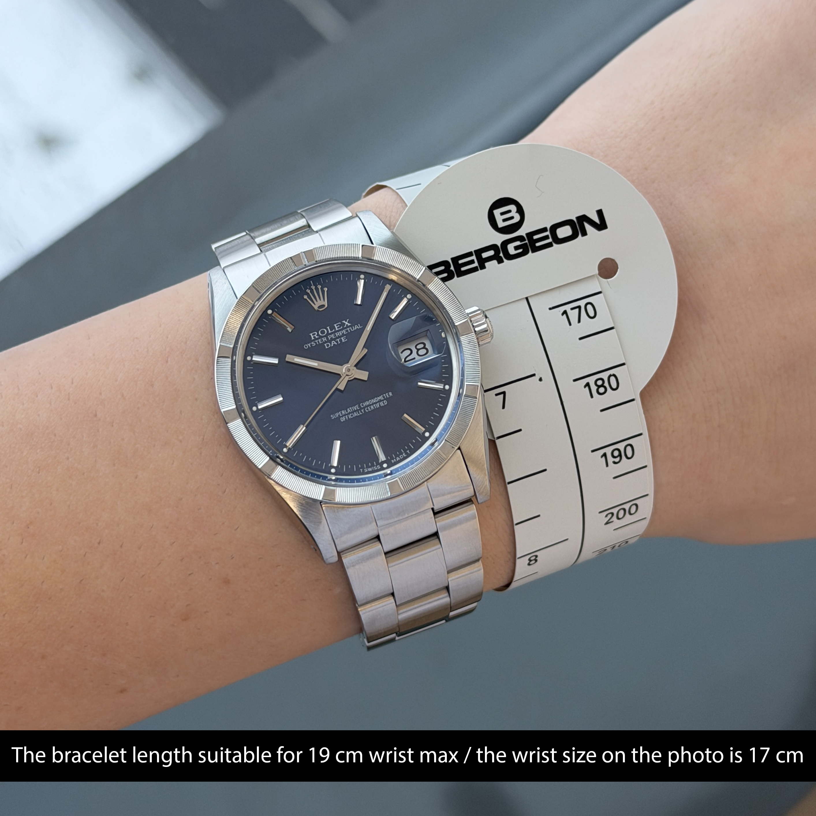 This Rolex Oyster Perpetual Date 15010 features a Blue dial and is crafted from stainless steel, with a production year of 1985.