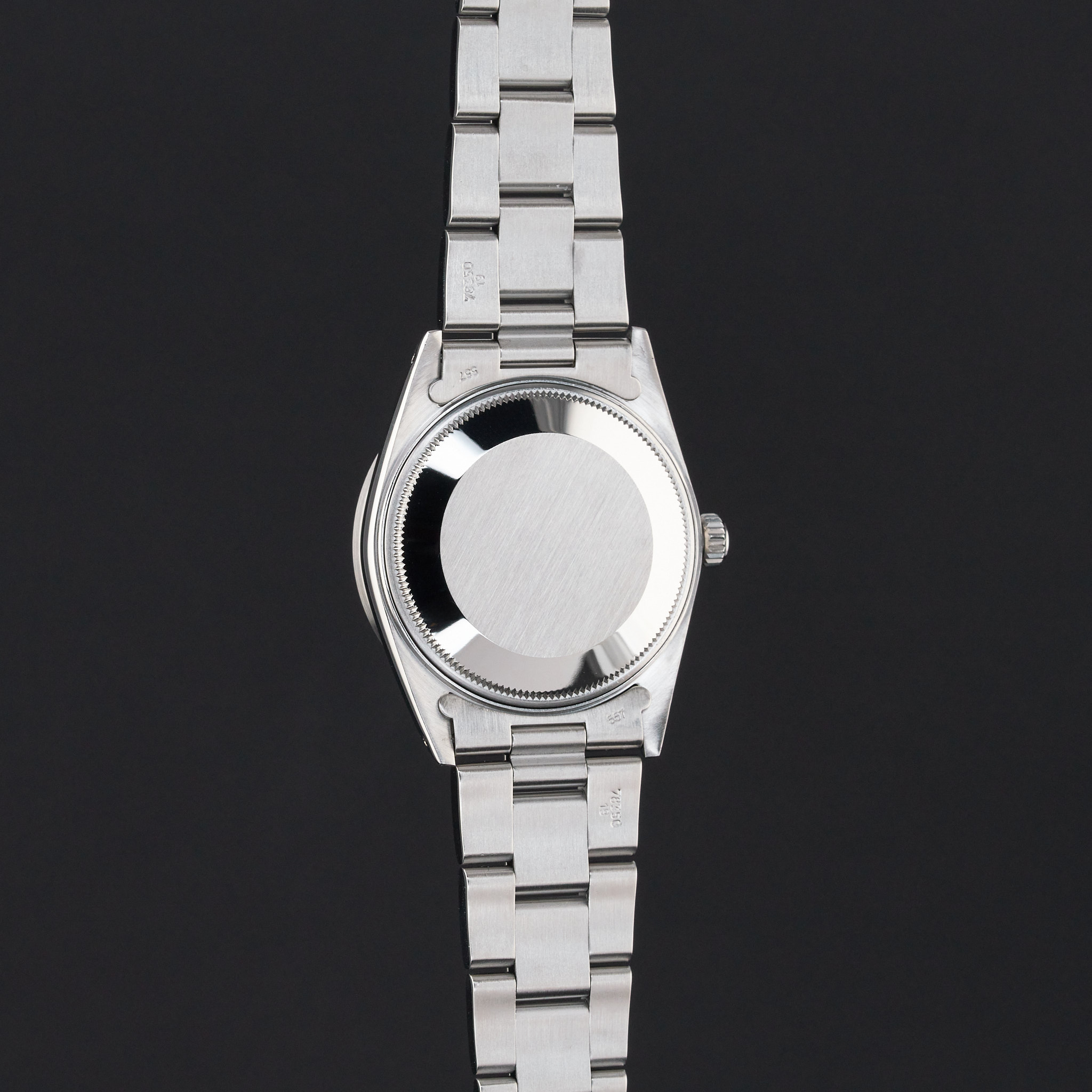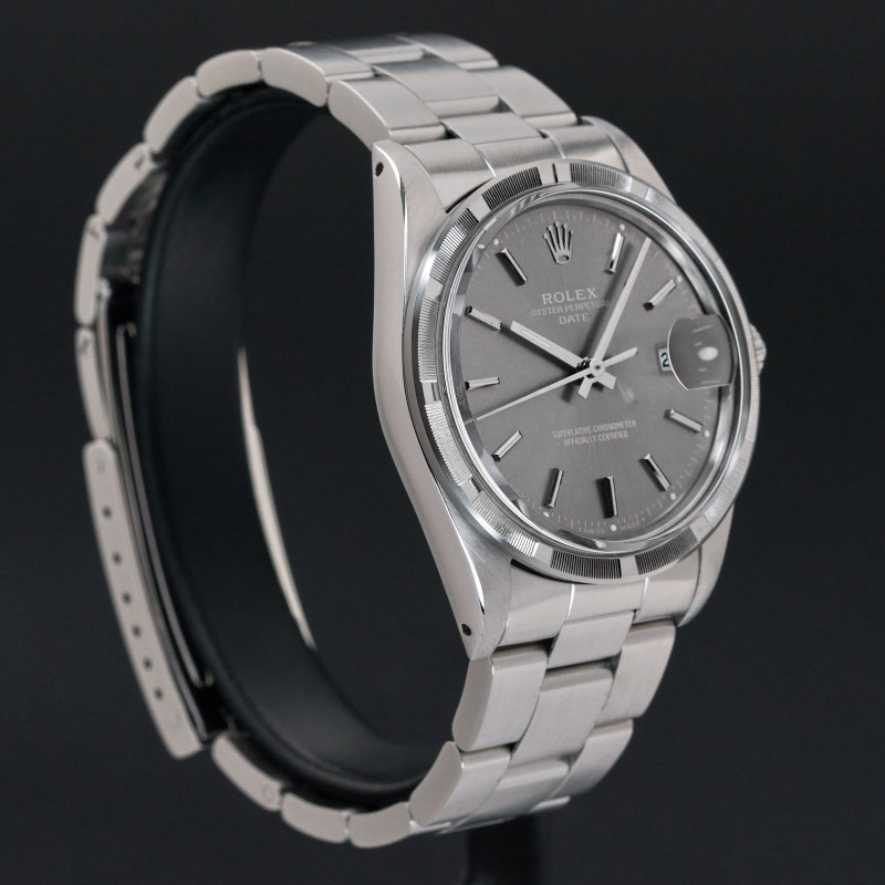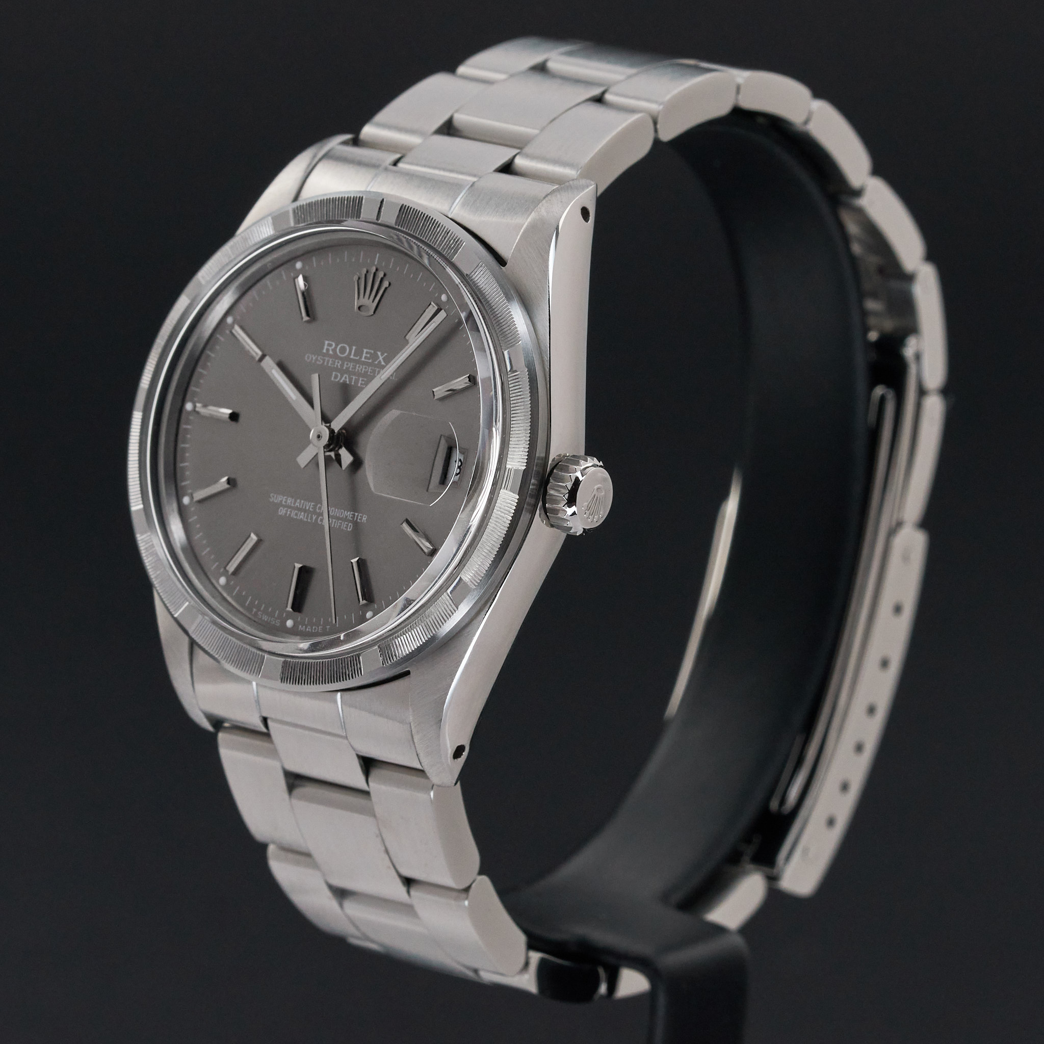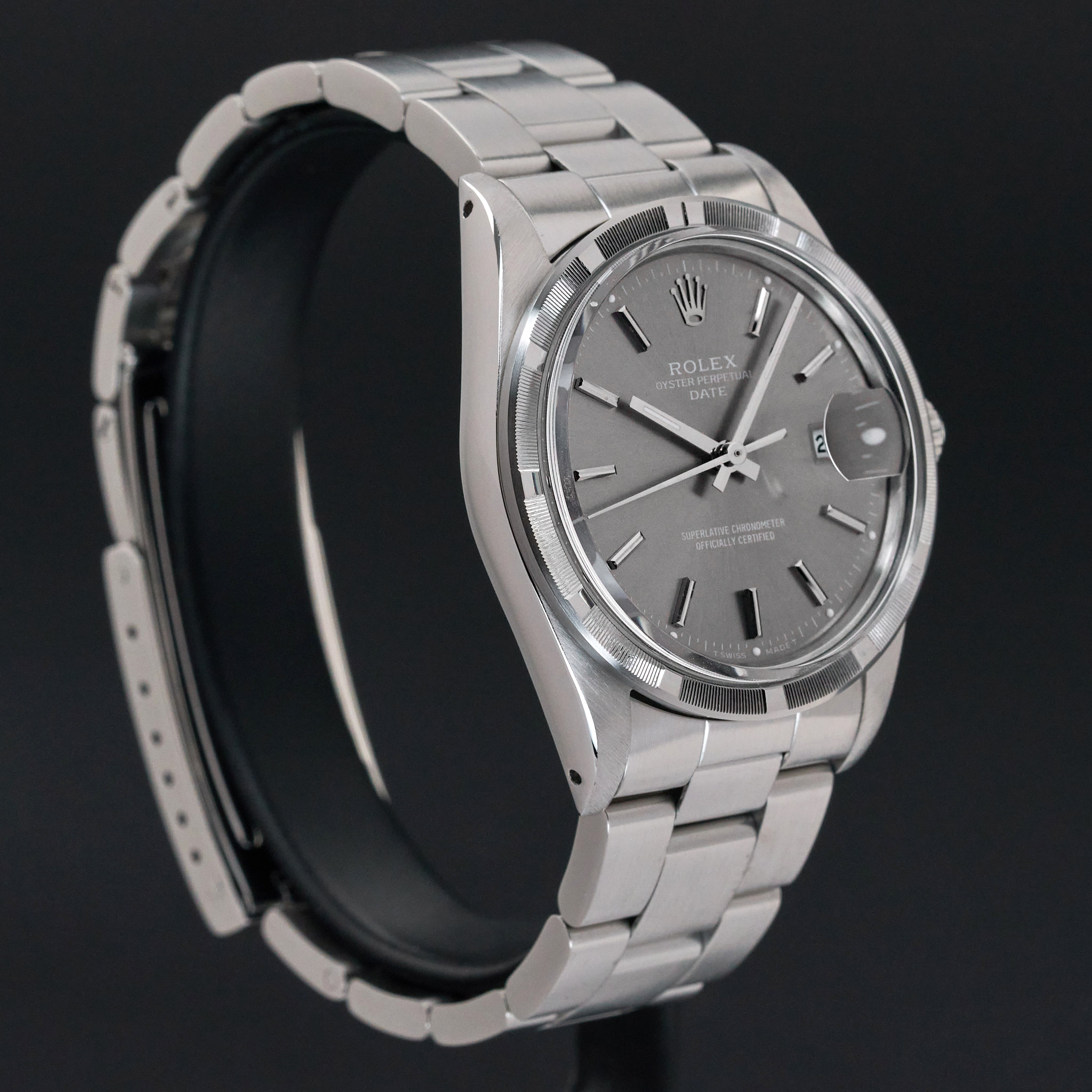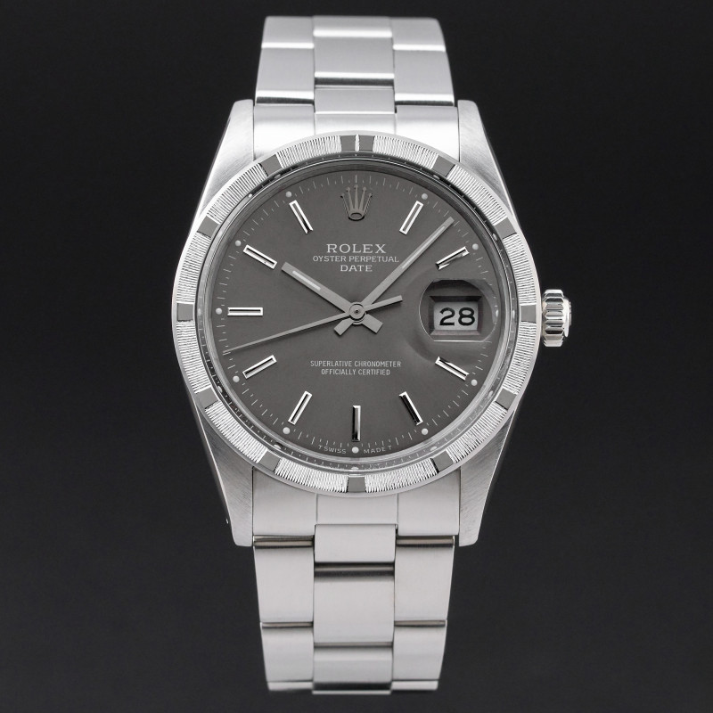 This Rolex Oyster Perpetual Date 15010 features a Grey dial and is crafted from stainless steel, with a production year of 1986.