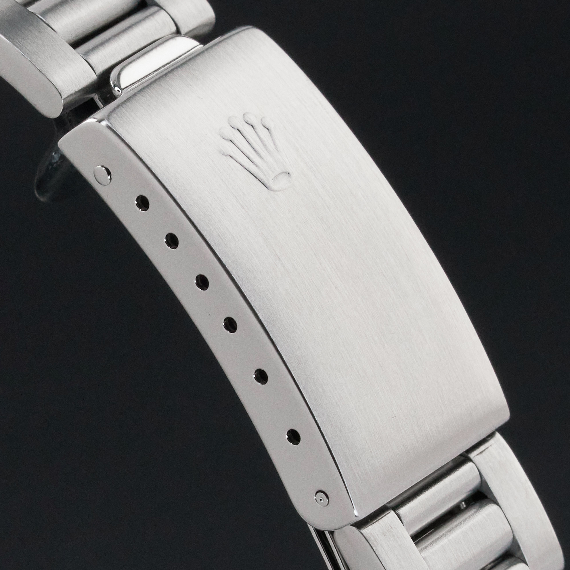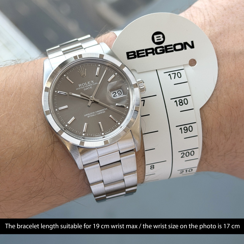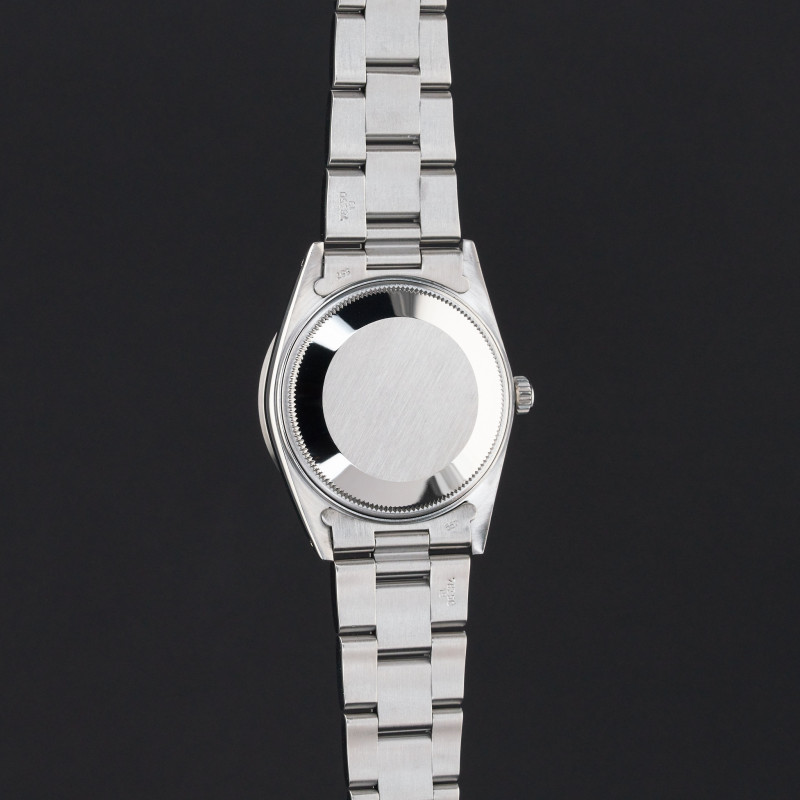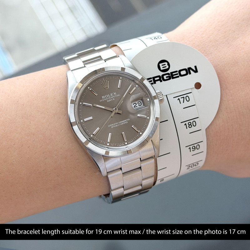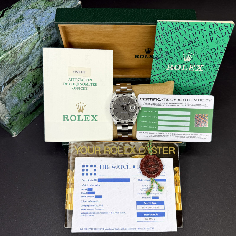 This Rolex Oyster Perpetual Date 15010 features a Grey dial and is crafted from stainless steel, with a production year of 1986.